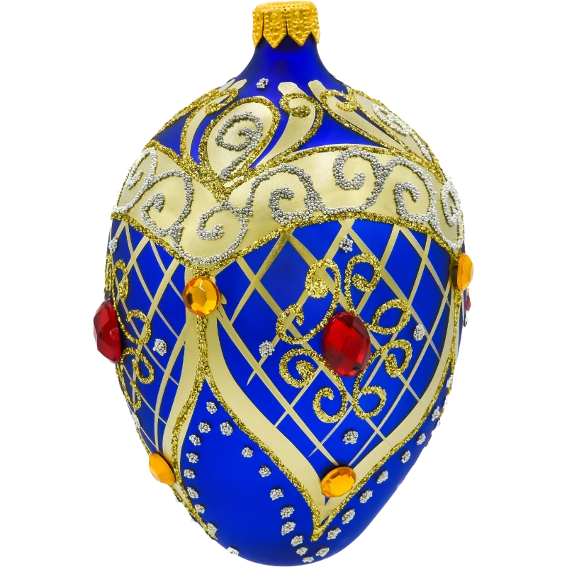 Bombka nawiązuje do stylu legendarnych jaj Fabergé, znanych z przepychu i kunsztownego wykonania. Połączenie głębokiego błękitu i złota nadaje jej wyjątkowego charakteru.