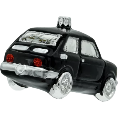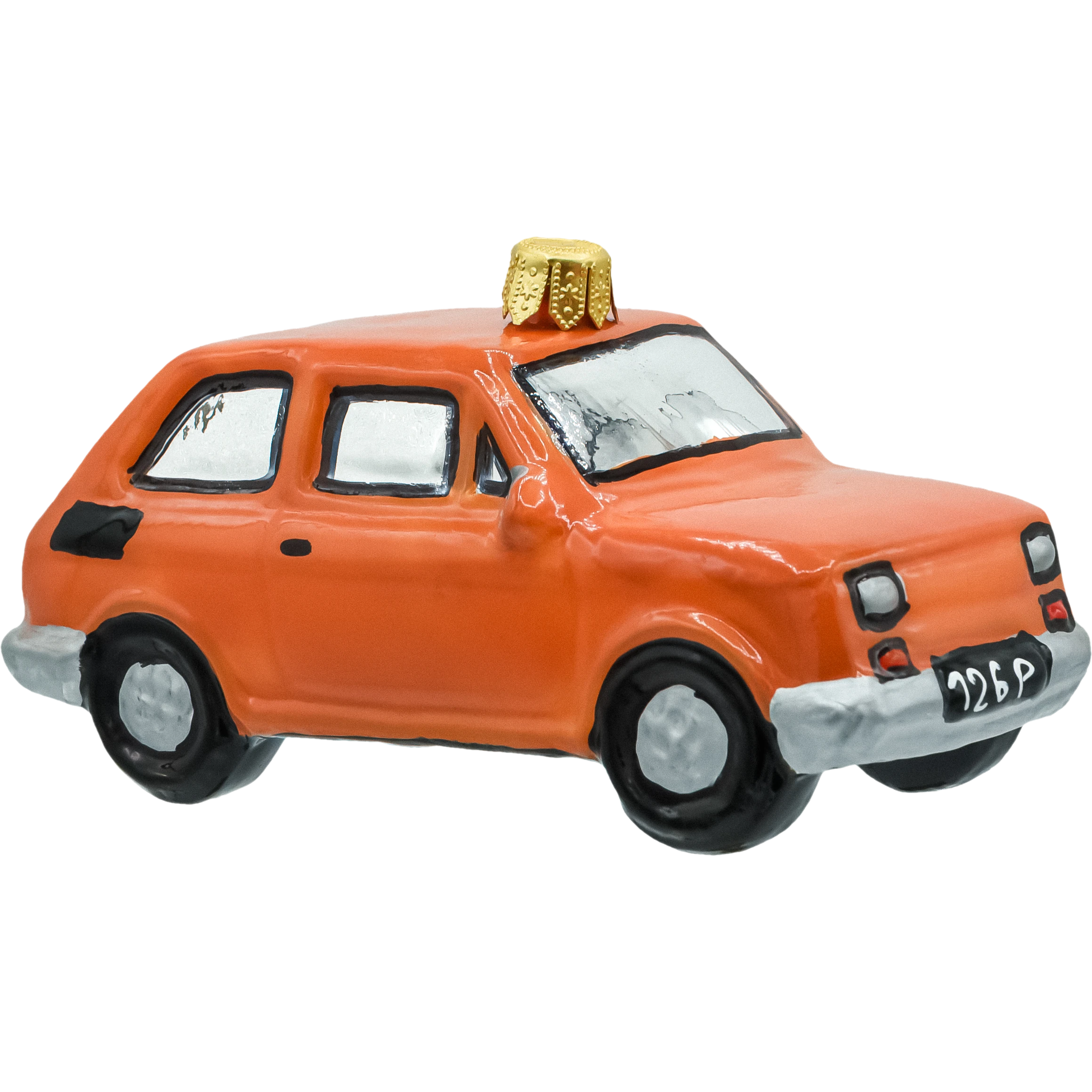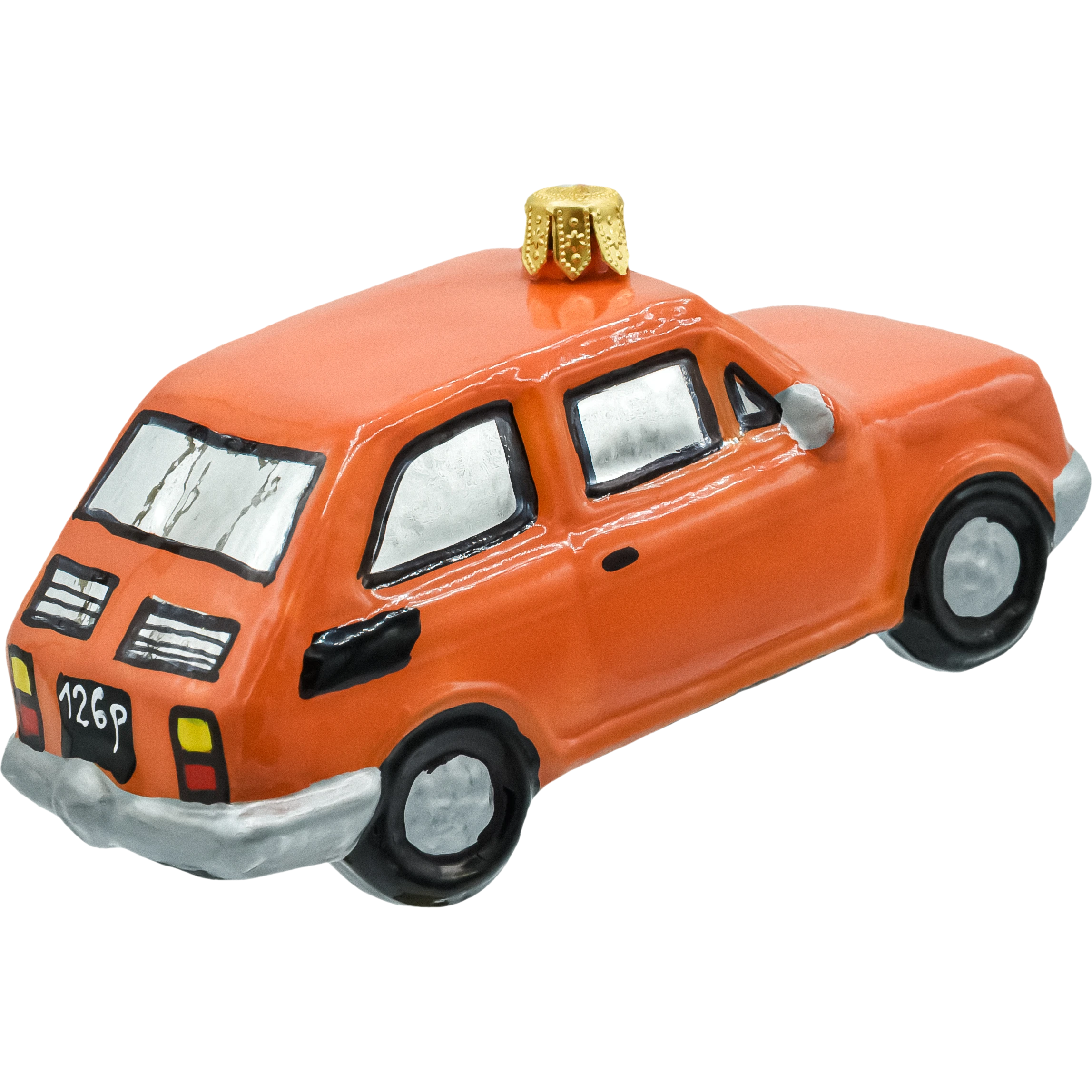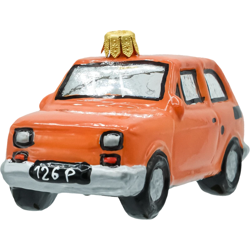 Ręcznie robiona szklana bombka choinkowa Fiat 126p „Maluch” – dmuchana ustnie, srebrzona od środka i misternie malowana w klimacie PRL. Idealna ozdoba retro na choinkę i świetny prezent dla fana motoryzacji oraz kolekcjonera polskich bombek.