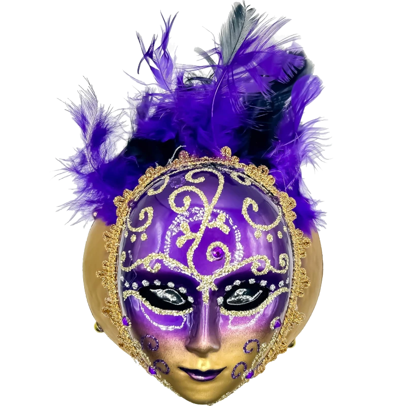 Ozdoba w kształcie weneckiej maski, zdobiona brokatowymi wzorami w kolorze złotym, które kontrastują z głębokim fioletem.