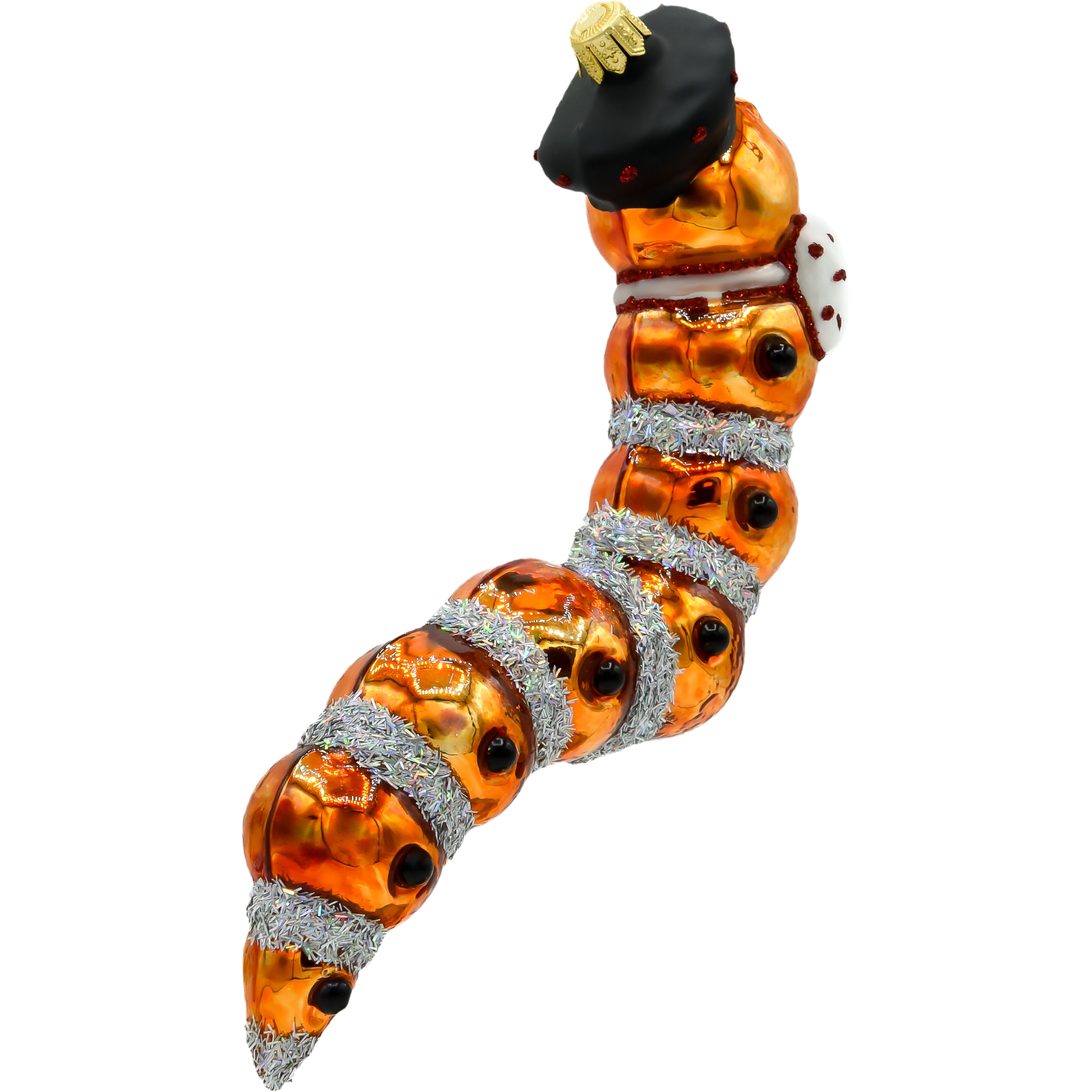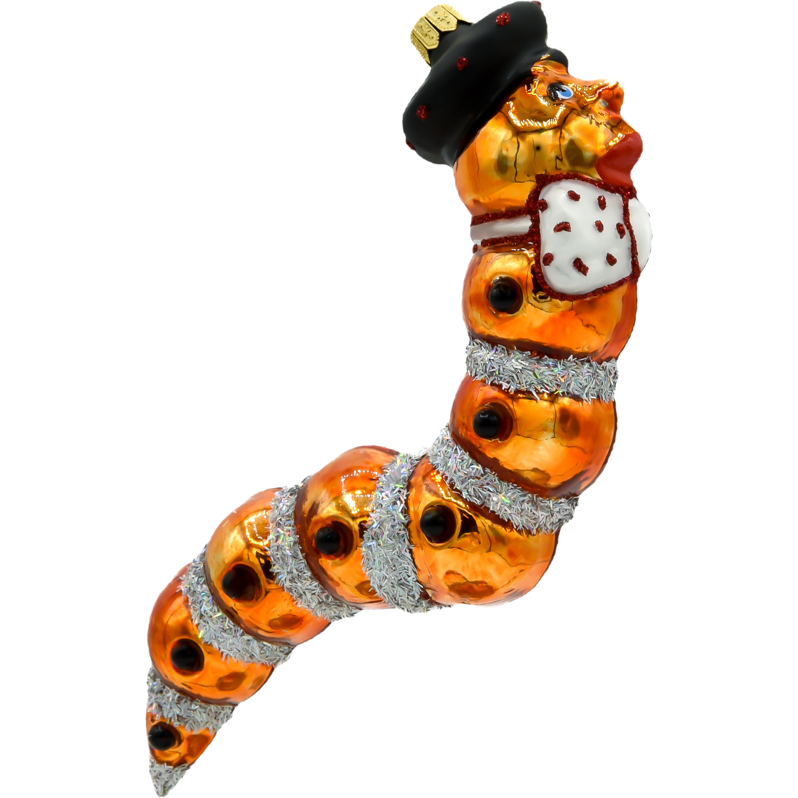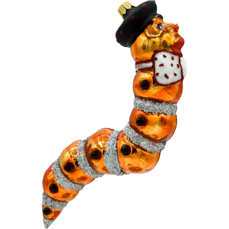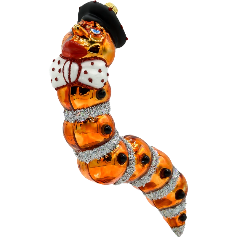 Unikalna bombka „Gąsienica z Kapeluszem” to prawdziwe arcydzieło wśród świątecznych ozdób. Wykonana z dmuchanego szkła i ręcznie zdobiona, wyróżnia się niepowtarzalnym designem i oryginalną kolorystyką. Ta nietypowa dekoracja choinkowa zachwyca swoją szczegółowością i dbałością o detale, co czyni ją wyjątkowym elementem każdego świątecznego drzewka.