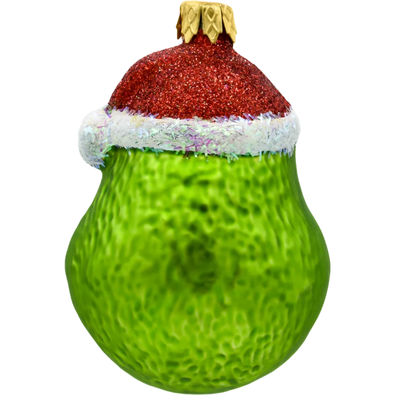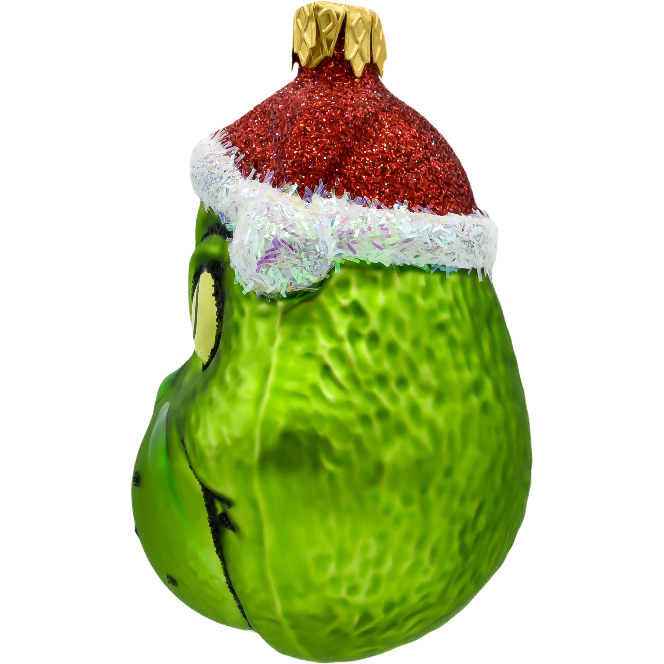 Szklana bombka choinkowa inspirowana postacią Grinch – ręcznie malowana figurka z czapką Mikołaja. Oryginalna dekoracja świąteczna z motywem popkulturowym. Idealna na prezent i choinkę!