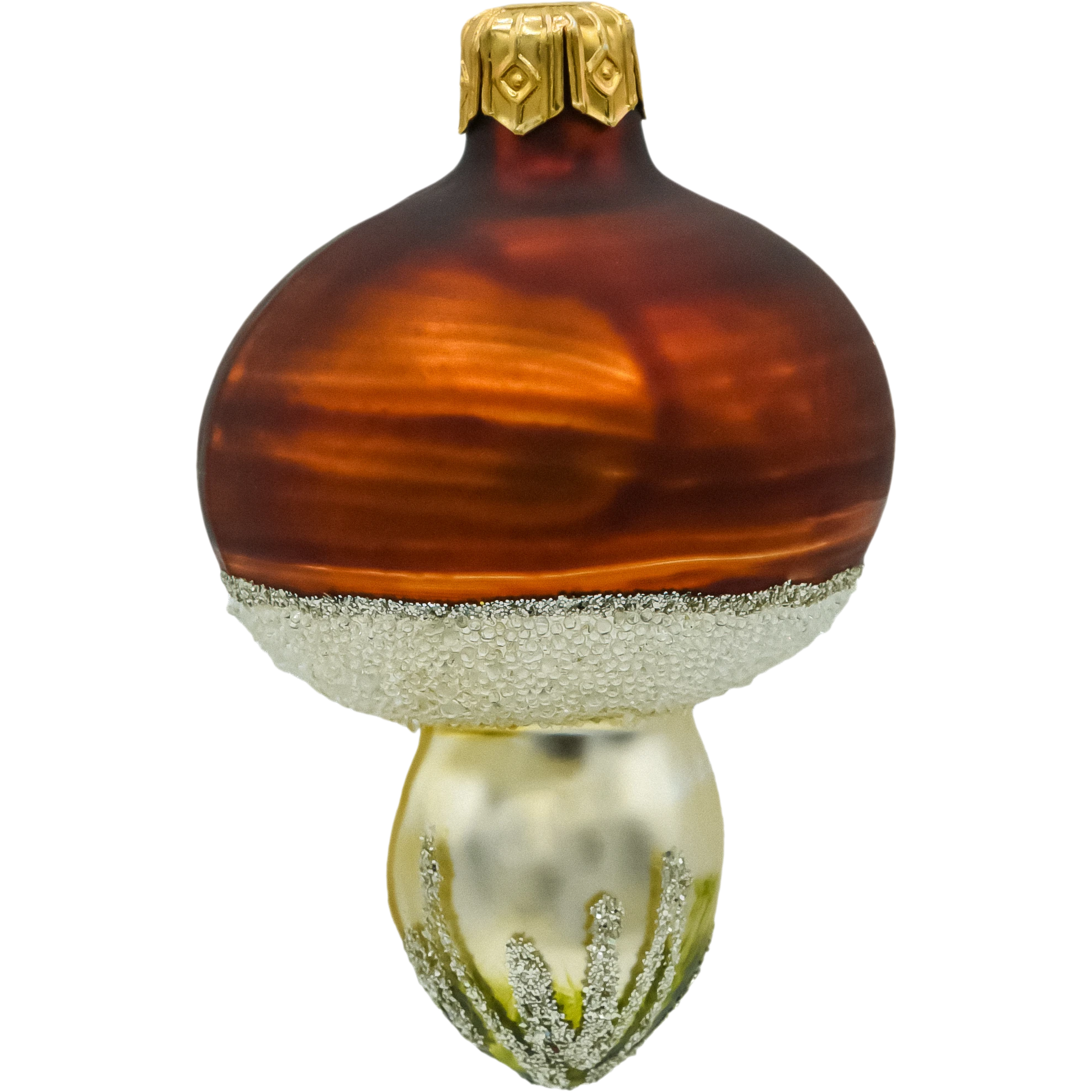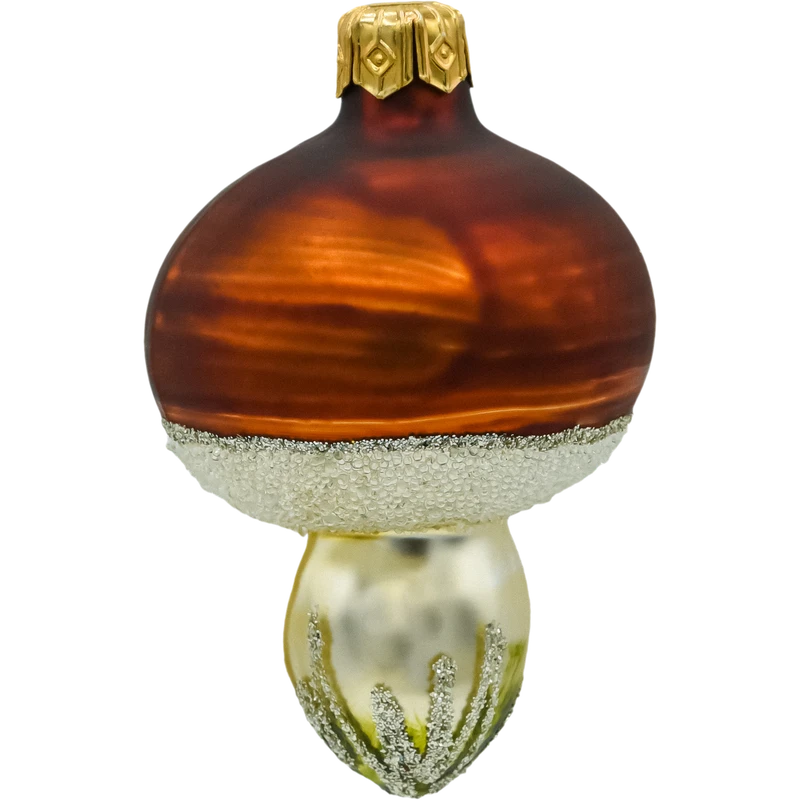 Kapelusz grzyba został pokryty intensywnym, brązowo-kasztanowym brokatem, który pięknie odbija światło choinkowych lampek. Delikatne przejście w stronę brokatowego białego pierścienia przy podstawie kapelusza nadaje bombce subtelnego efektu oszronienia. Trzonek, utrzymany w ciepłym odcieniu złamanej bieli z malowanym motywem zielonego mchu i srebrnego brokatu, dopełnia kompozycji inspirowanej naturą i zimowym lasem.