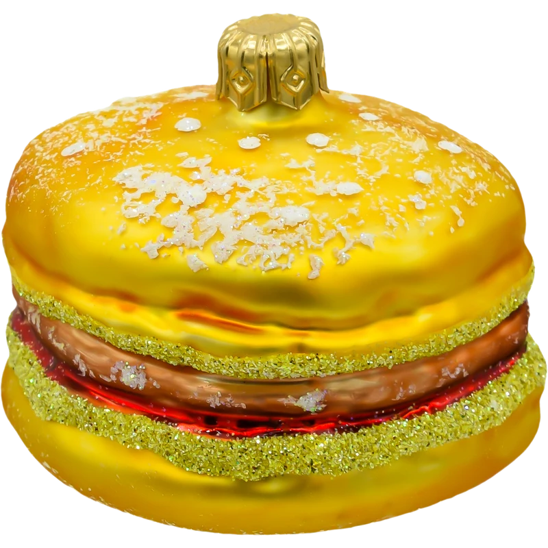 Ręcznie wykonana ze szkła dmuchanego, bombka zachwyca bogactwem kolorów i detali: soczysta bułka w odcieniu złocistego brązu posypana „sezamem”, a w środku warstwy przypominające mięso, warzywa i sos, podkreślone błyszczącym brokatem. Całość została wykończona z dbałością o każdy szczegół, co nadaje bombce niepowtarzalny, realistyczny wygląd.