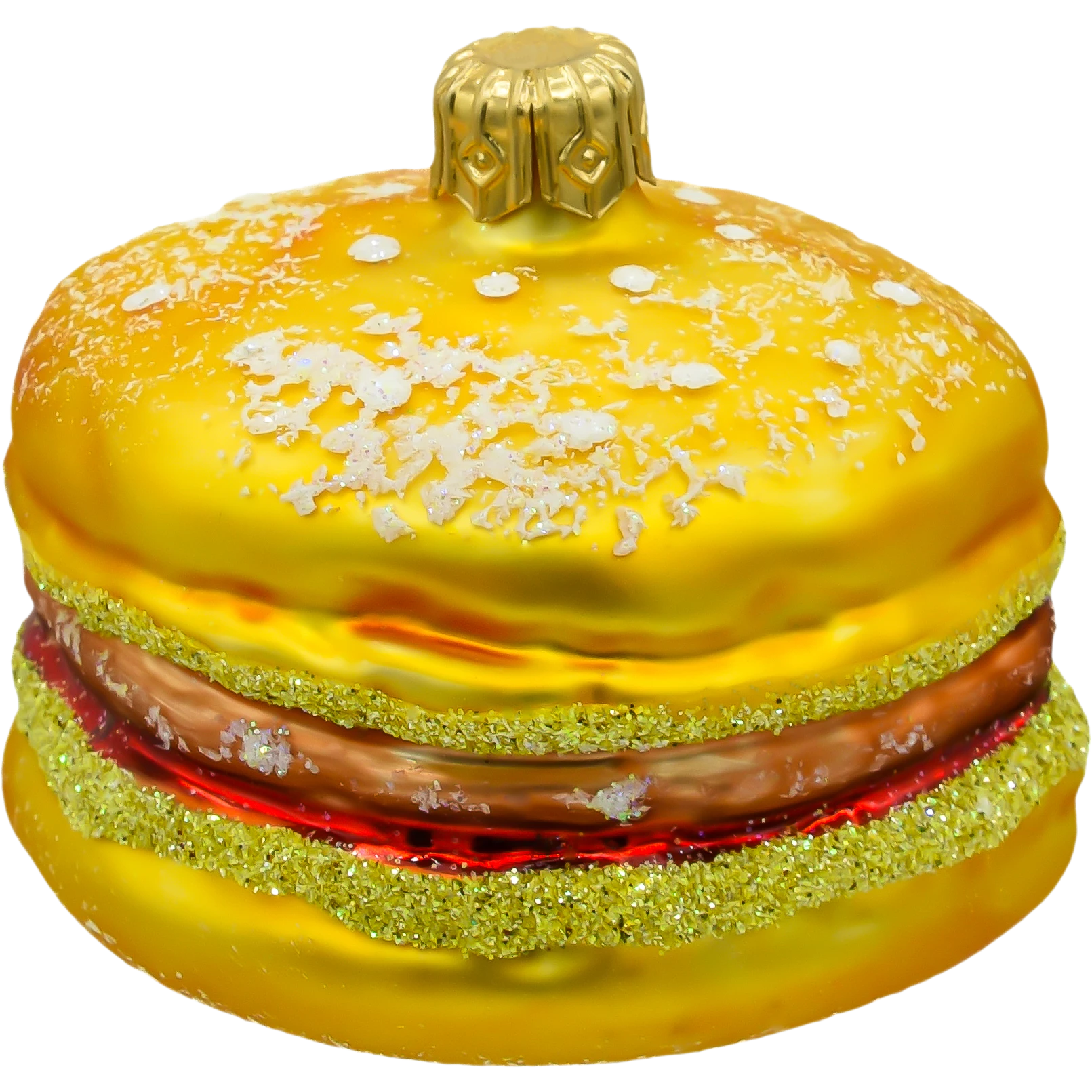 Szklana bombka choinkowa w kształcie hamburgera – ręcznie malowana ozdoba z brokatem. Zabawna dekoracja świąteczna dla fanów burgerów i nietypowych dodatków na choinkę.