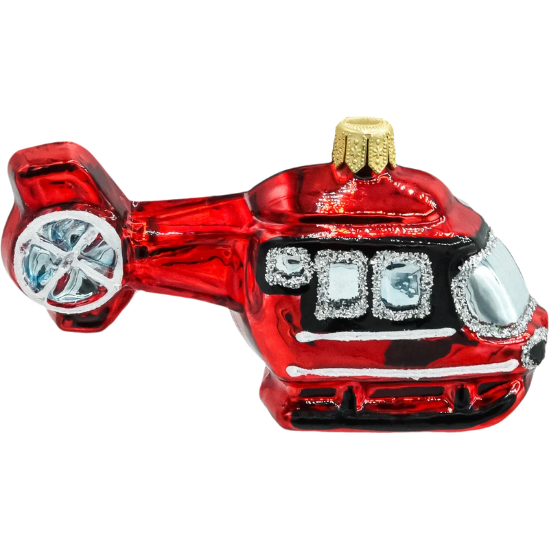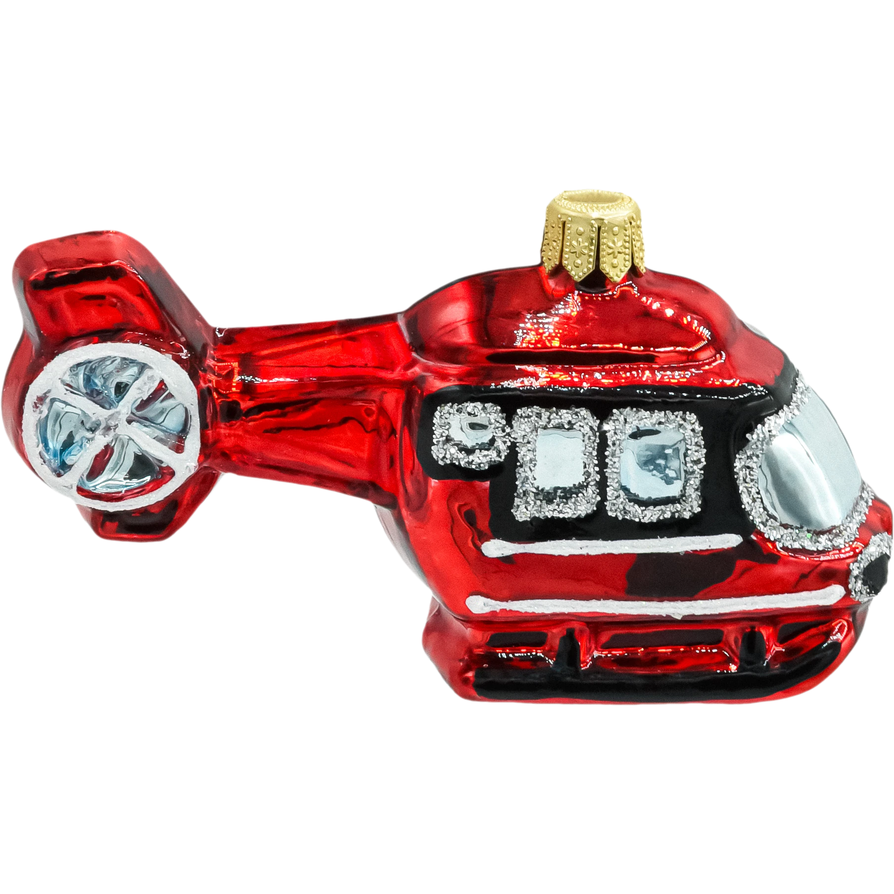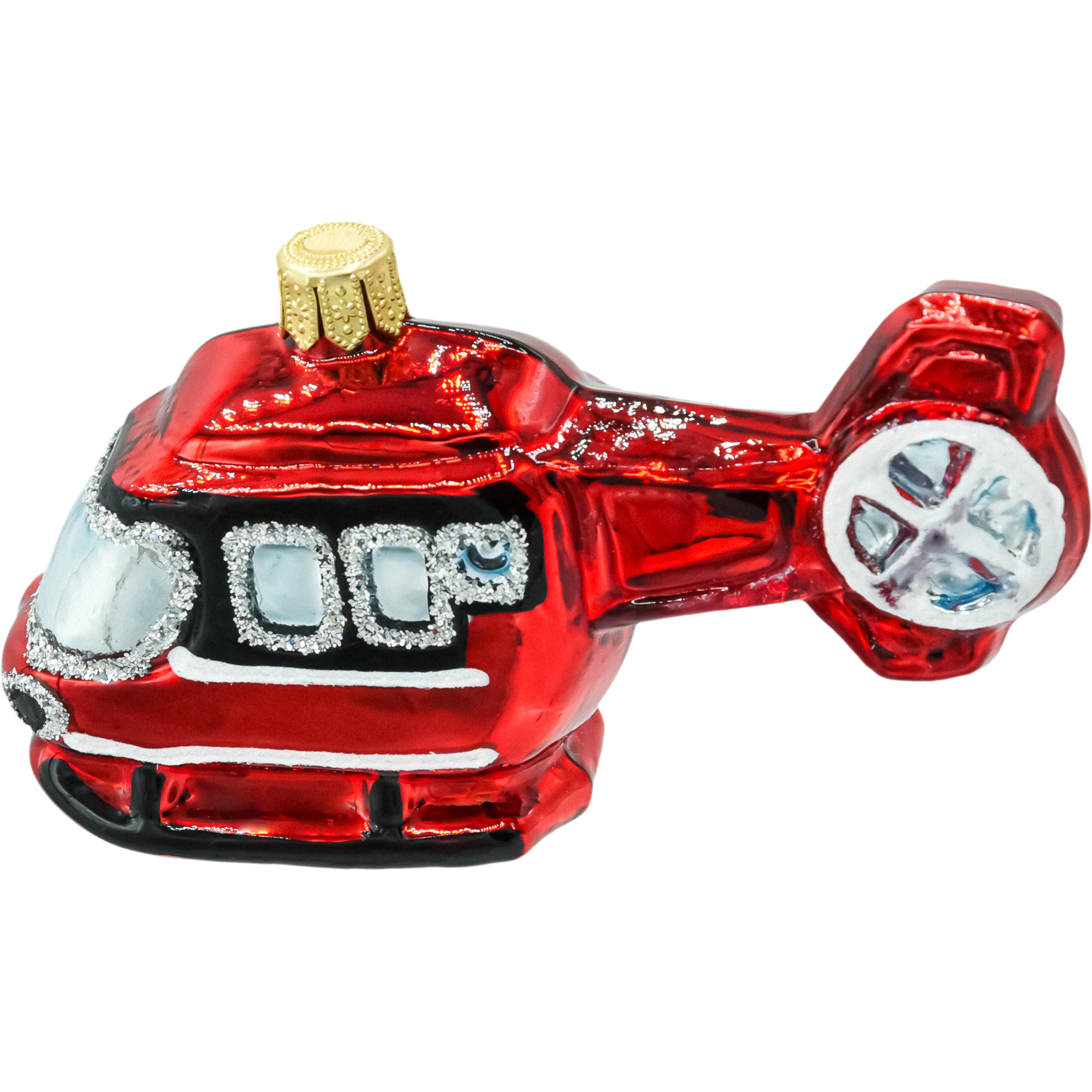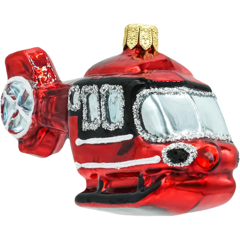 Ręcznie malowana bombka szklana – helikopter w intensywnej czerwieni z brokatowymi detalami. Lekka, błyszcząca i efektowna dekoracja choinkowa – idealna dla miłośników lotnictwa, dzieci i kolekcjonerów. Świetny prezent świąteczny i mocny akcent nowoczesnej choinki.