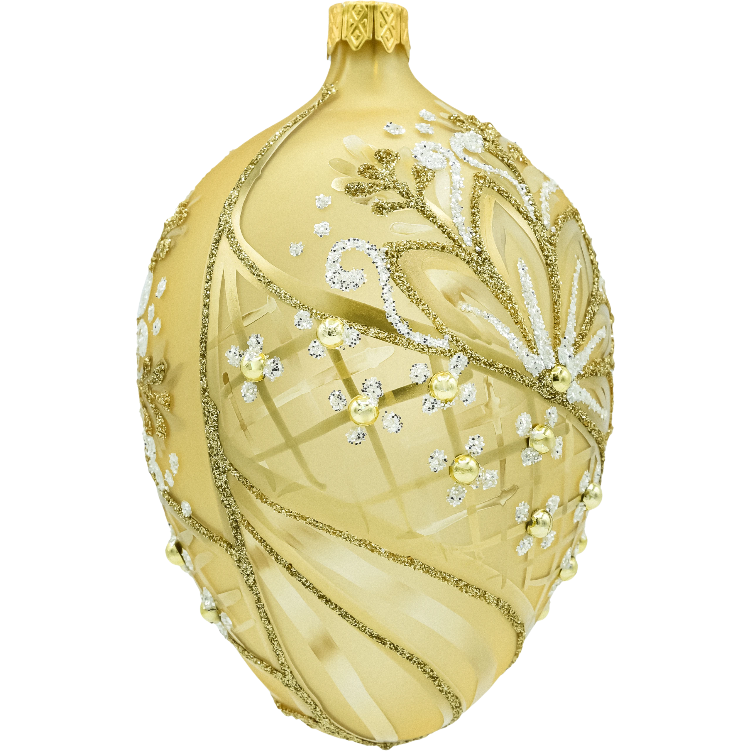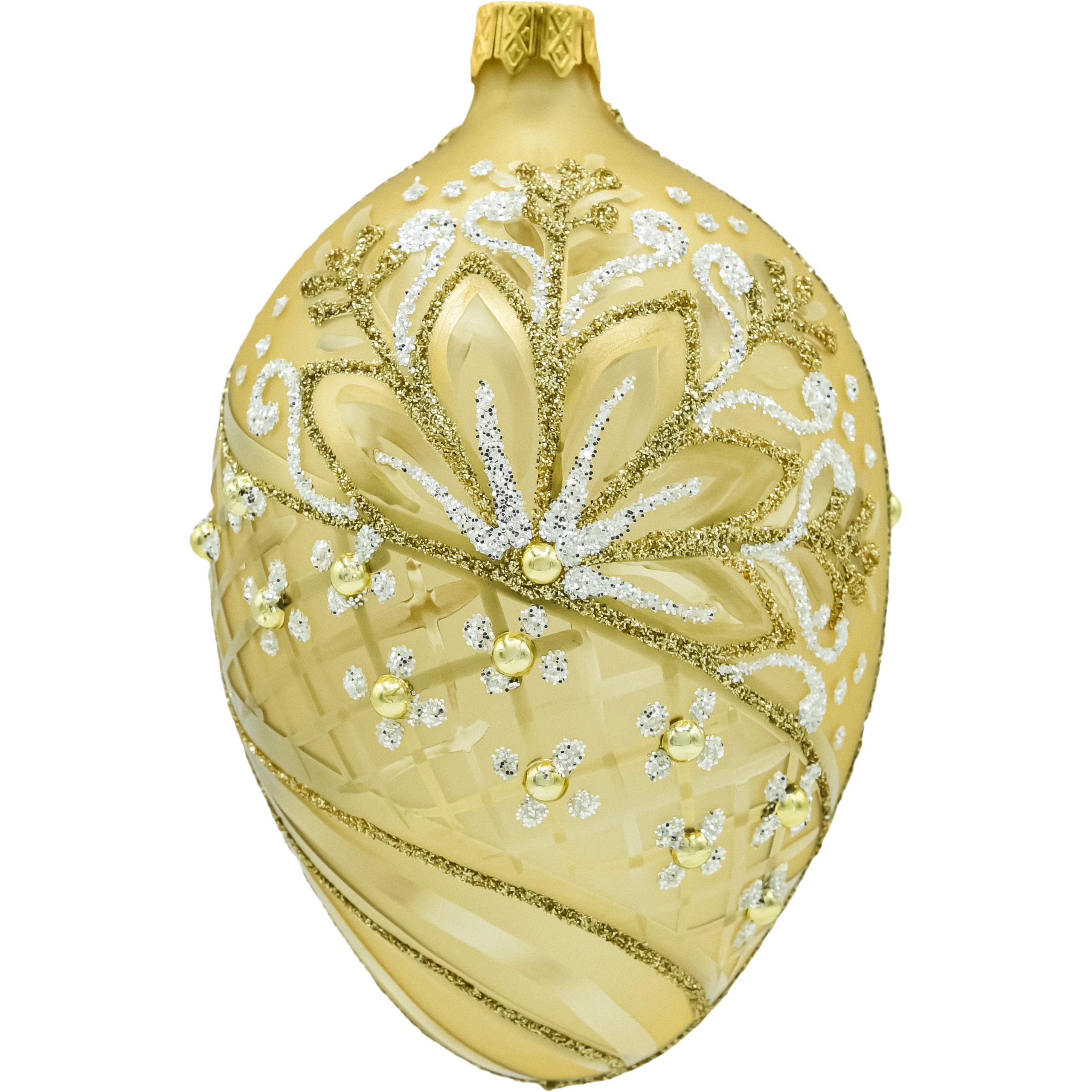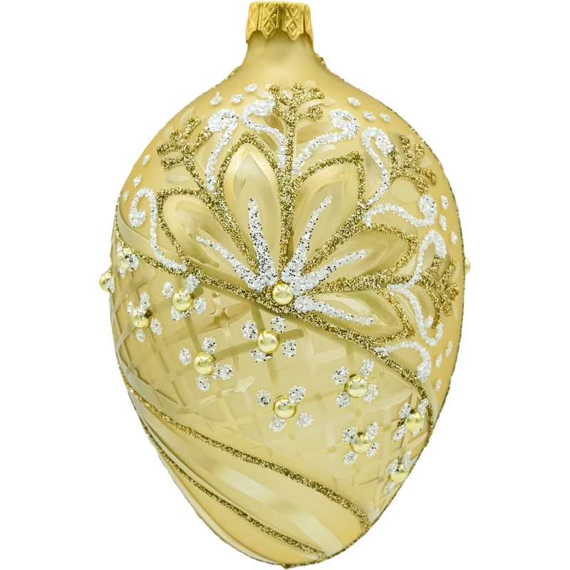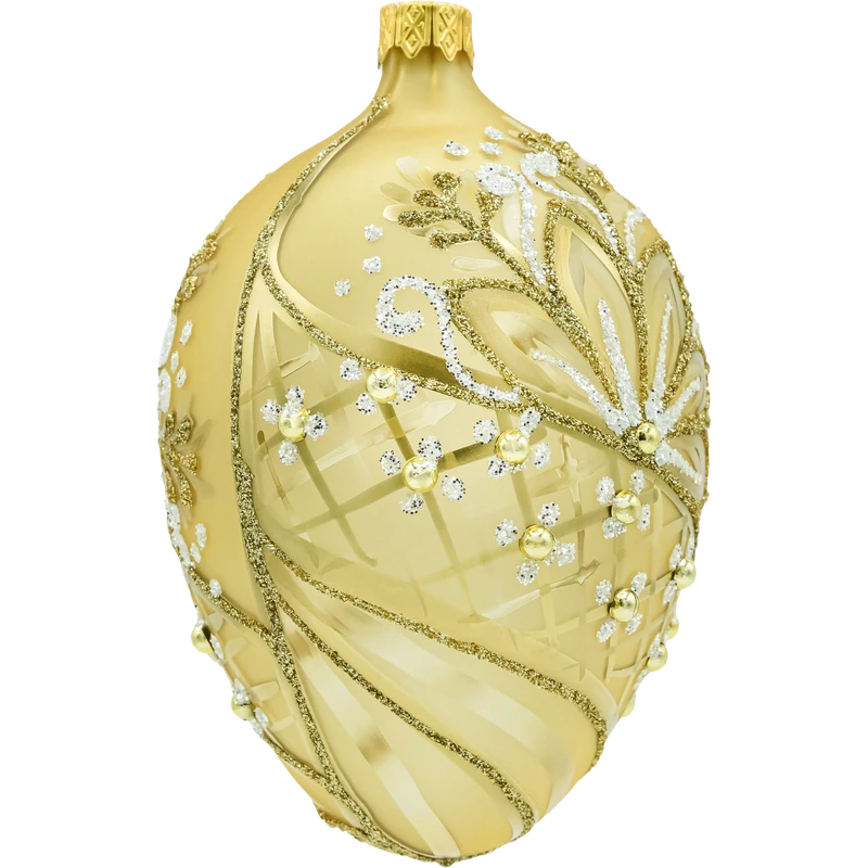 Wytworne szklane jajko w kolorze ciepłego złota to ozdoba, która natychmiast dodaje aranżacji klasy premium. Satynowa powierzchnia została ręcznie zdobiona bogatym ornamentem: liście i zawijasy prowadzone złotym oraz białym brokatem, delikatne wypukłe kropki i drobne kuleczki w kolorze złota tworzą elegancki efekt 3D. Na korpusie widać subtelne, matowo-błyszczące przecierki i siateczkę, które pięknie łapią światło lampek. To idealna bombka w kształcie jaja do stylu glamour i klasycznych, złotych kompozycji.