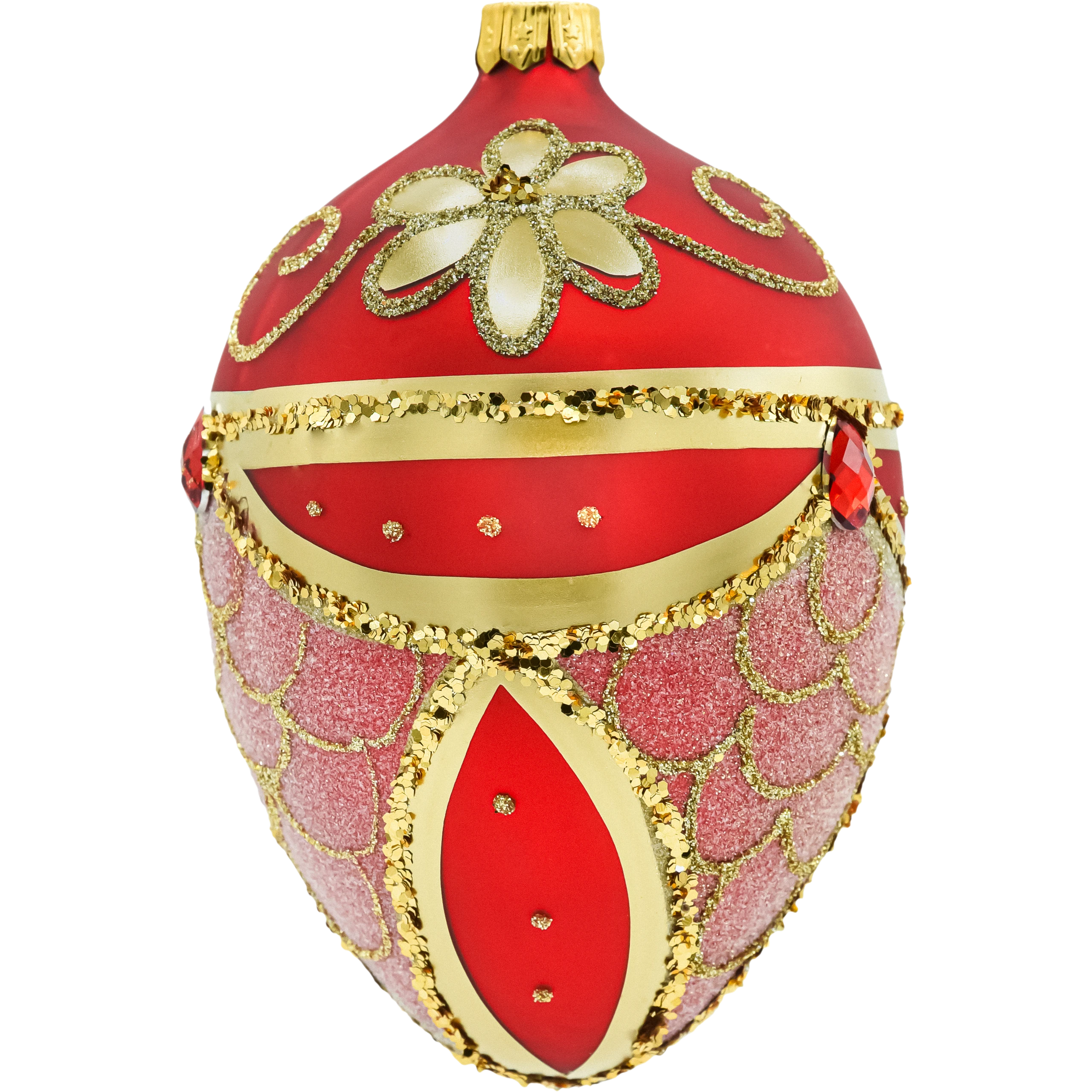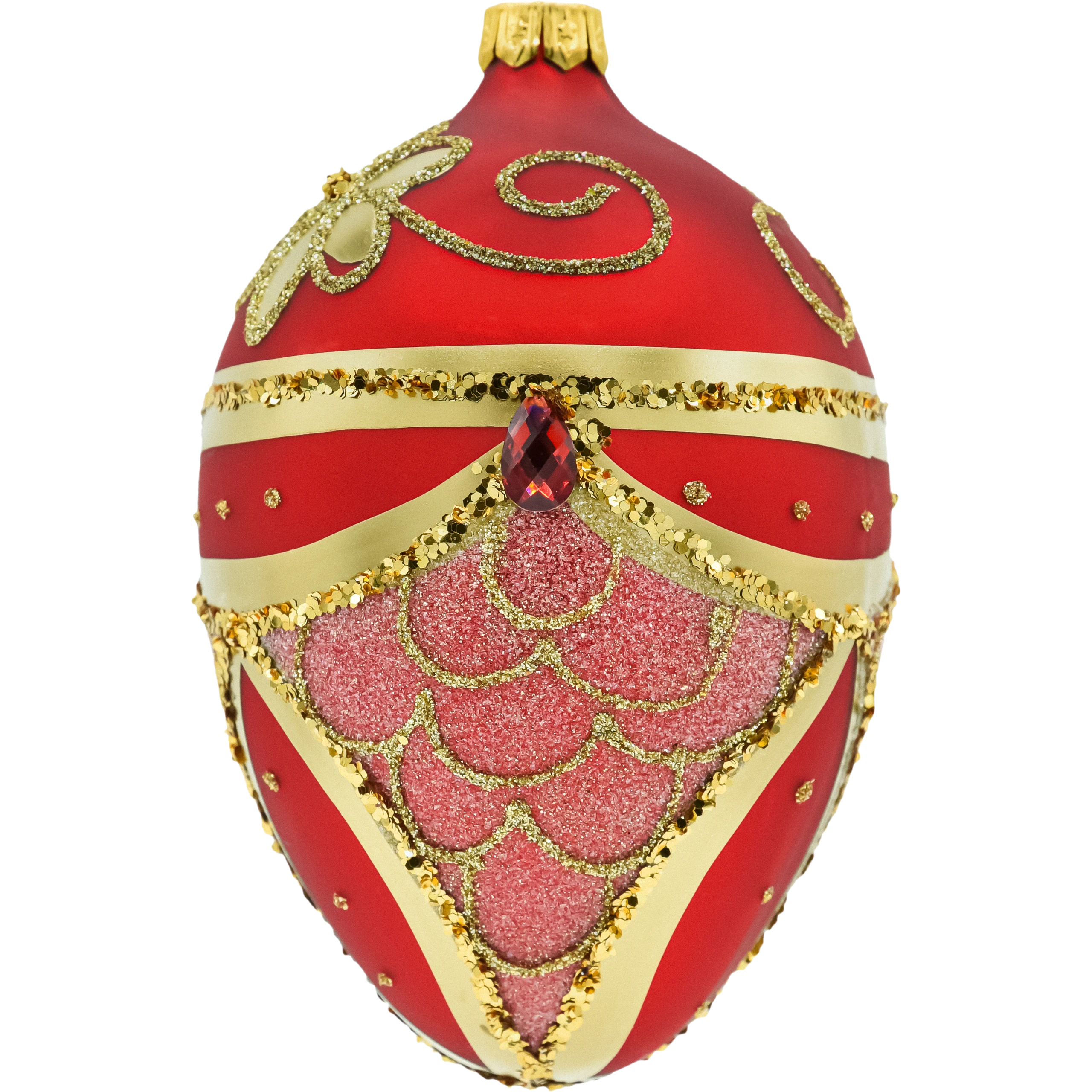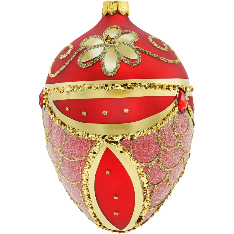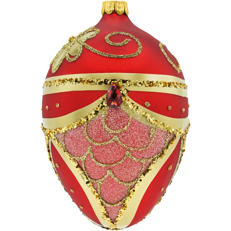 Luksusowa bombka szklana – jajko w czerwieni i złocie. Ręcznie dmuchana i malowana, zdobiona brokatem, cekinami i rubinowymi „kamieniami”. Lekka, z metalową zawieszką – perfekcyjna bombka glamour na choinkę, stroiki i eleganckie świąteczne aranżacje.