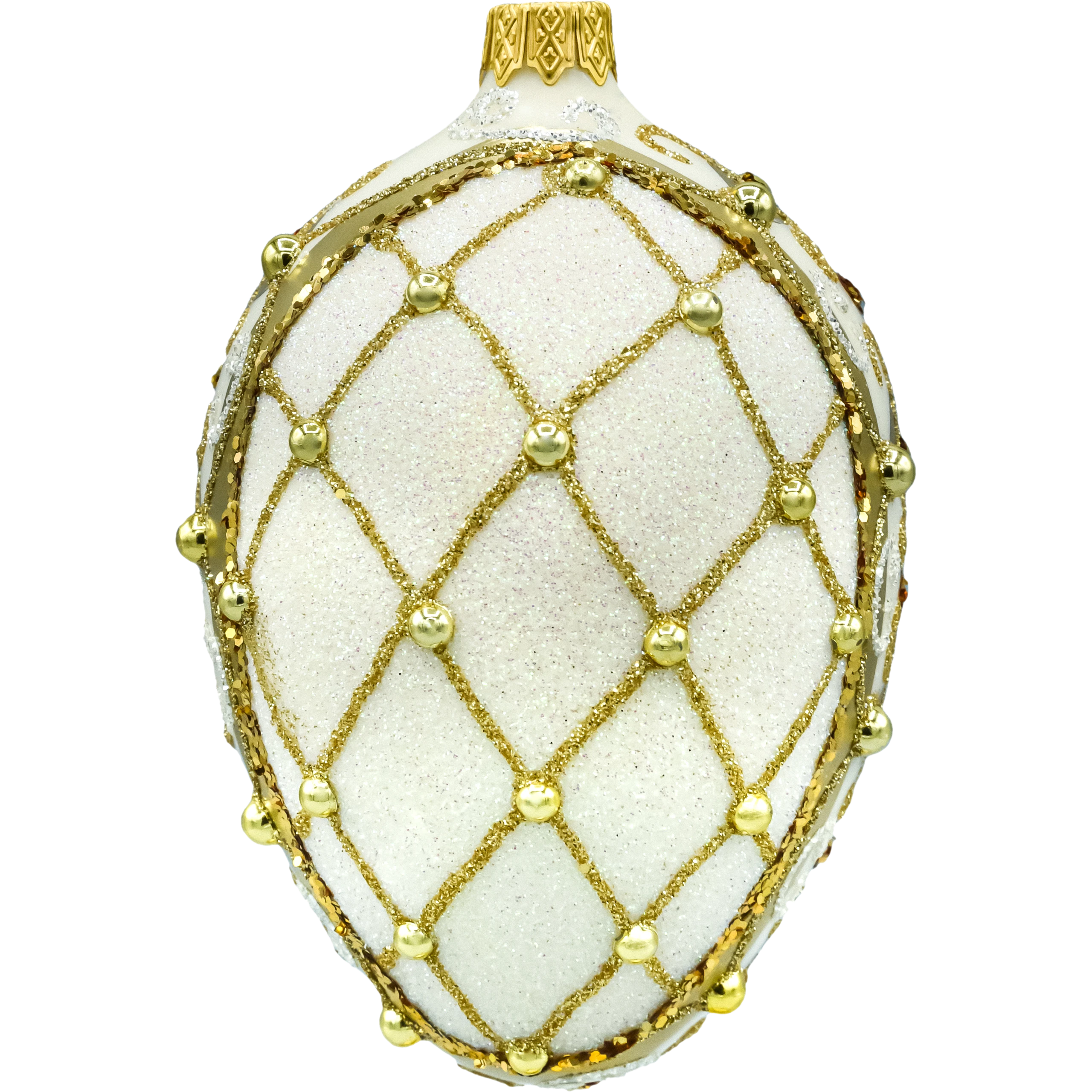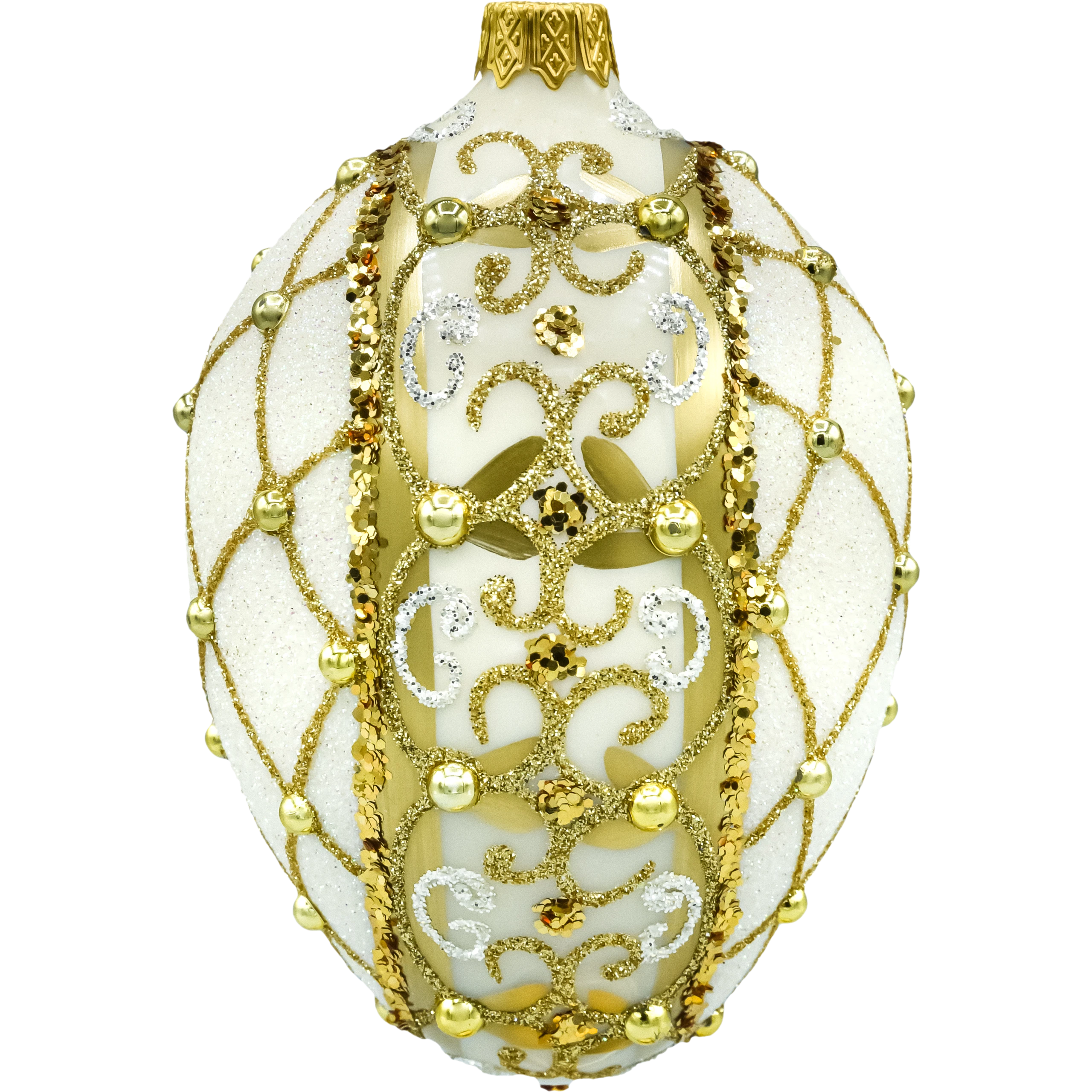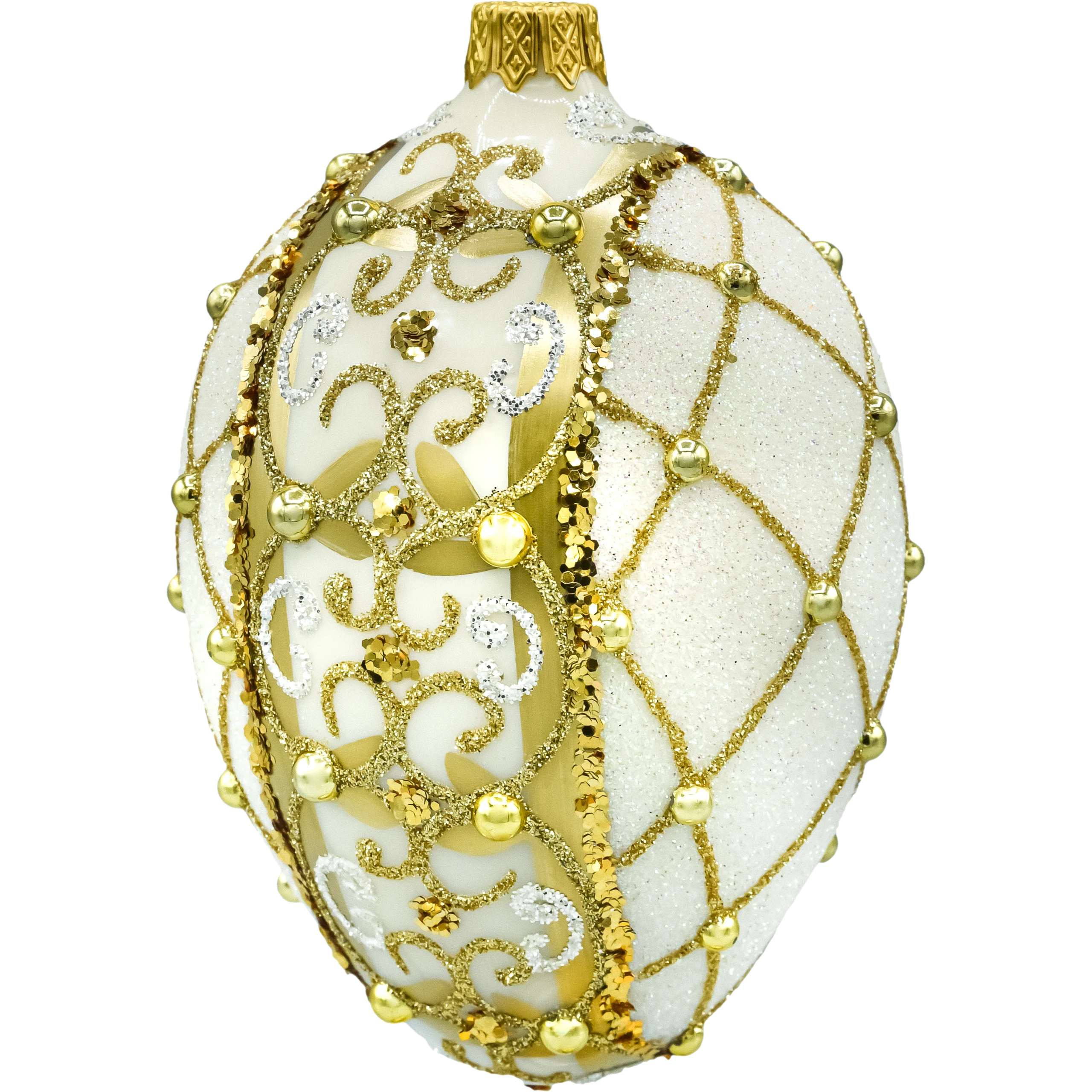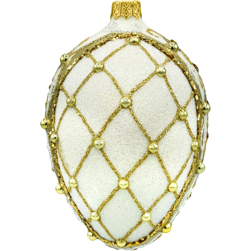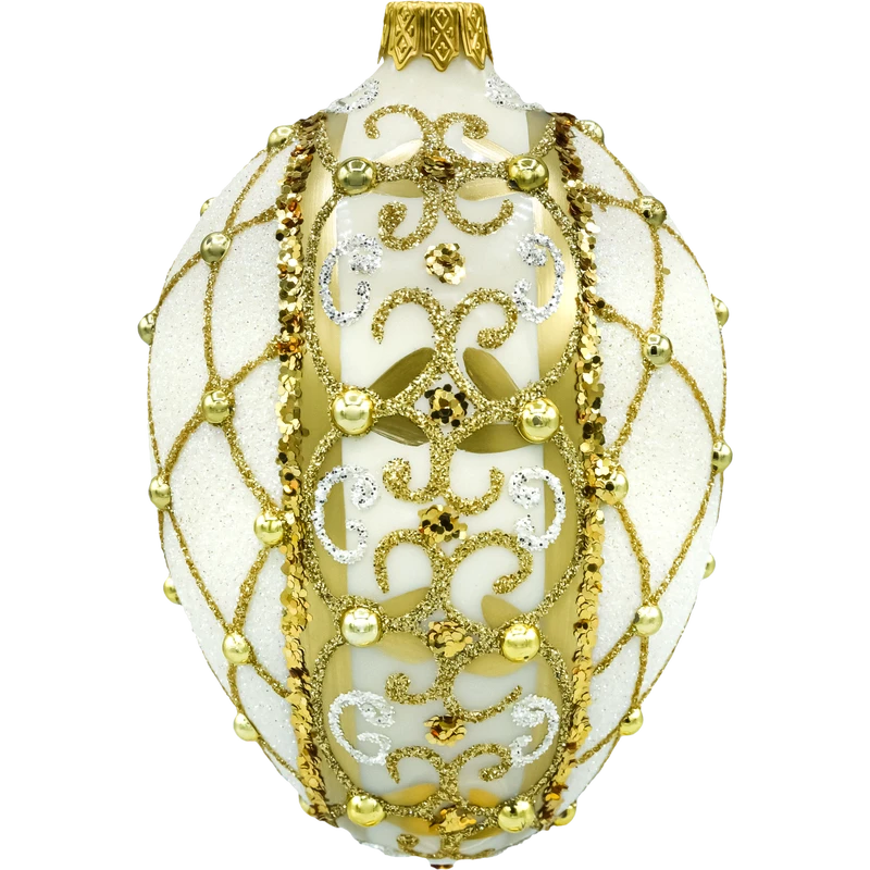 Luksusowa, szklana bombka choinkowa w kształcie jajka – ręcznie dmuchana i ręcznie zdobiona w bieli i złocie. Brokatowe ornamenty, złote cekiny i perłowe aplikacje tworzą efektowną siateczkę glamour, która pięknie mieni się w świetle lampek. Polska, kolekcjonerska ozdoba idealna na elegancką choinkę i wytworny prezent.