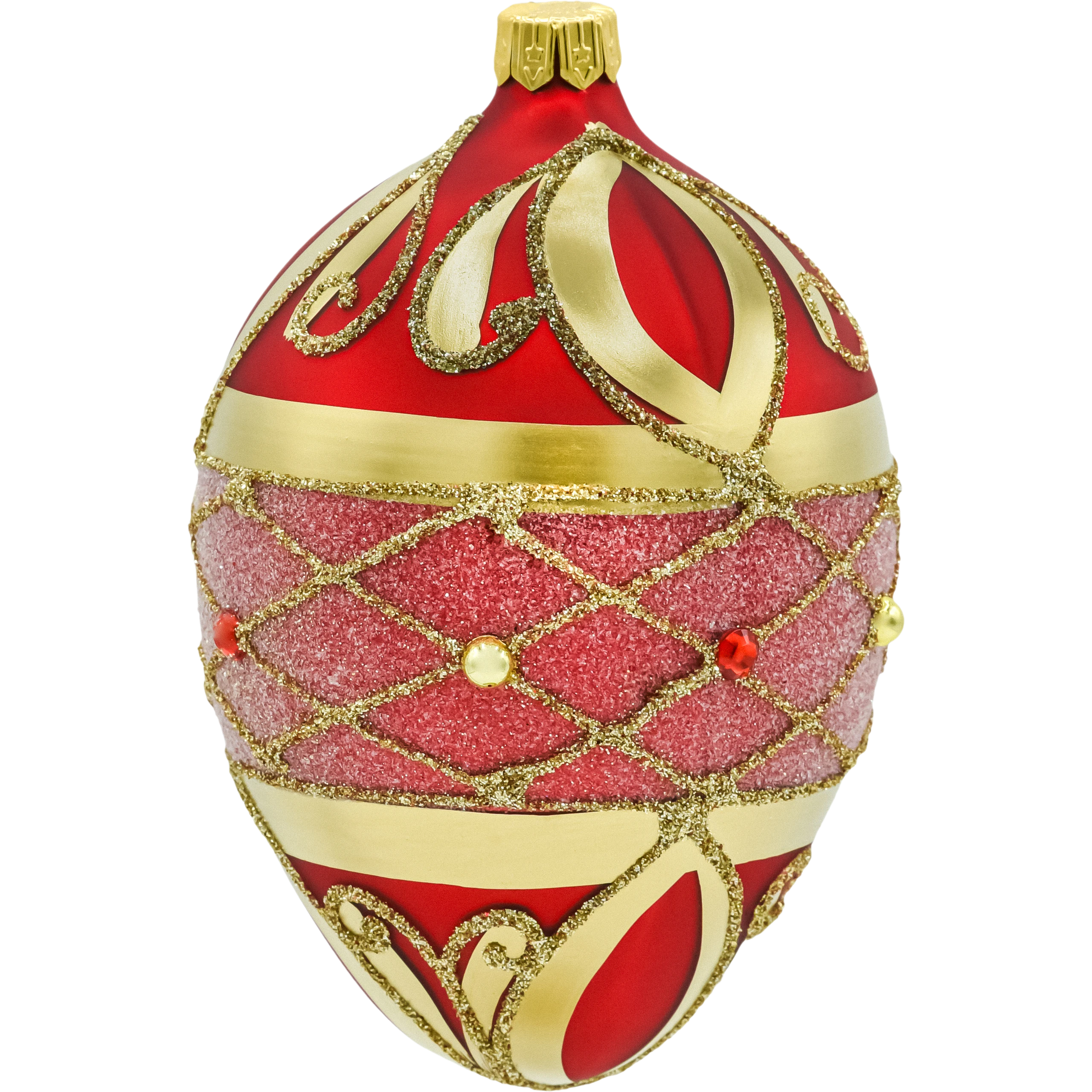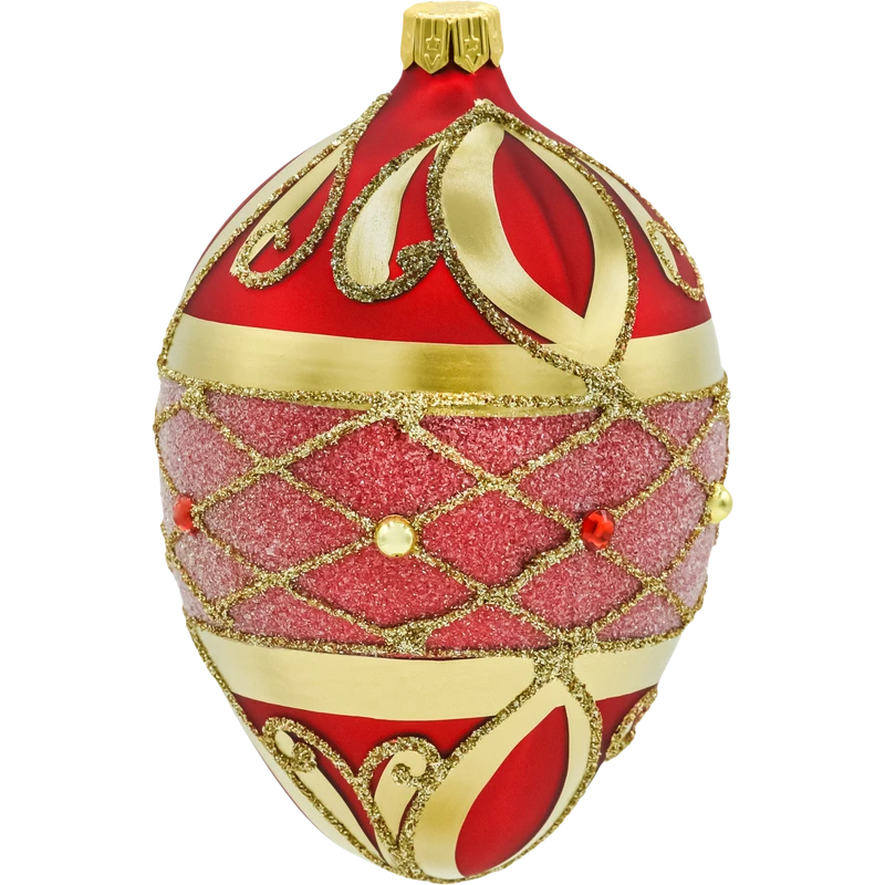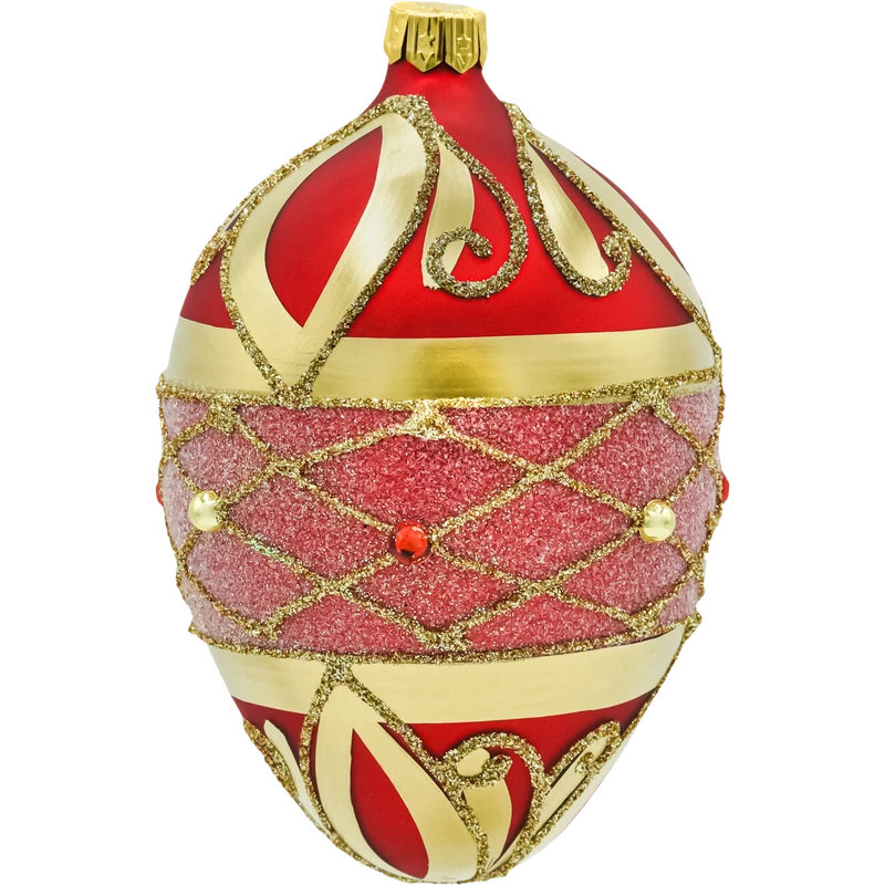 Luksusowa bombka szklana 12 cm w formie kropli/jajka. Czerwona baza, ręcznie malowane złote ornamenty, środkowy pas o cukrowej fakturze i zdobienia z kryształków. Idealna bombka choinkowa glamour do choinki, stroików i girland – klasyczne połączenie czerwieni i złota nadaje aranżacji świątecznego blasku.