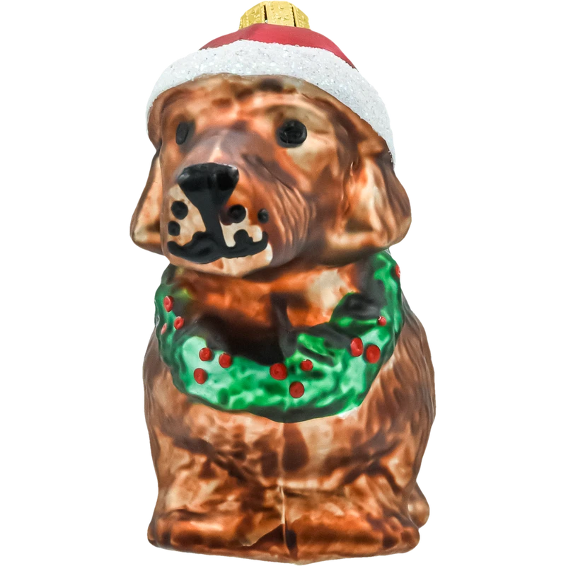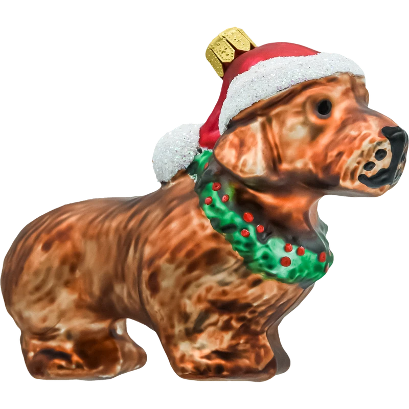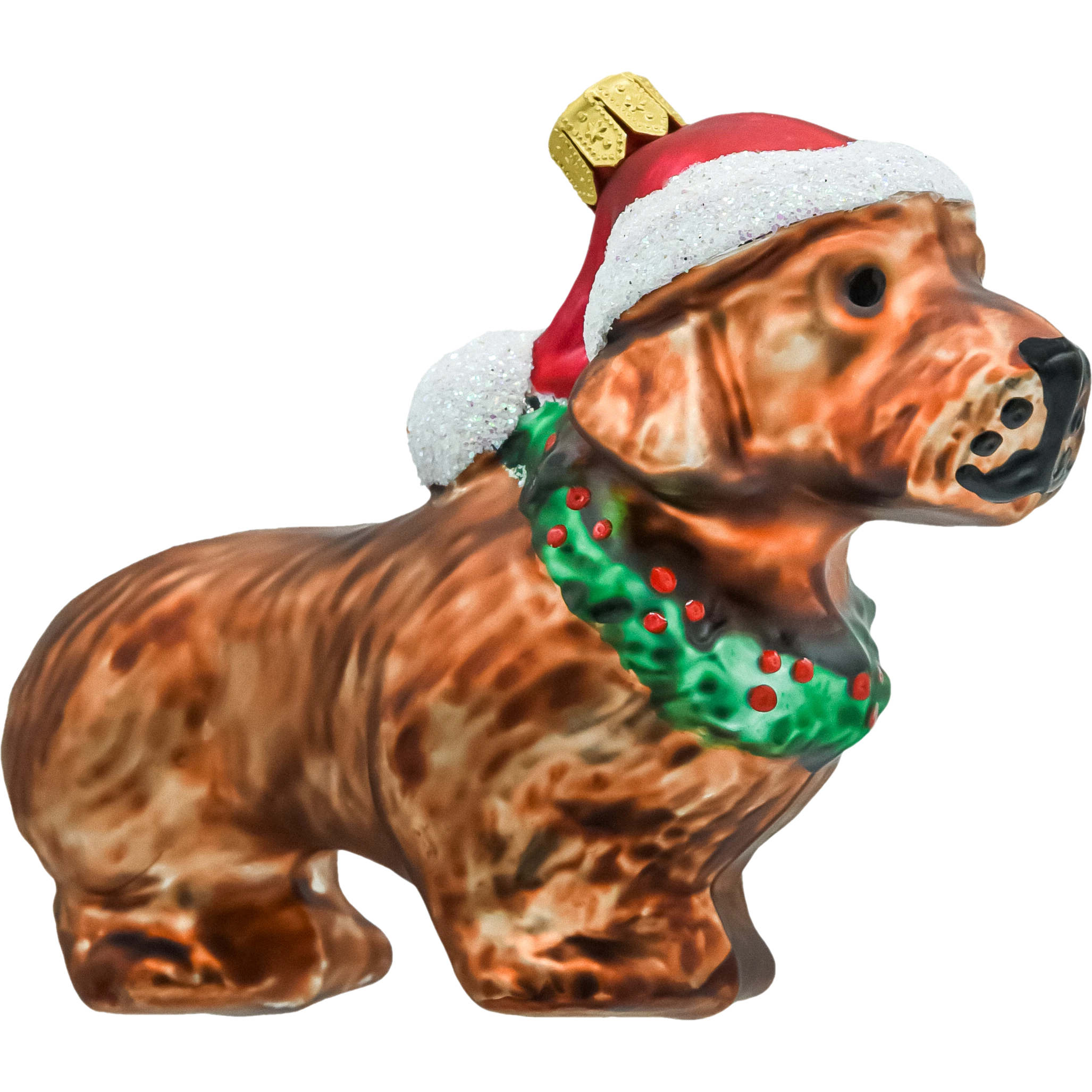 Ta urocza bombka szklana w kształcie pieska–jamnika wnosi na choinkę odrobinę ciepła i humoru. Błyszcząca, miedziano-brązowa „sierść”, czapka Mikołaja z iskrzącym „śniegiem” oraz zielony, świąteczny wieniec z czerwonymi jagódkami tworzą elegancką, a jednocześnie pełną uroku kompozycję. To idealna ozdoba świąteczna dla miłośników psów, dzieci i wszystkich, którzy lubią nietuzinkowe, ręcznie zdobione bombki.