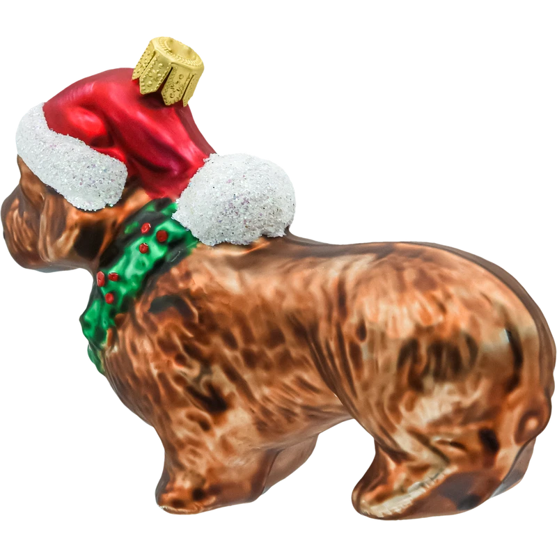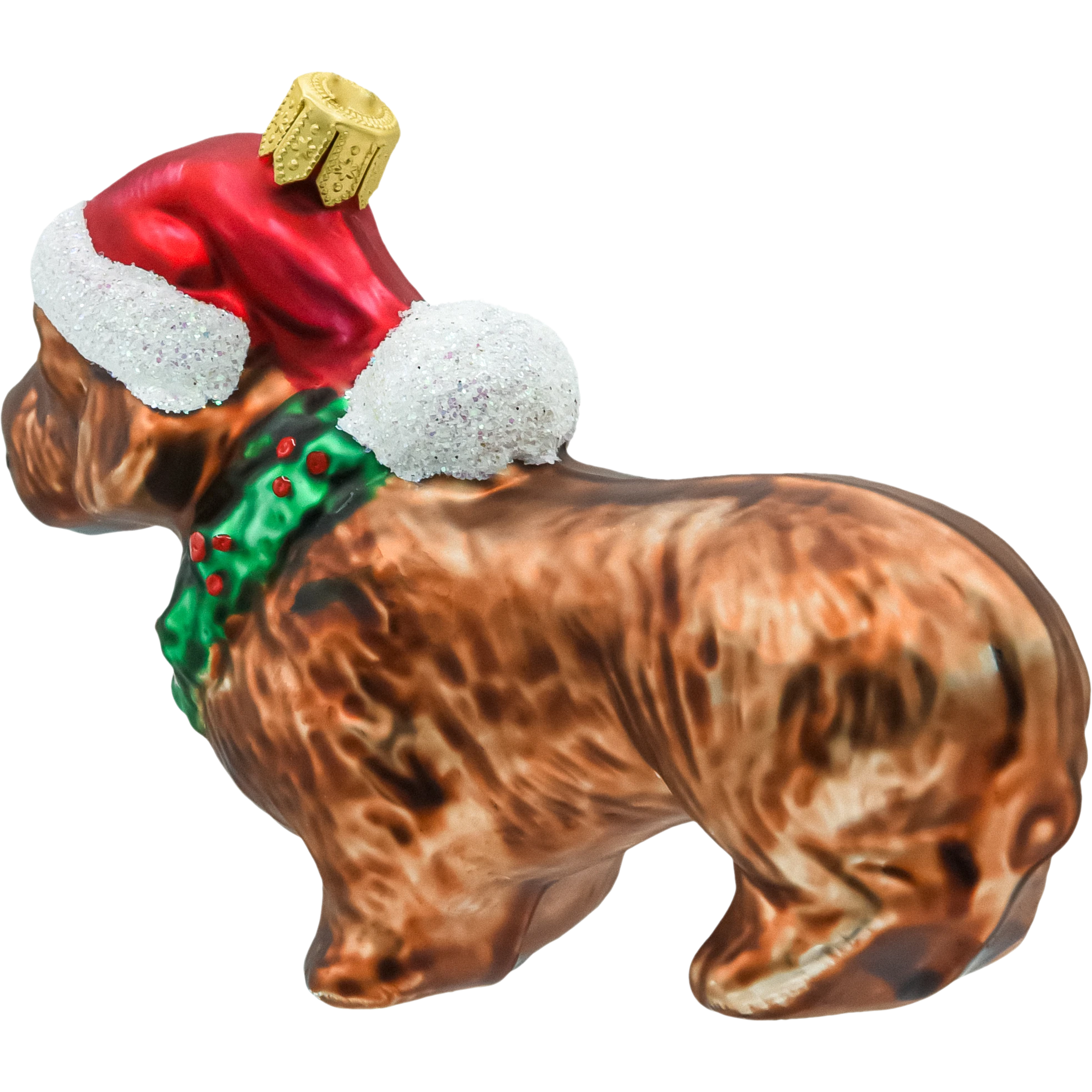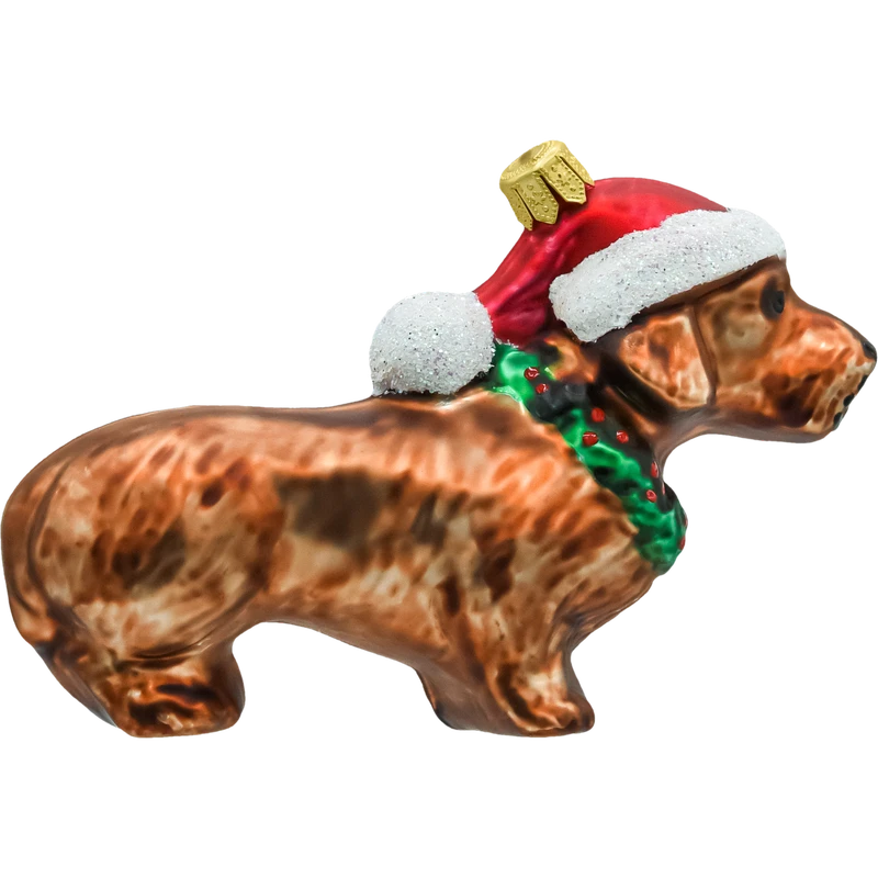Ręcznie malowana bombka szklana – piesek/jamnik w czapce Mikołaja. Lekka, połyskująca i bogato zdobiona brokatem oraz śniegiem cukrowym. Idealna ozdoba choinkowa i prezent dla miłośników psów – doda Twoim świętom ciepła i odrobiny humoru.