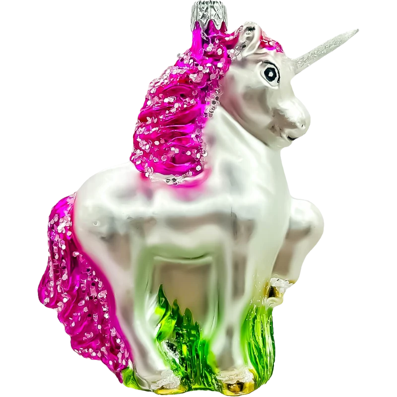 Jednorożec to symbol czystości, nadziei i magii. Połączenie intensywnej różowej grzywy, brokatowych akcentów i zielonych detali u podstawy tworzy harmonijną kompozycję, która wprowadza na choinkę element baśniowego uroku. To idealna ozdoba zarówno do dziecięcych pokoi, jak i do świątecznych dekoracji dla miłośników fantastycznych motywów.