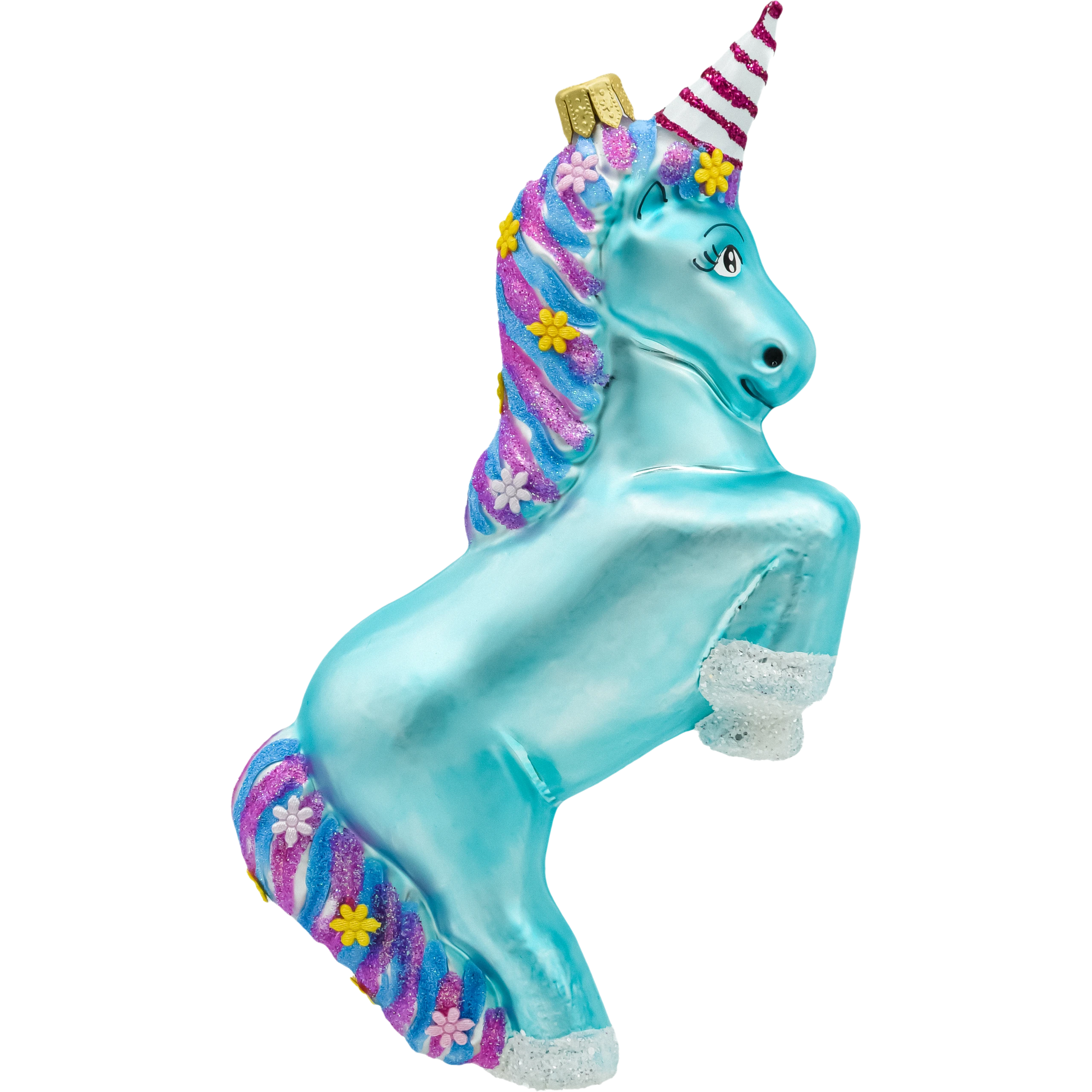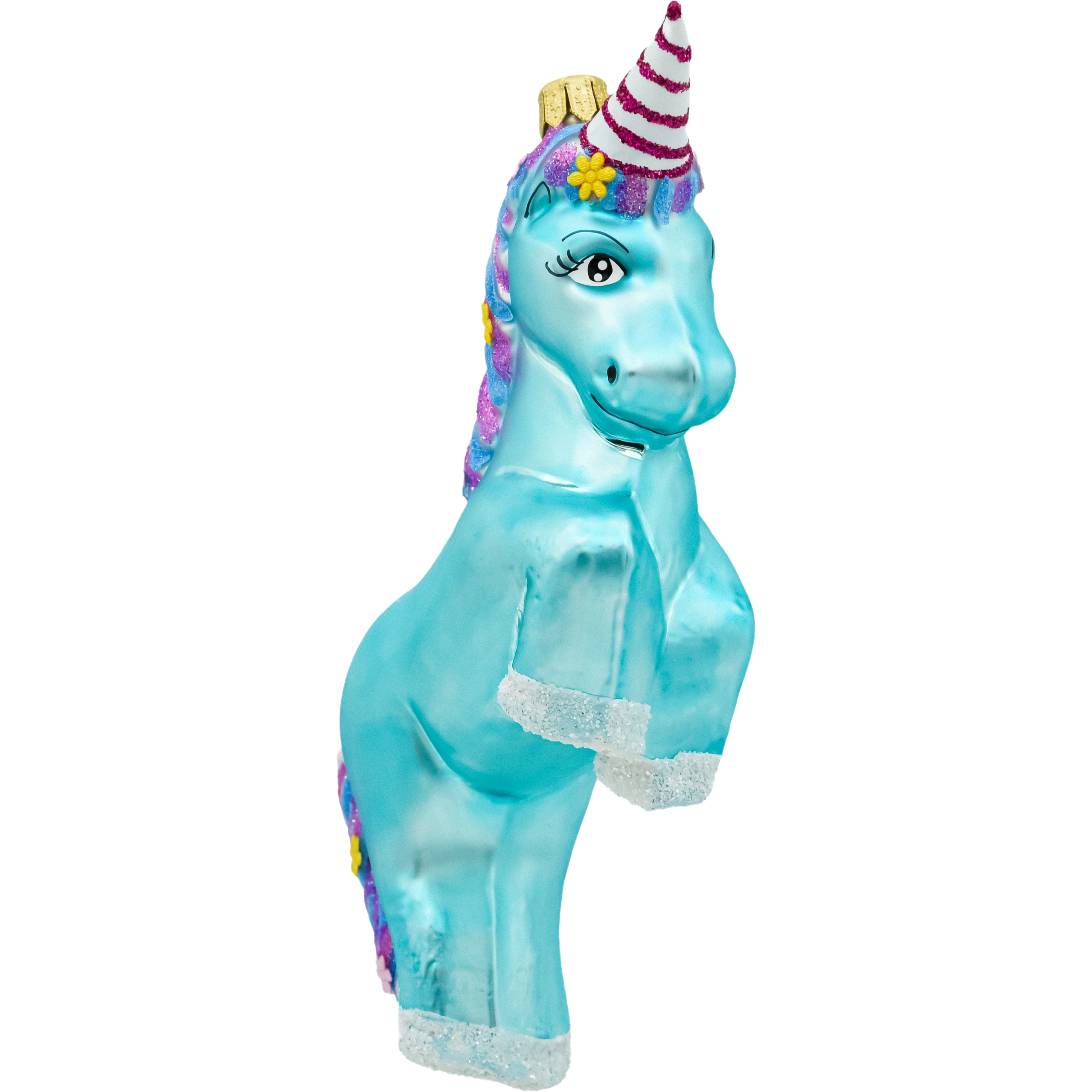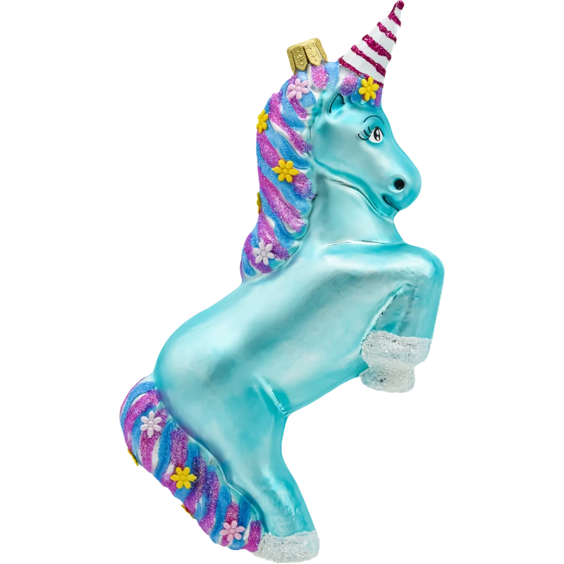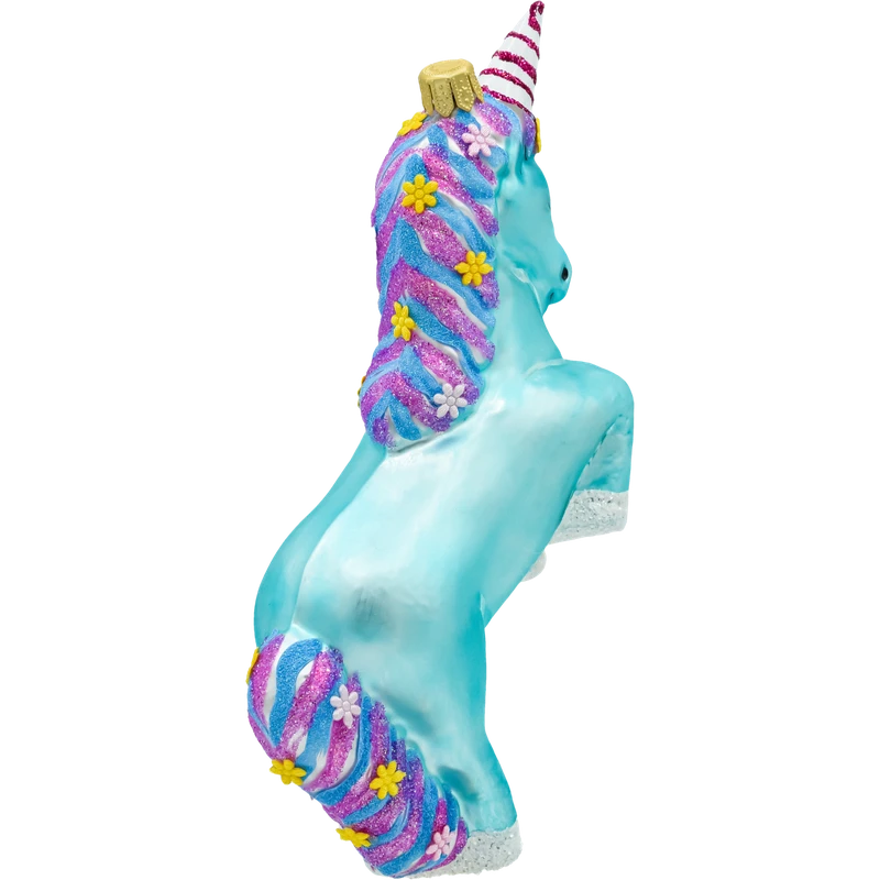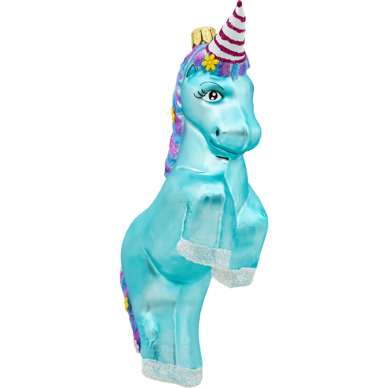 Wprowadź magiczny akcent na swoją choinkę z wyjątkową bombką choinkową w kształcie turkusowego jednorożca. Ta unikalna ozdoba wykonana z wysokiej jakości szkła przyciąga wzrok intensywnym turkusowym kolorem, który wyróżnia się na tle tradycyjnych dekoracji. Jednorożec ma efektowną, kolorową grzywę w odcieniach różu, fioletu i niebieskiego, zdobioną brokatowymi kwiatkami, które dodają mu uroku i bajkowego charakteru. Róg jednorożca jest ozdobiony biało-czerwonymi paskami.