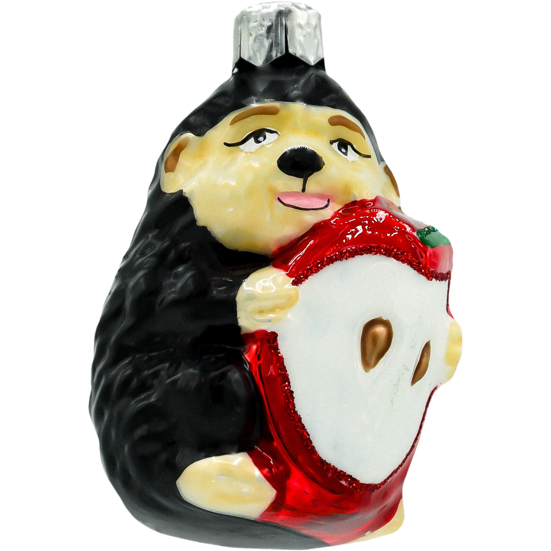 Bombka wykonana jest ze szkła dmuchanego i malowana ręcznie z ogromną dbałością o detale – od przyjaznego wyrazu pyszczka jeżyka po soczystą czerwień jabłka ozdobionego połyskującym brokatem. Subtelna paleta kolorów – czerń, krem, róż oraz intensywna czerwień – sprawia, że bombka jest jednocześnie wyrazista i pełna ciepła. Dzięki swojej trójwymiarowej formie i błyszczącym elementom, pięknie odbija światło lampek choinkowych, przyciągając wzrok i dodając drzewku świątecznego uroku.