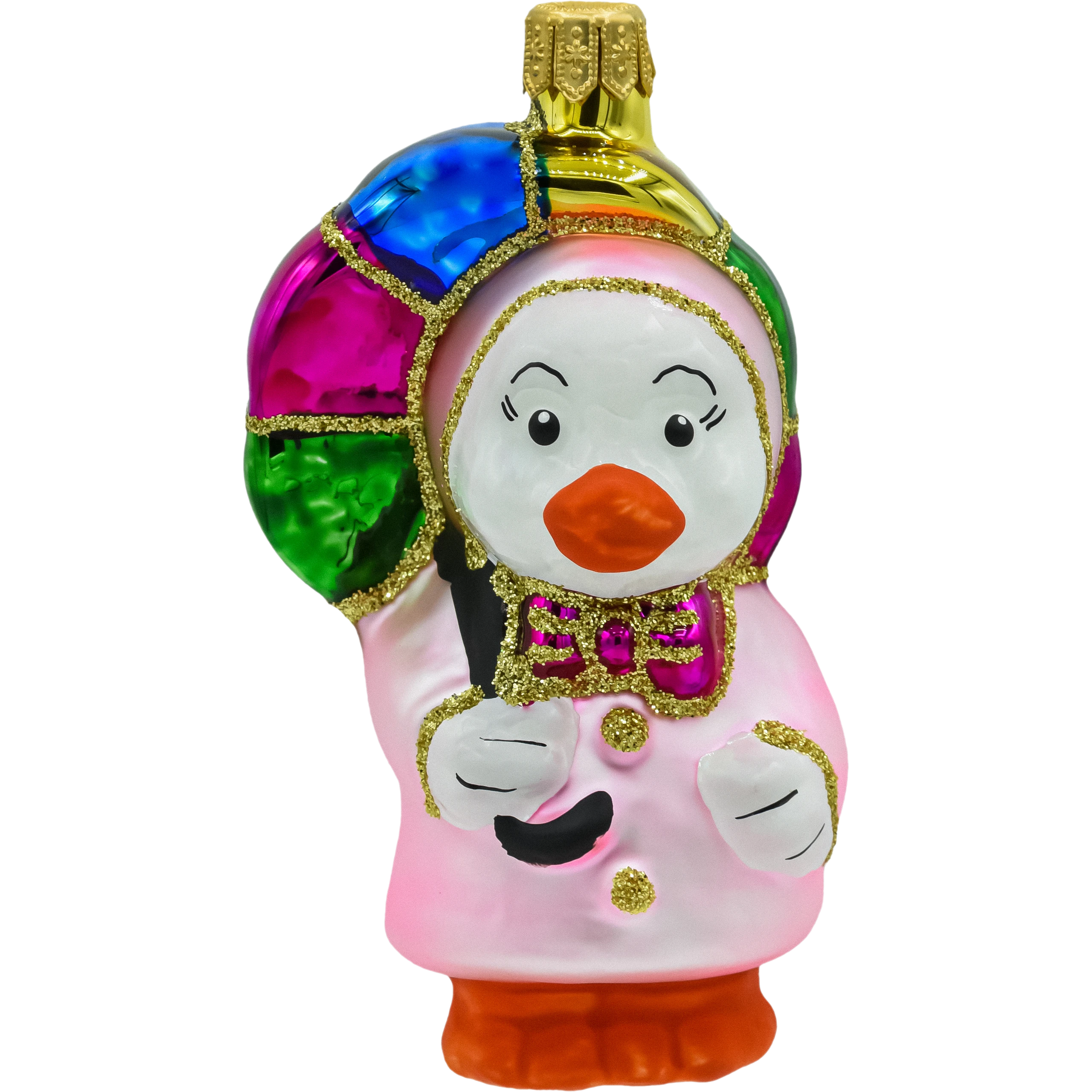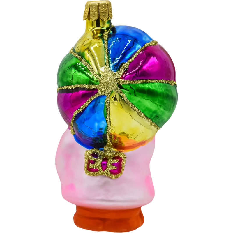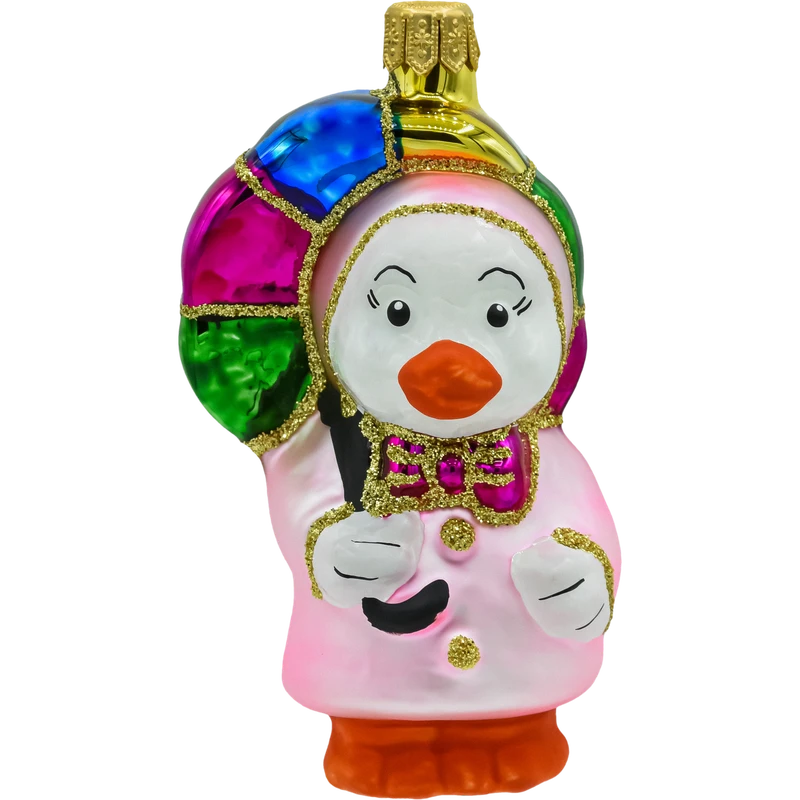 Urocza, ręcznie zdobiona bombka z dmuchanego szkła przedstawiająca kaczuszkę w różowym płaszczyku i z wielobarwną parasolką. Lśniące segmenty parasolki (zieleń, niebieski, fuksja, złoto) podkreślono złotym brokatem, a pomarańczowy dziób i „buciki” dodają figurce ciepłego, bajkowego charakteru. To idealna bombka choinkowa figurka do kolorowych aranżacji w stylu retro i do kolekcji szklanych bombek świątecznych.
