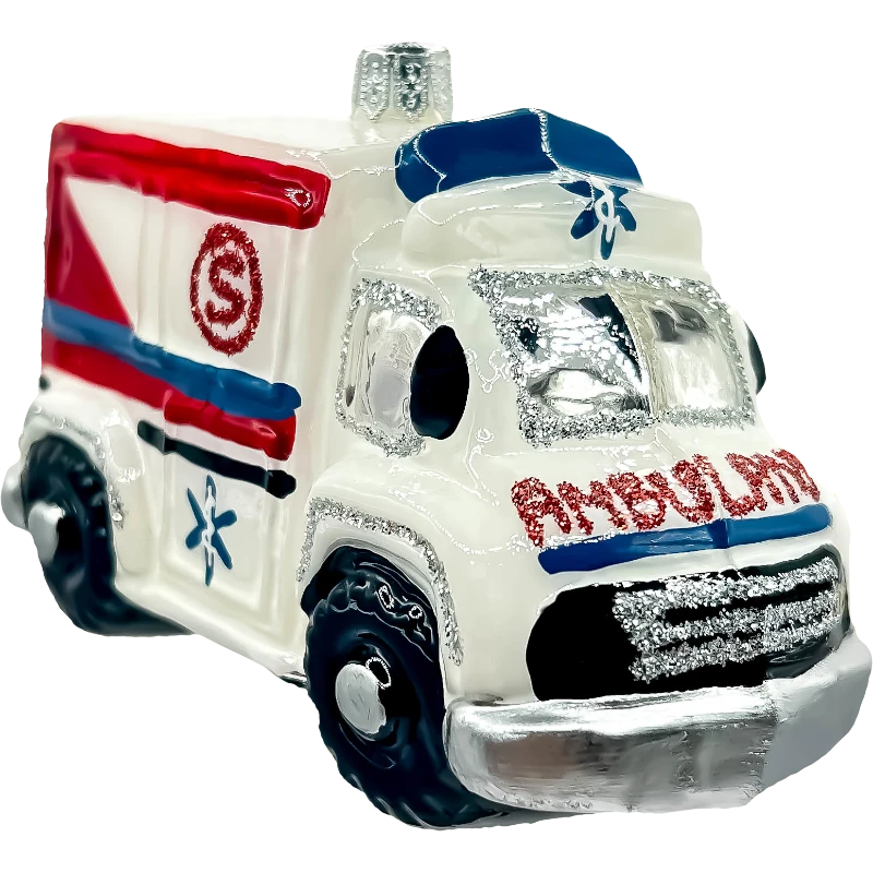 Bombka w kształcie karetki przyciąga uwagę swoim precyzyjnym wykonaniem i realistycznym odwzorowaniem detali, takich jak światła, szyby czy symbole medyczne.
