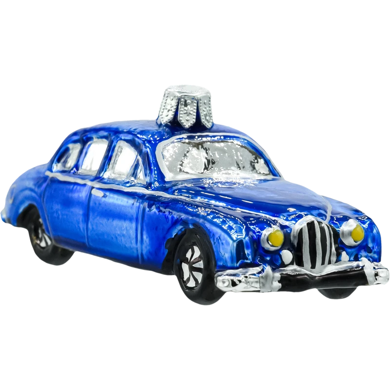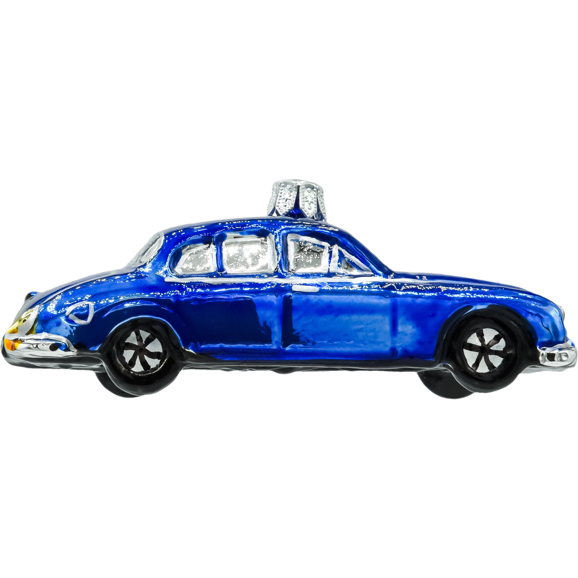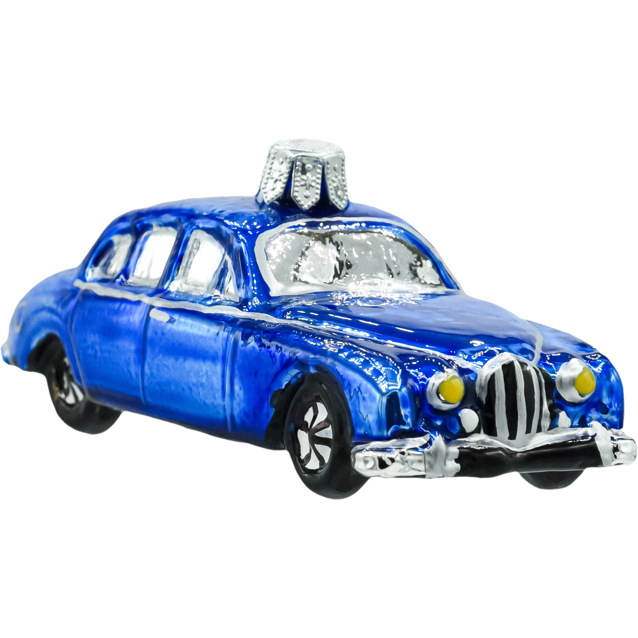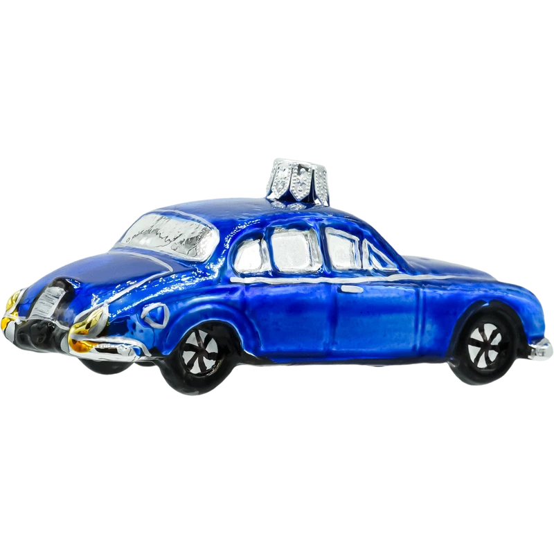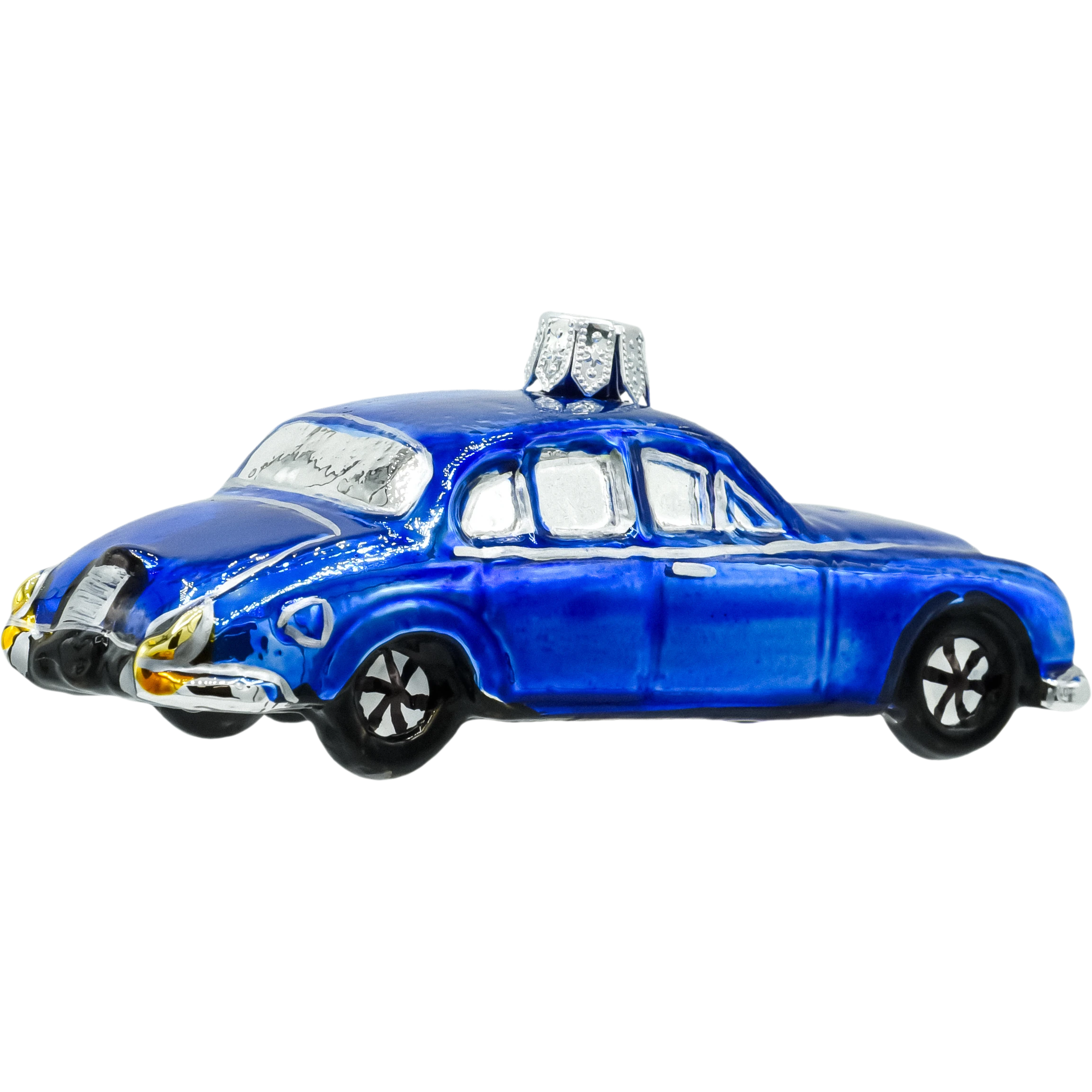 Design: Bombka przedstawia klasyczny, stylowy samochód w kolorze głębokiego błękitu, z realistycznymi, srebrnymi elementami oraz starannie odwzorowanymi szczegółami, takimi jak reflektory, lusterka i opony.