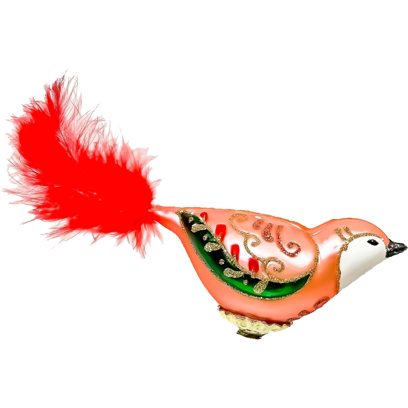 Ogon wykonany z naturalnego pióra w intensywnie czerwonym kolorze dodaje bombce lekkości i dynamiki.