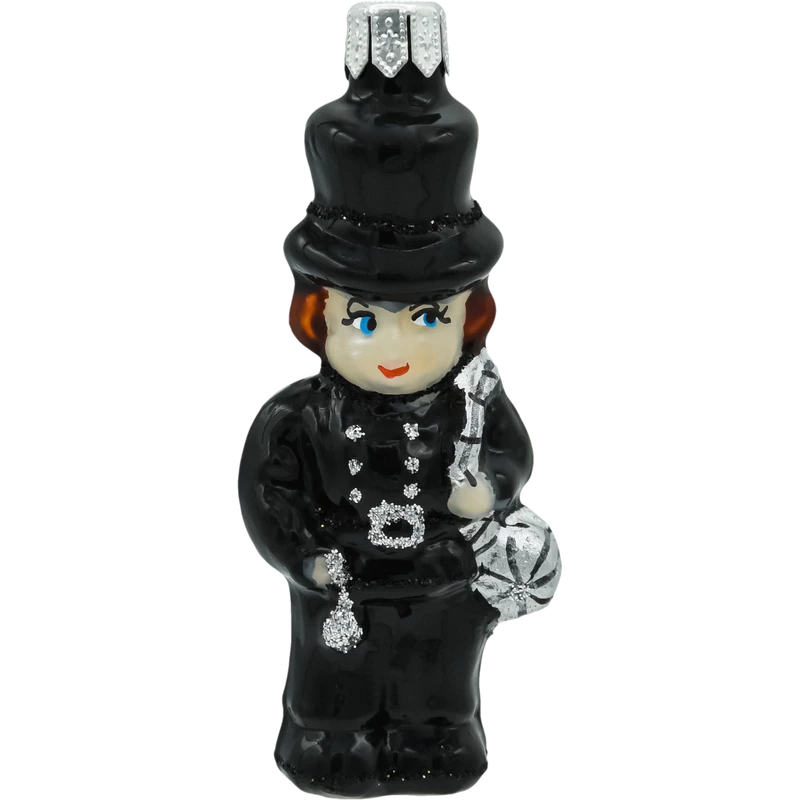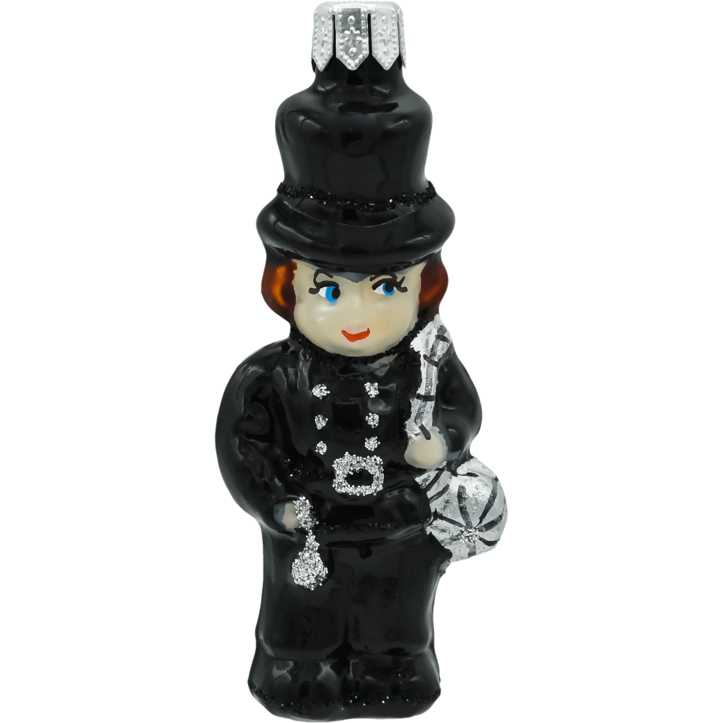 Wprowadź odrobinę świątecznego uroku i tradycyjnego symbolu szczęścia na swoją choinkę dzięki tej wyjątkowej bombce choinkowej w kształcie kominiarza. Wykonana ze szkła dmuchanego i ręcznie malowana, ta urocza figurka przedstawia klasycznego kominiarza w czarnym stroju z charakterystycznym cylindrem, z uśmiechem na twarzy i narzędziami pracy – w tym błyszczącą, srebrną drabiną i liną z kulą.
