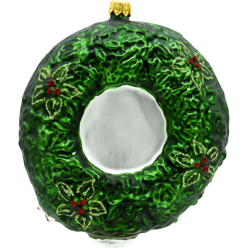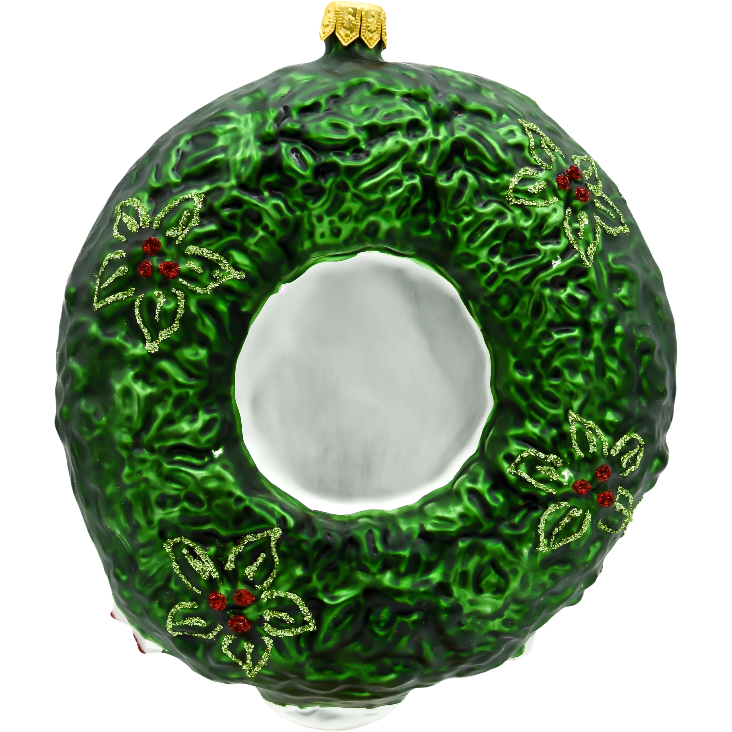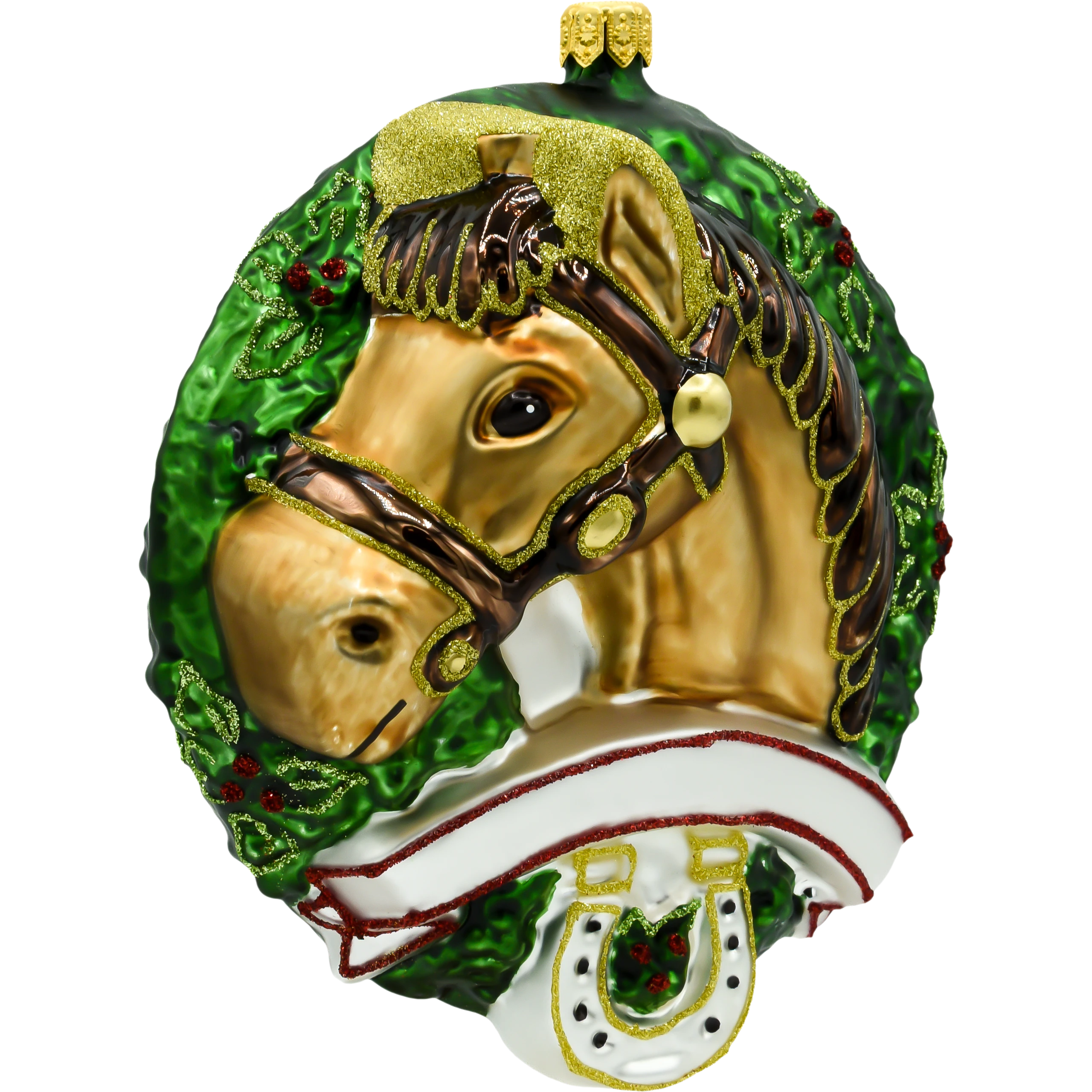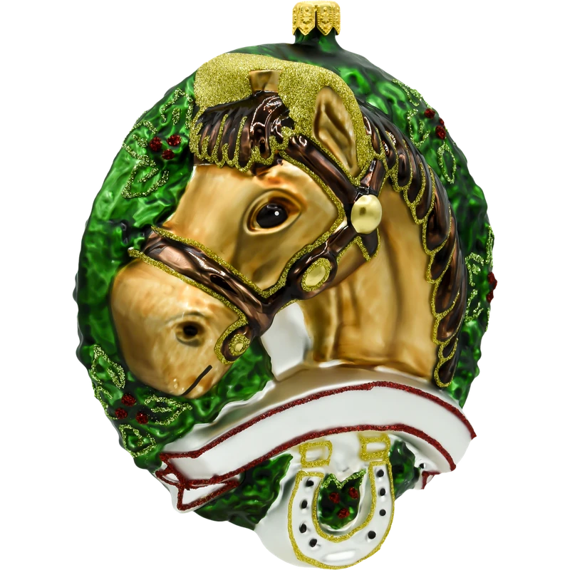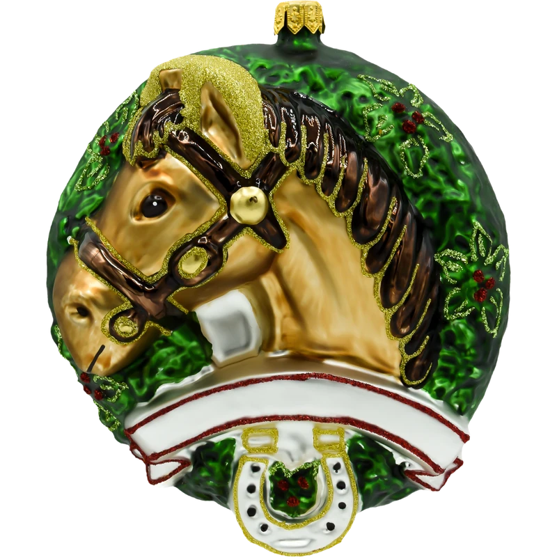 Wprowadź do swojej choinki odrobinę wiejskiego uroku i klasycznej elegancji dzięki tej wyjątkowej szklanej bombce w kształcie głowy konia otoczonego świątecznym wieńcem. Bombka przedstawia pięknie wymodelowanego konia w brązowym kantarze, z realistycznie oddanym spojrzeniem i precyzyjnym malowaniem grzywy. Całość dopełnia ciemnozielony wieniec z ostrokrzewem oraz ozdobna podkowa symbolizująca szczęście, umieszczona pod głową konia.
