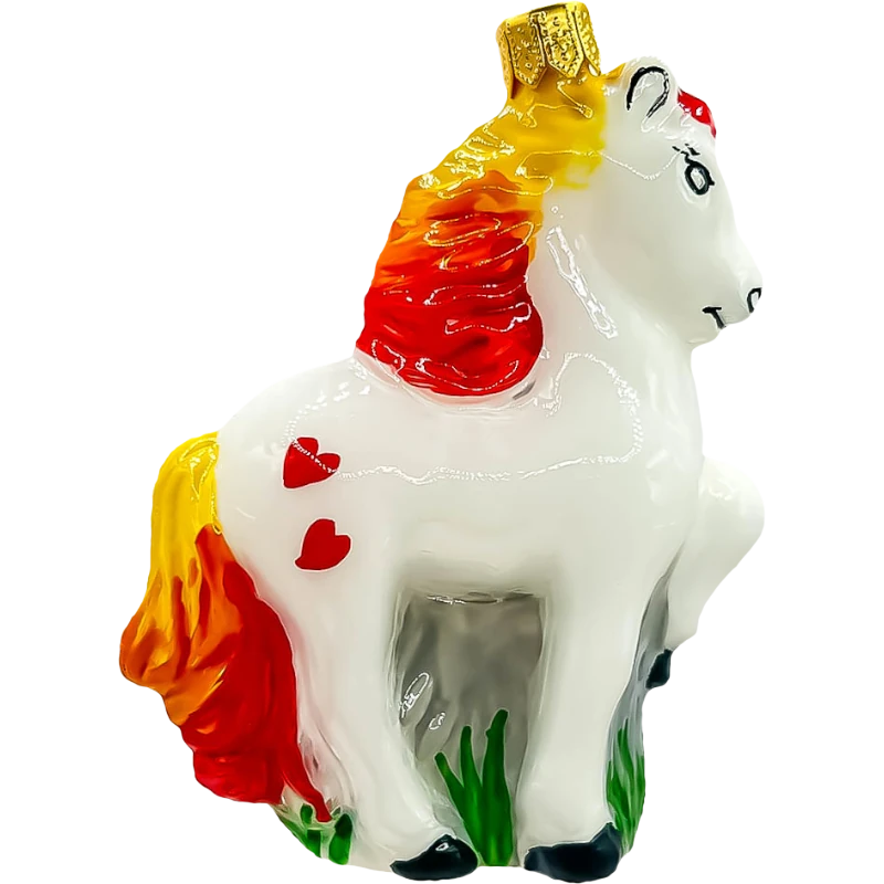 Dodaj swojej choince wyjątkowego, bajkowego charakteru dzięki bombce w kształcie konika. Ta ręcznie malowana ozdoba przedstawia uroczego konika o białym umaszczeniu, ozdobionego żywymi detalami: płomienną grzywą w odcieniach żółci, pomarańczu i czerwieni oraz subtelnymi, czerwonymi sercami na boku. Bombka przyciąga uwagę nie tylko nietuzinkowym wyglądem, ale także wysoką jakością wykonania, co czyni ją idealnym wyborem dla miłośników unikatowych i fantazyjnych dekoracji świątecznych.