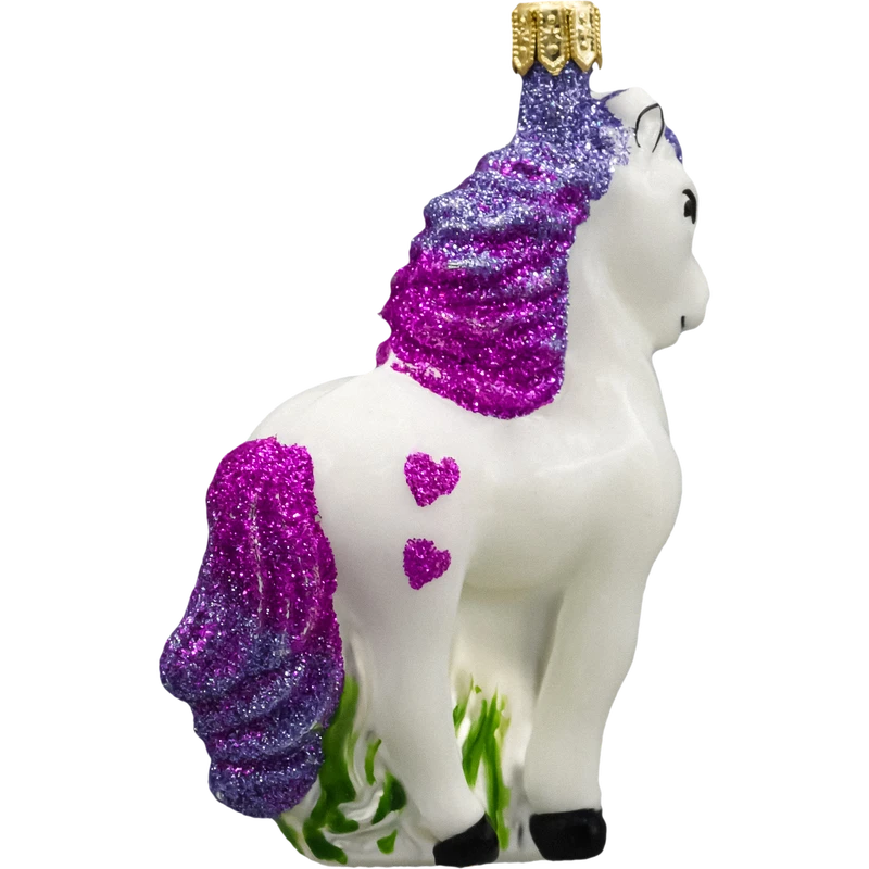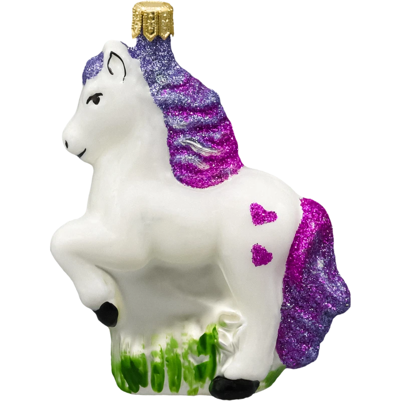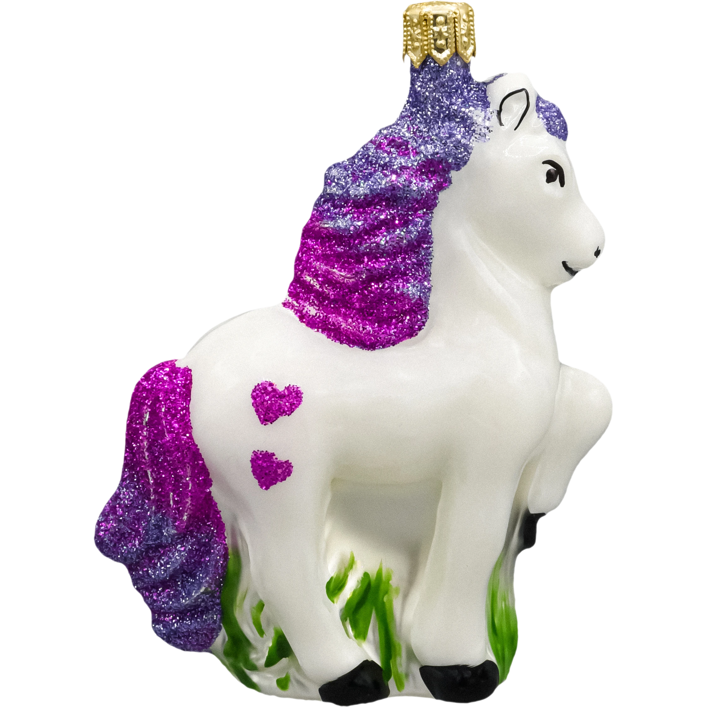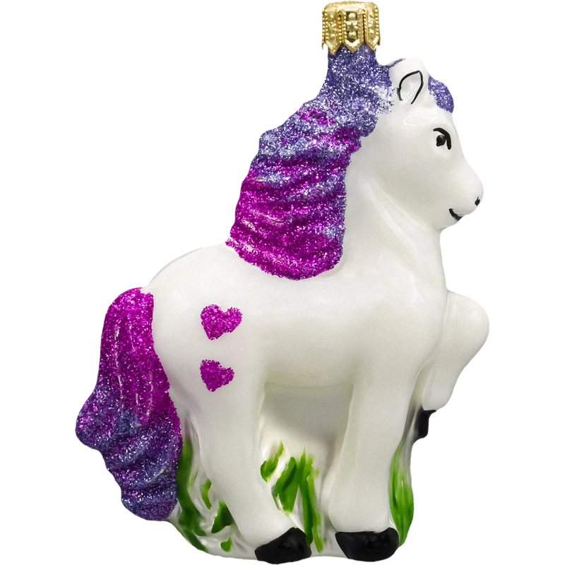 Przenieś magię i bajkowy urok do swojego świątecznego wystroju dzięki tej ręcznie wykonanej szklanej ozdobie w kształcie jednorożca. Ta bombka zachwyca swoją piękną, błyszczącą grzywą w odcieniach fioletu i różu, które zostały dodatkowo podkreślone brokatem. Urocze, brokatowe serduszka na bokach dodają ozdobie jeszcze więcej słodyczy, a subtelnie malowane detale, takie jak kopyta i oczy, nadają jej realistycznego wyglądu.