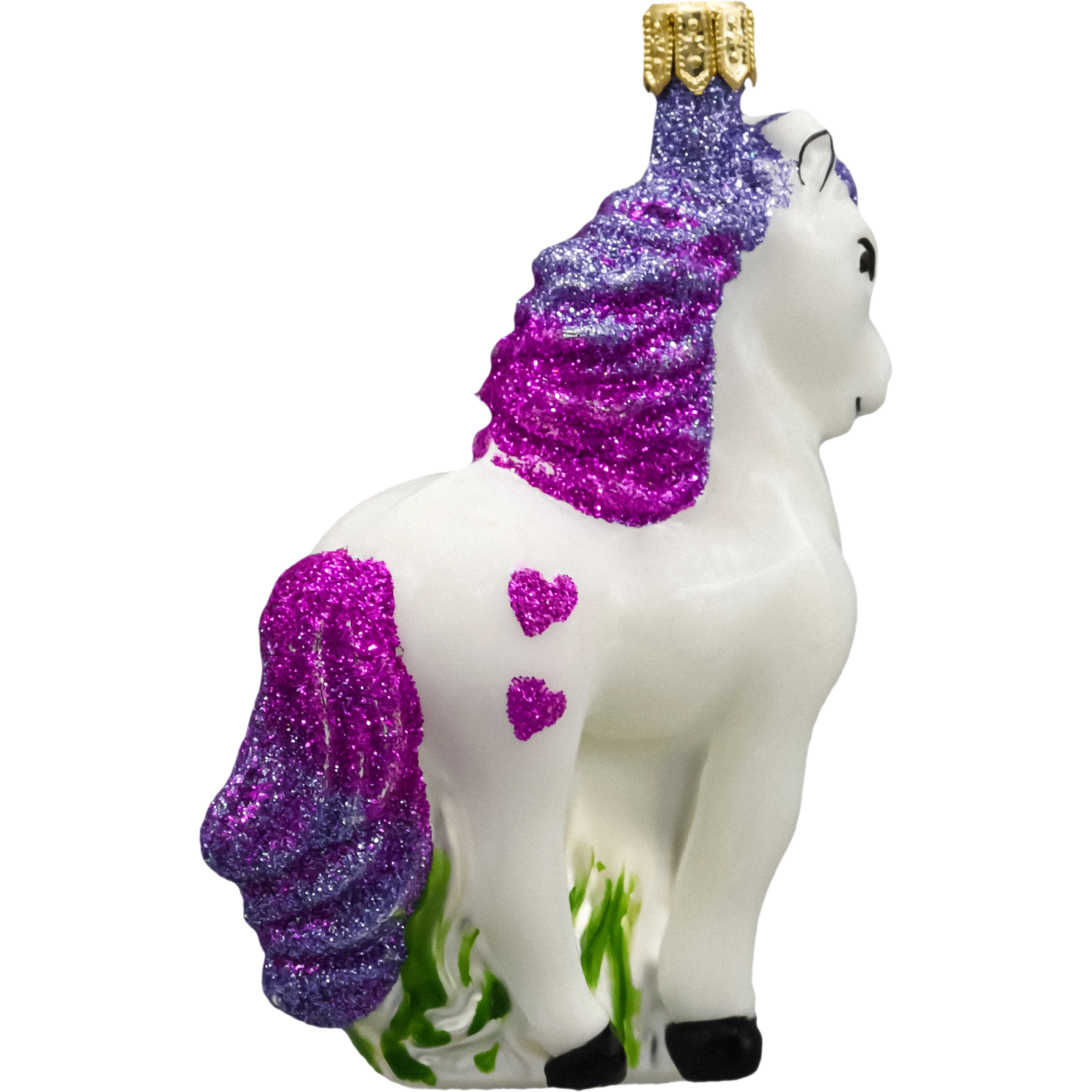 Wykończenie: Błyszczące, brokatowe detale na grzywie i ogonie, oraz serduszka na bokach dodają bombce magii i świątecznego blasku.