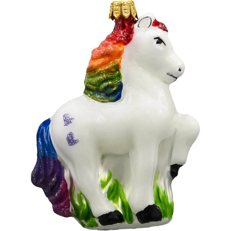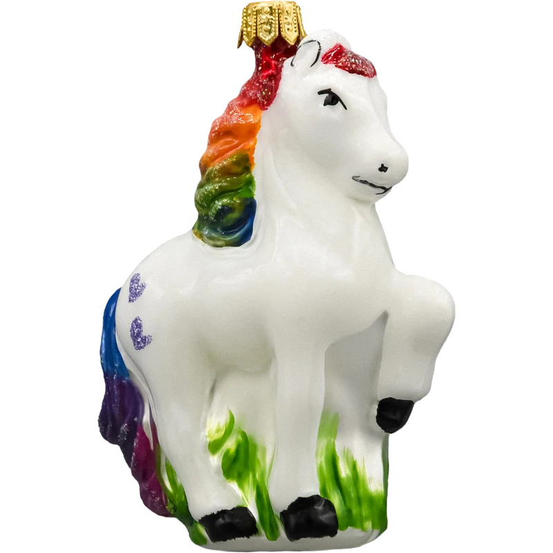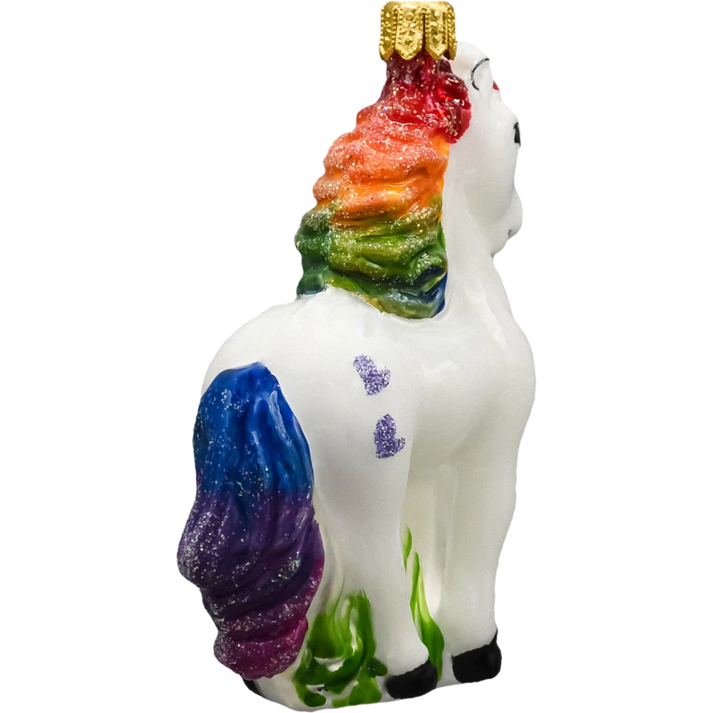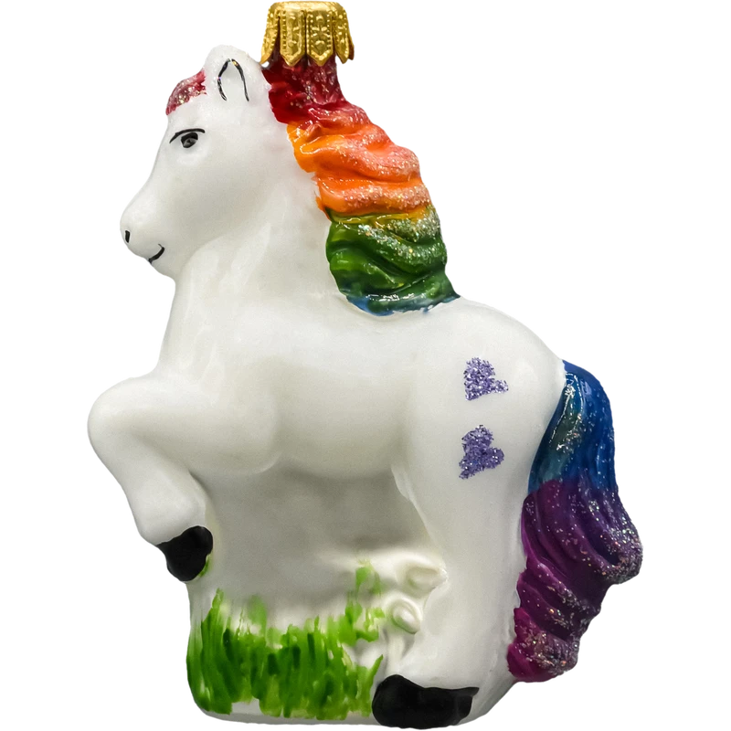 Zamów teraz tę szklaną ozdobę choinkową w kształcie jednorożca z tęczową grzywą i dodaj swojej choince fantazyjnego, kolorowego blasku, który zachwyci zarówno dzieci, jak i dorosłych!