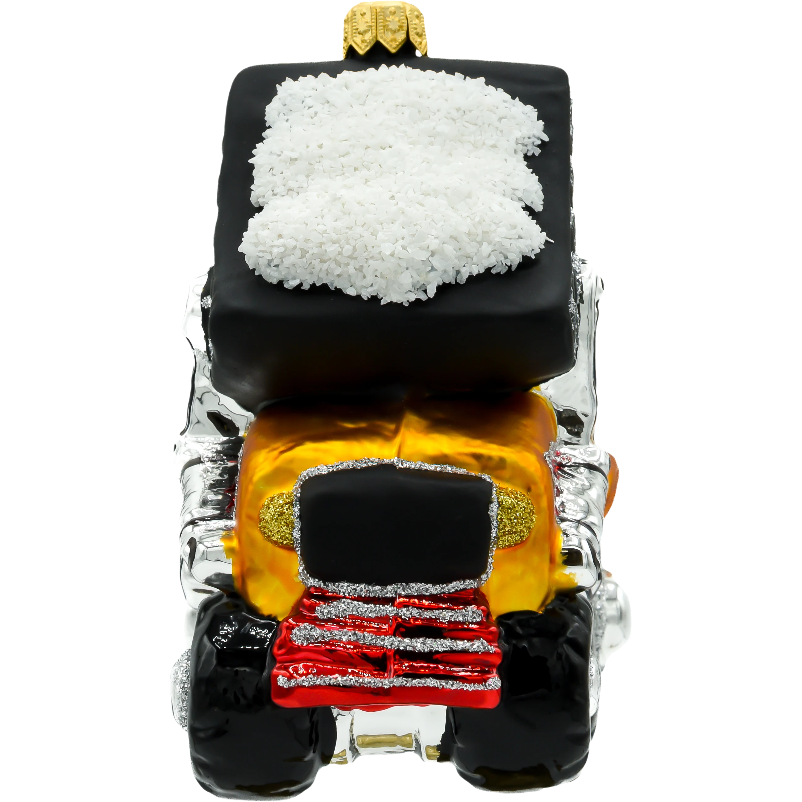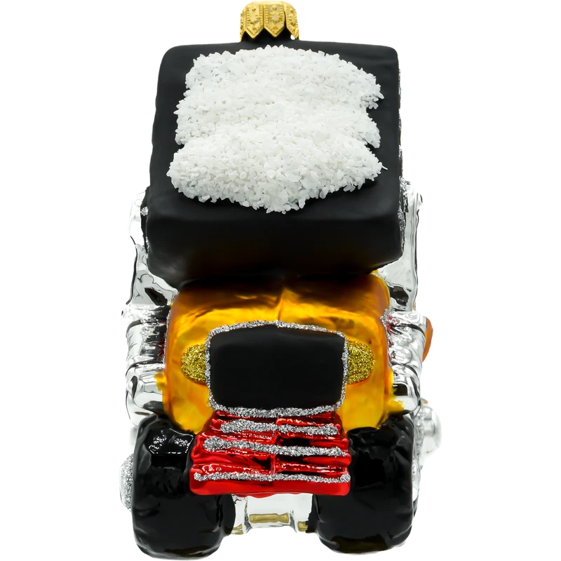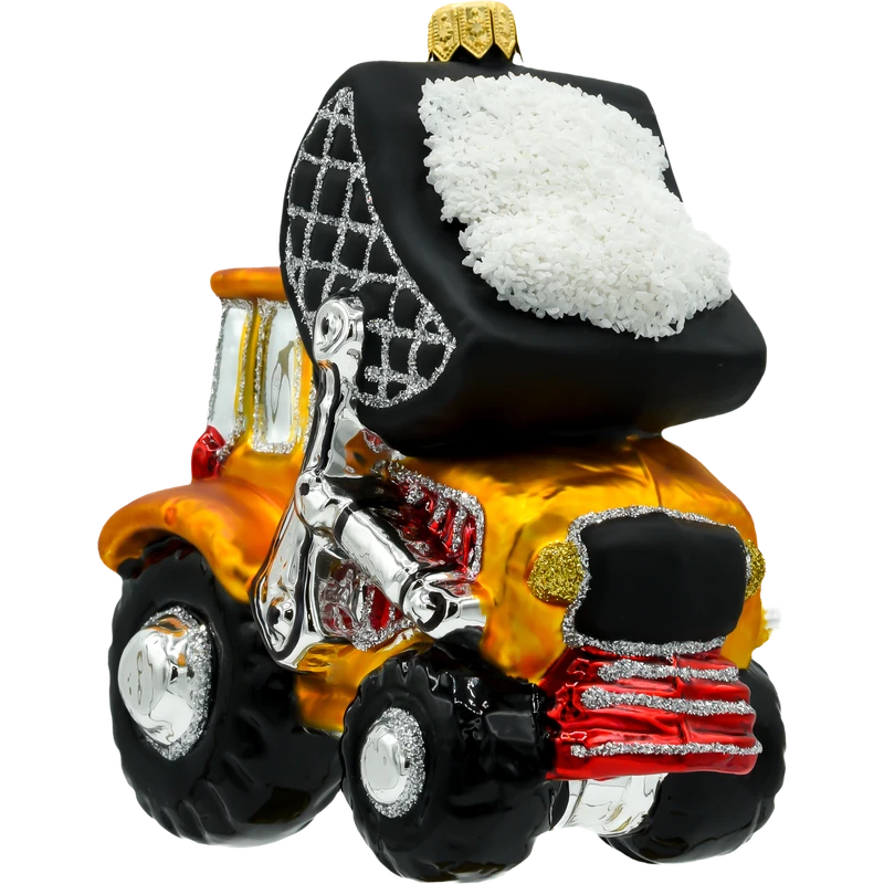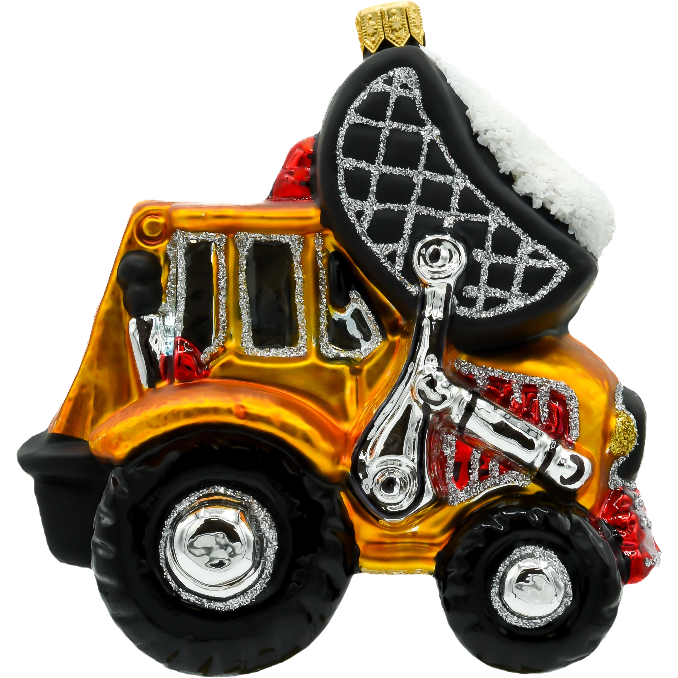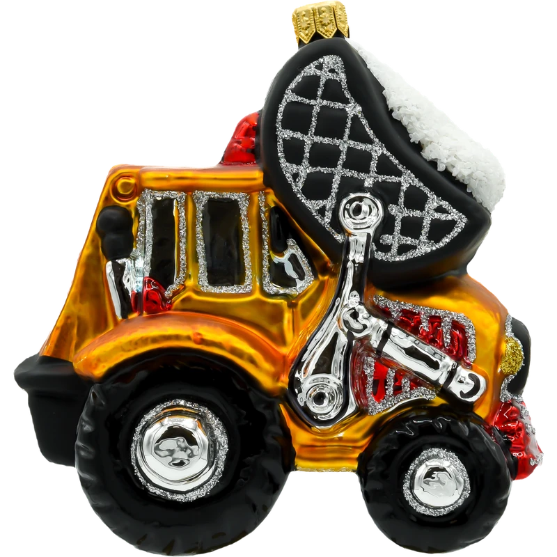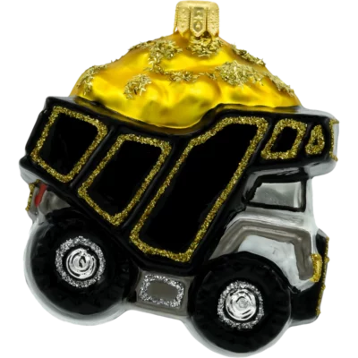 Bombka w kształcie koparki o złotym nadwoziu i detalach, takich jak srebrne ramię, brokatowe detale oraz charakterystyczne czarne koła, tworzy niezwykle realistyczną i przykuwającą wzrok ozdobę.