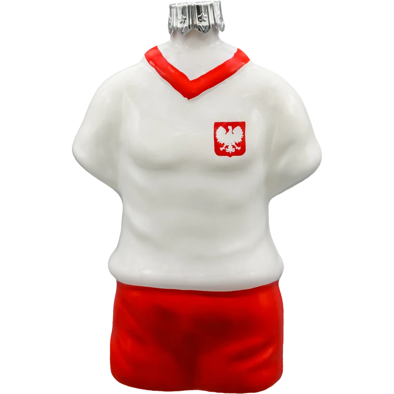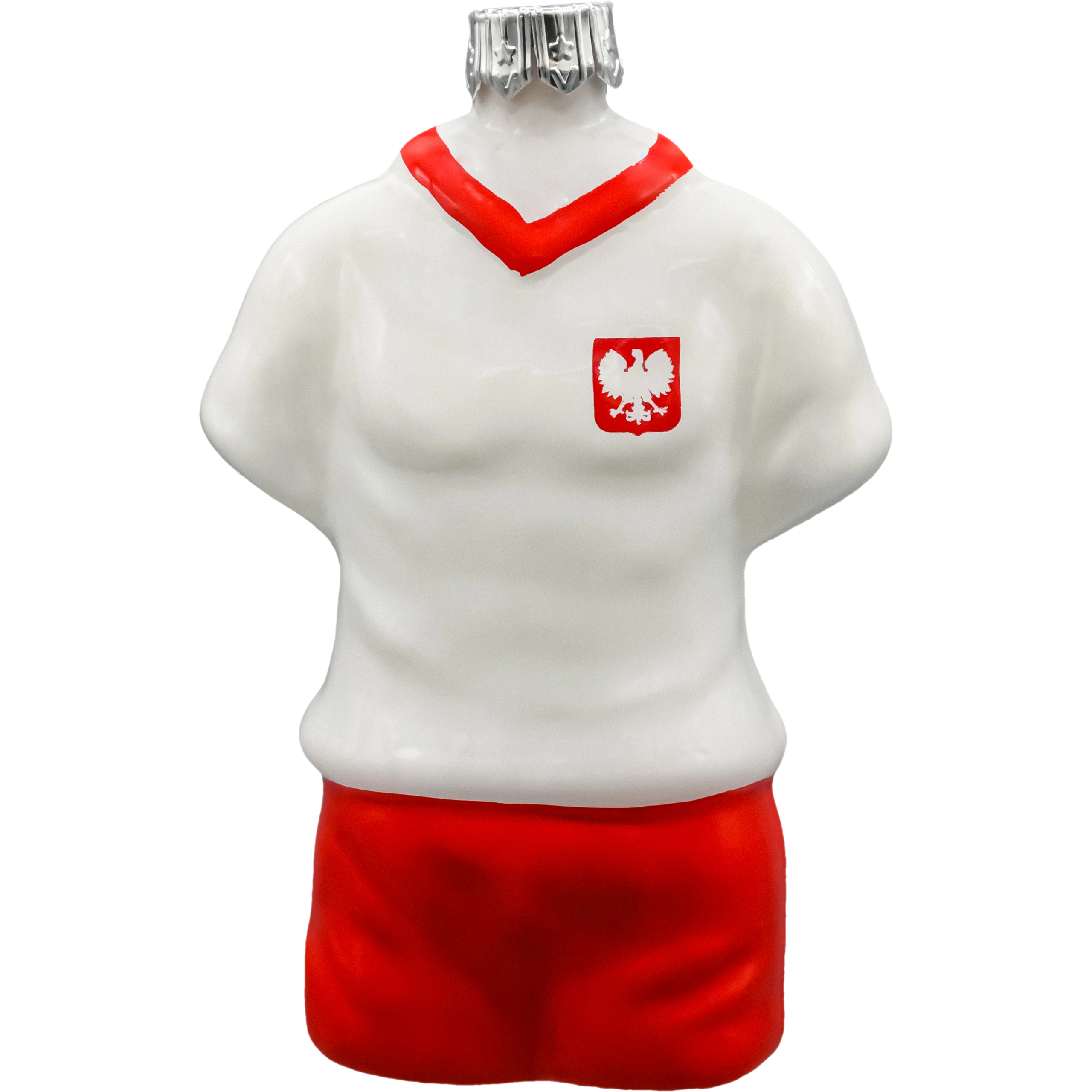 Dodaj do swojej choinki sportowego ducha i narodowej dumy dzięki wyjątkowej szklanej bombce w kształcie koszulki reprezentacji Polski. Ta starannie wykonana dekoracja przedstawia klasyczny biało-czerwony strój, z widocznym na piersi godłem Polski – białym orłem. To doskonały prezent dla każdego fana piłki nożnej i miłośnika świątecznych tradycji.
