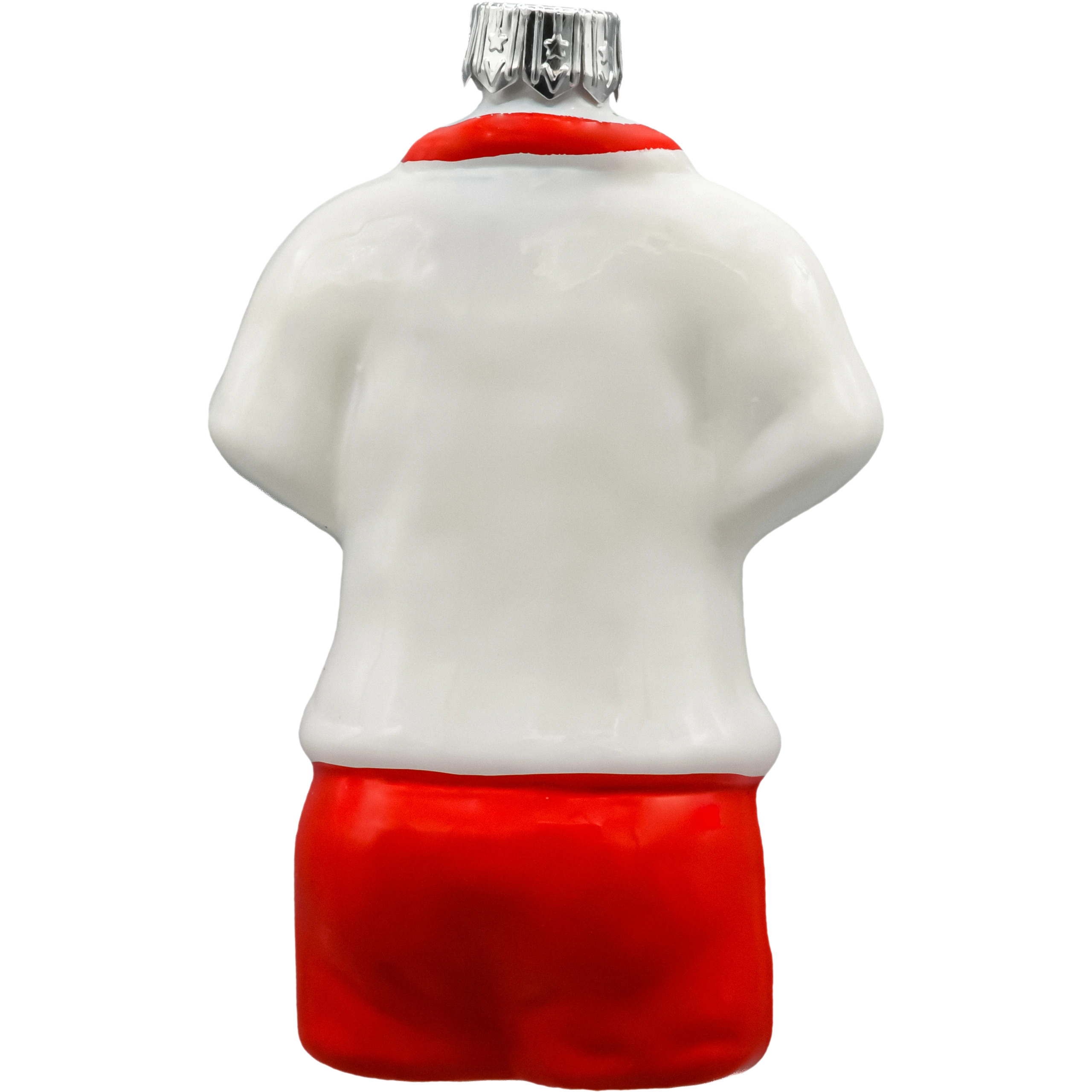 Bombka została ręcznie wykonana ze szkła dmuchanego, następnie ręcznie malowana z najwyższą precyzją, aby oddać detale sportowego stroju. Błyszcząca powierzchnia nadaje jej elegancki wygląd, a klasyczne zestawienie kolorystyczne idealnie wpisuje się w biało-czerwoną estetykę świątecznych dekoracji.