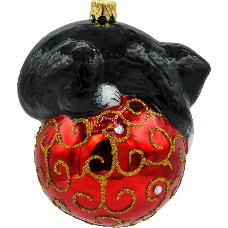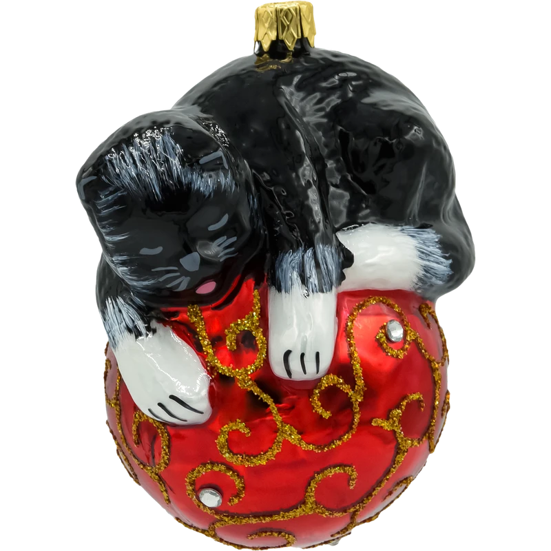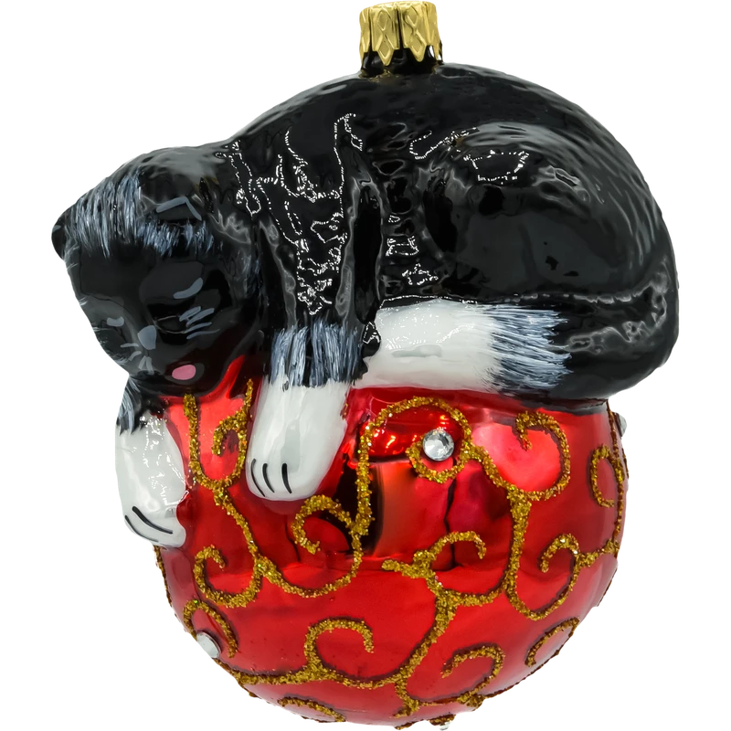 Szklana figurka przedstawia uroczego, czarnego śpiącego kotka z szarymi łatkami. Kotek śpi grzecznie na czerwonej bombce, co dodaje bombce uroku i charakterystycznego zwierzęcego akcentu. To dekoracja, która doskonale sprawdzi się zarówno na klasycznych, jak i nowoczesnych choinkach, a także jako prezent dla miłośników kotów, dzieci lub kolekcjonerów nietuzinkowych ozdób.