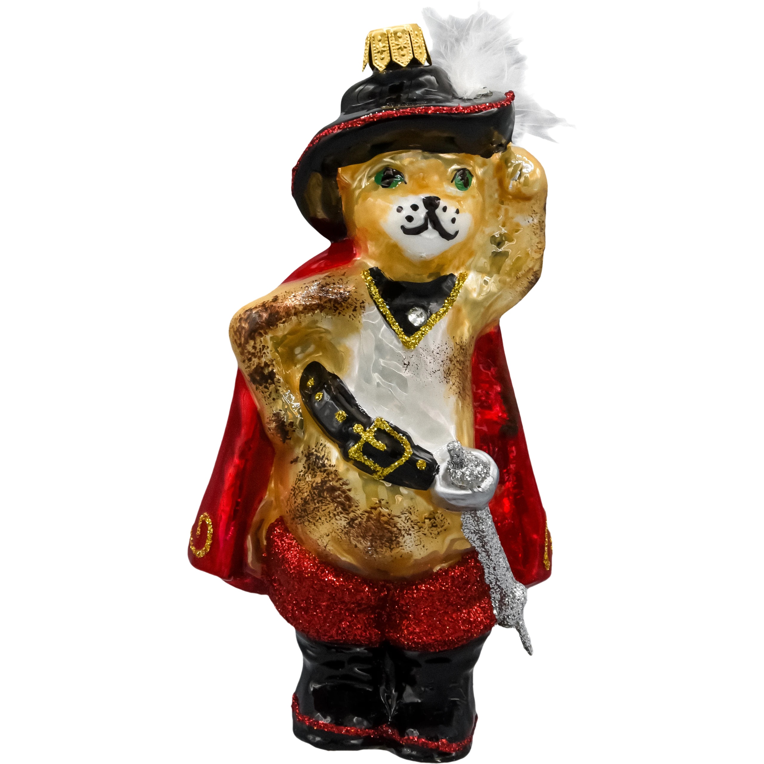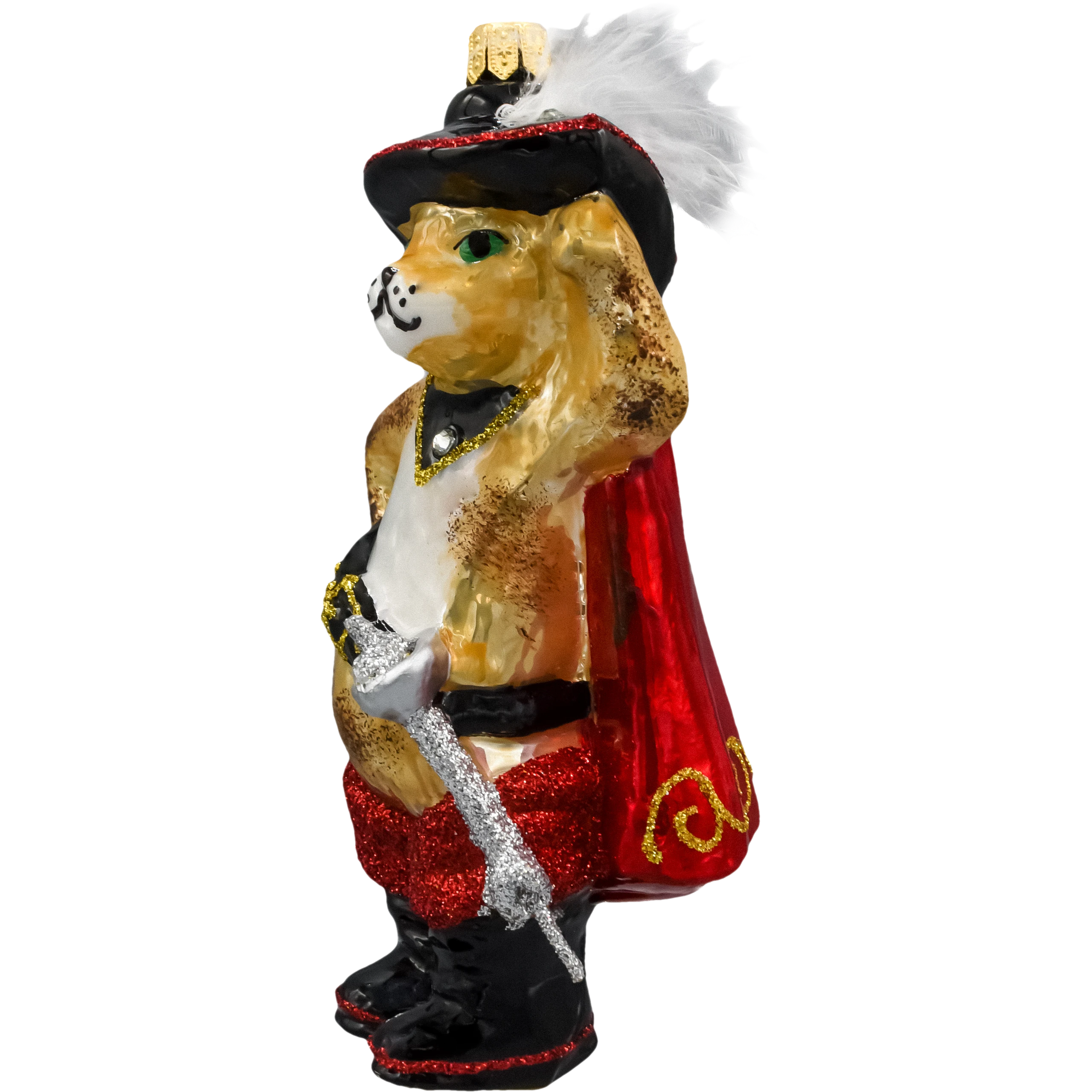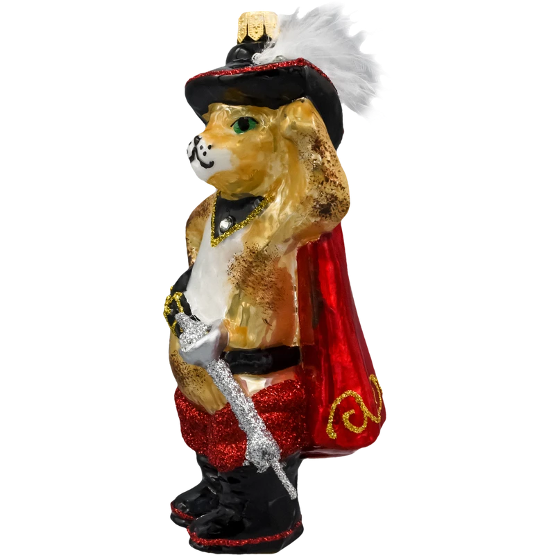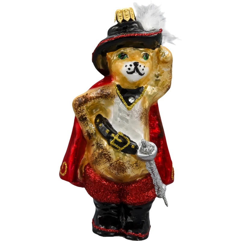 Ręcznie dmuchana, szklana bombka choinkowa „Kot w Butach z szablą w pelerynie” – bogato zdobiona brokatem i złotymi akcentami, z kapeluszem, peleryną i charakterystyczną szablą. Polska produkcja rzemieślnicza, unikatowa figurka idealna do bajkowych aranżacji choinki oraz na elegancki prezent dla miło