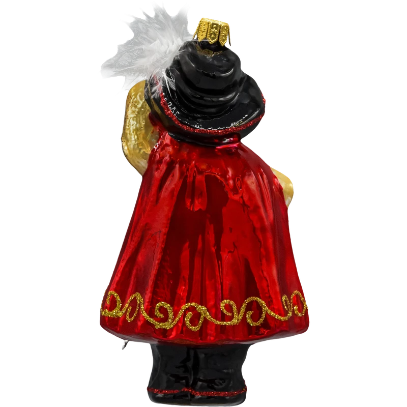 Wprowadź na swoją choinkę odrobinę bajkowej magii! Szklana bombka Kot w Butach to misternie wykonana, ręcznie dmuchana i ręcznie malowana ozdoba choinkowa, która zachwyca detalem: kapelusz z piórem, karminowa peleryna z łagodnym połyskiem, złote lamowania, pas z klamrą oraz połyskująca szabla. Figurkę wieńczy klasyczna, złota koronka do zawieszenia. To ozdoba świąteczna, która świetnie wygląda solo, a w zestawach buduje wyjątkową, bajkową aranżację drzewka.