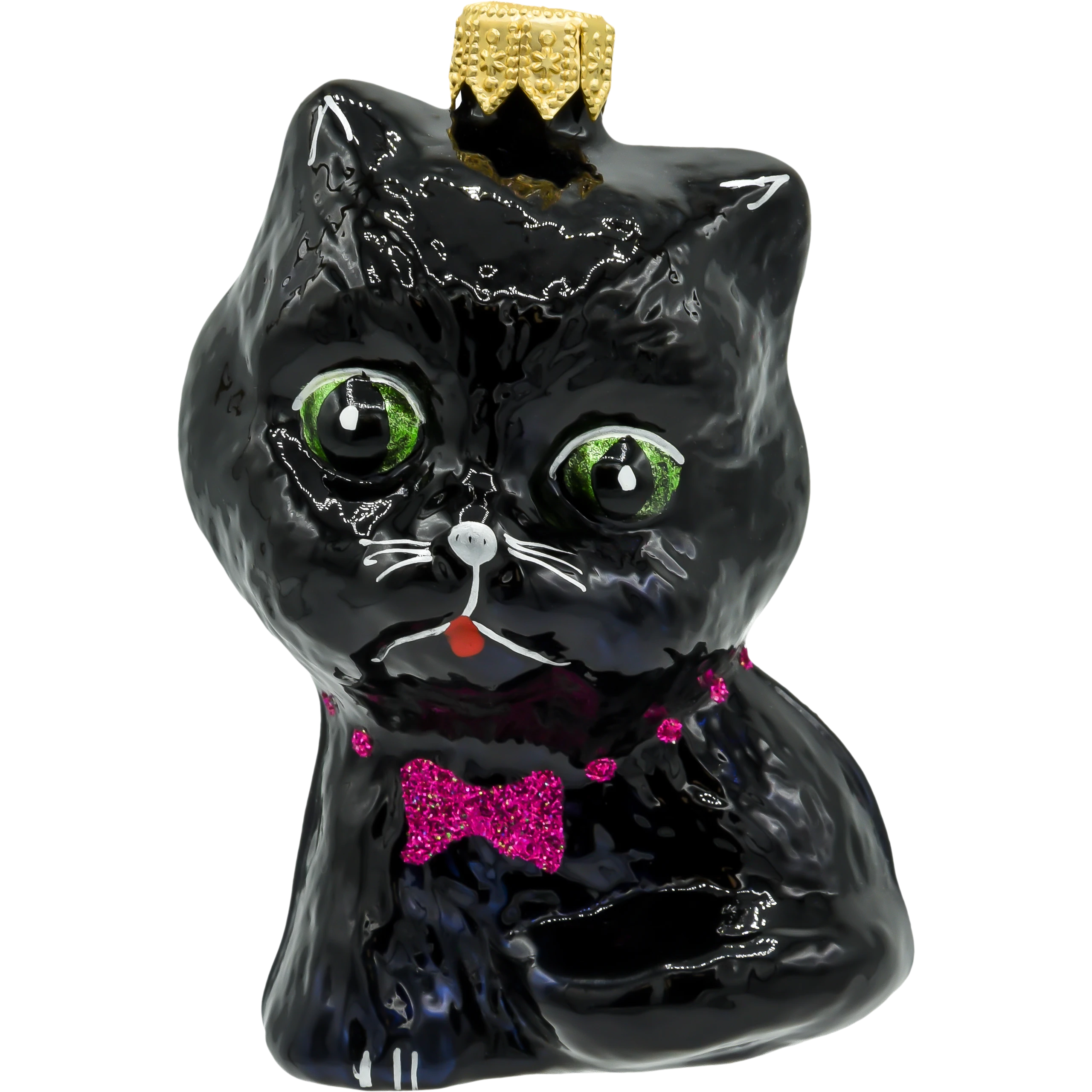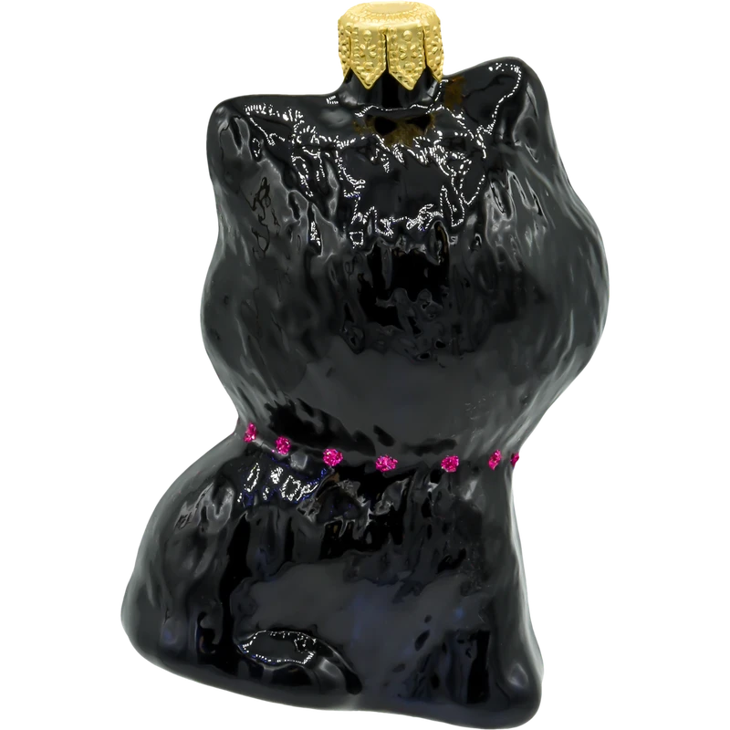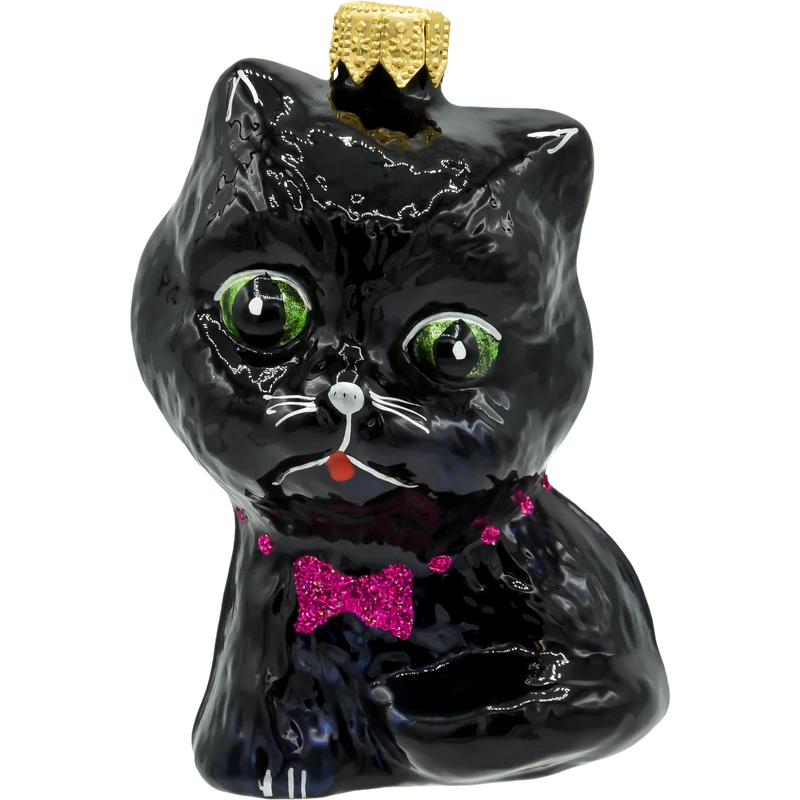 Wprowadź odrobinę uroku i zabawy do swojej świątecznej dekoracji dzięki tej uroczej, ręcznie wykonanej szklanej ozdobie choinkowej w kształcie czarno kota. Ta bombka, zrealizowana z dbałością o każdy szczegół, przedstawia słodkiego kotka z wyrazistymi zielonymi oczami, ozdobionego różową, błyszczącą muchą. To doskonały wybór dla miłośników zwierząt oraz osób poszukujących unikalnych i oryginalnych dekoracji na choinkę.