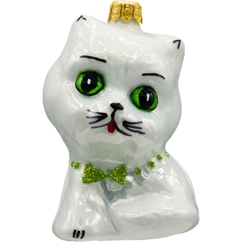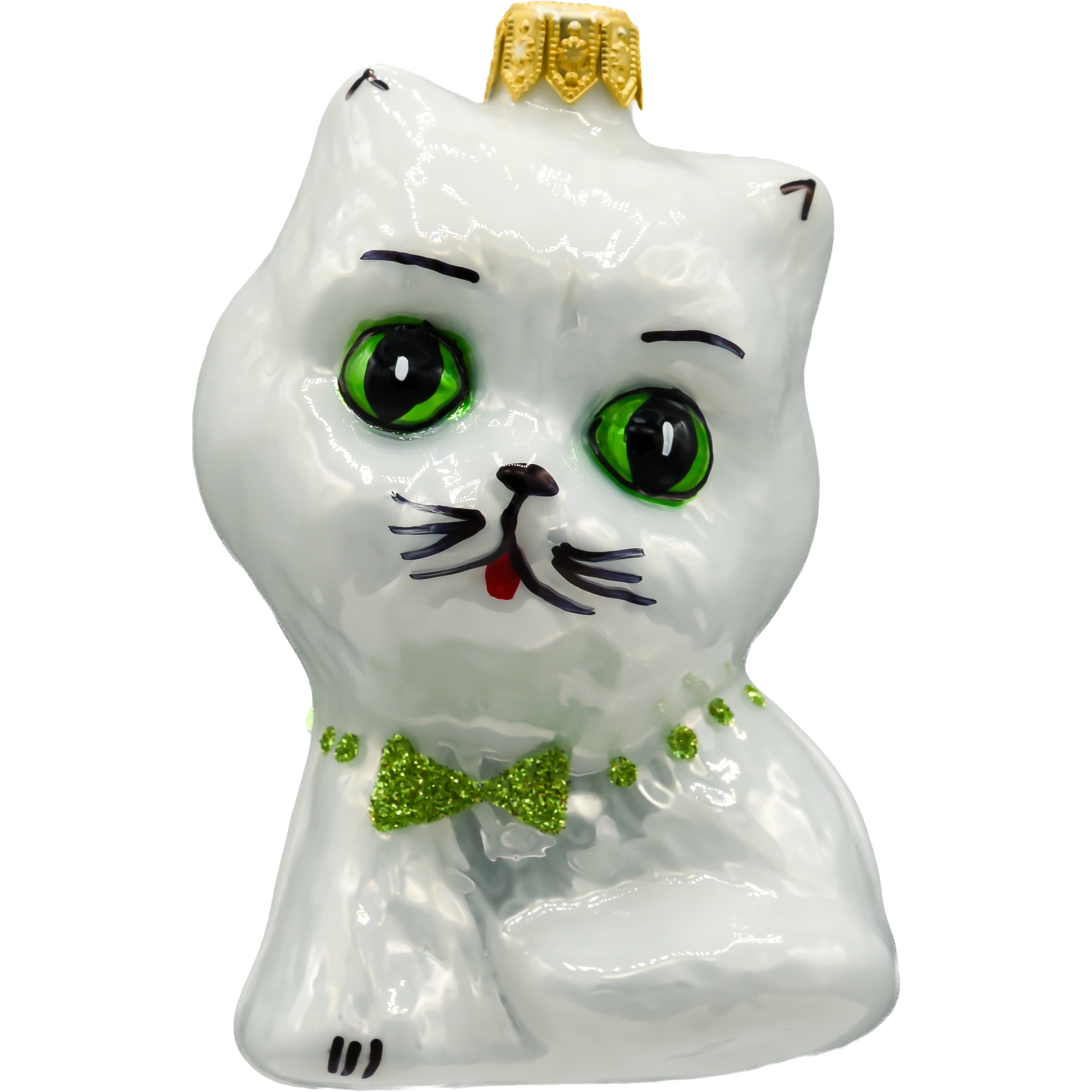 Wprowadź odrobinę elegancji i uroku do swojego świątecznego drzewka z tą ręcznie wykonaną szklaną ozdobą w kształcie kota. Ta bombka to wyjątkowa propozycja dla miłośników zwierząt, a szczególnie kotów. Precyzyjnie malowana, wyróżnia się dużymi, zielonymi oczami oraz uroczym zielonym brokatowym muszkiem, który nadaje jej eleganckiego charakteru. Ozdoba ta doskonale pasuje do każdej świątecznej aranżacji, dodając jej odrobiny zabawy i stylu.
