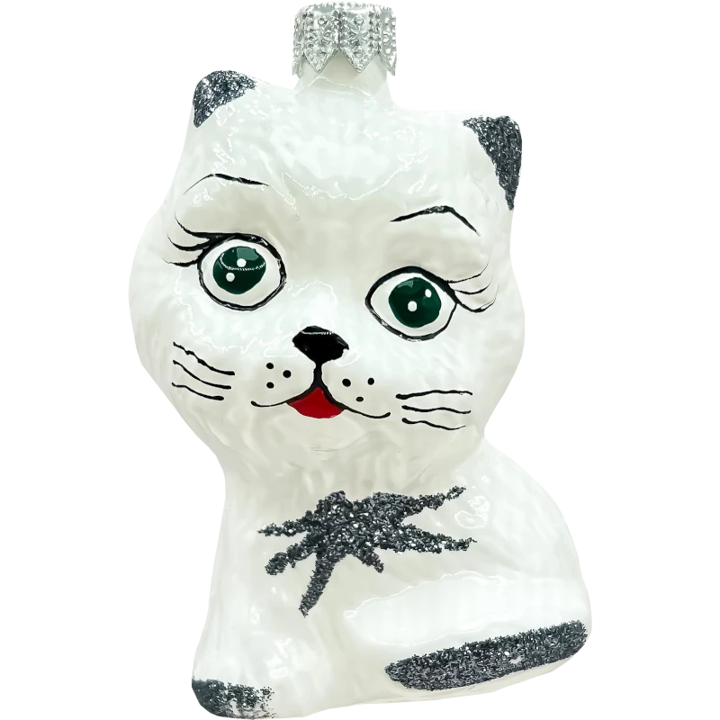Kolory: Śnieżnobiała bombka z wyrazistymi zielonymi oczami, czarnymi wąsami oraz srebrzystym brokatem na detalach, takich jak uszy, ogon i łapki.