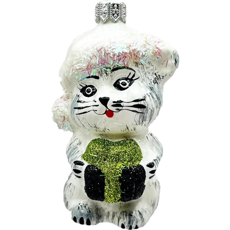 Bombka została wykonana z wysokiej jakości szkła, co zapewnia jej trwałość i piękny połysk. Kotek ubrany jest w czapkę z brokatowym wykończeniem, a w łapkach trzyma zielony prezent, który również mieni się brokatem. Jego urocza mina i starannie malowane detale sprawiają, że bombka ta będzie wyjątkową ozdobą Twojej choinki, dodając jej radosnego i świątecznego charakteru.