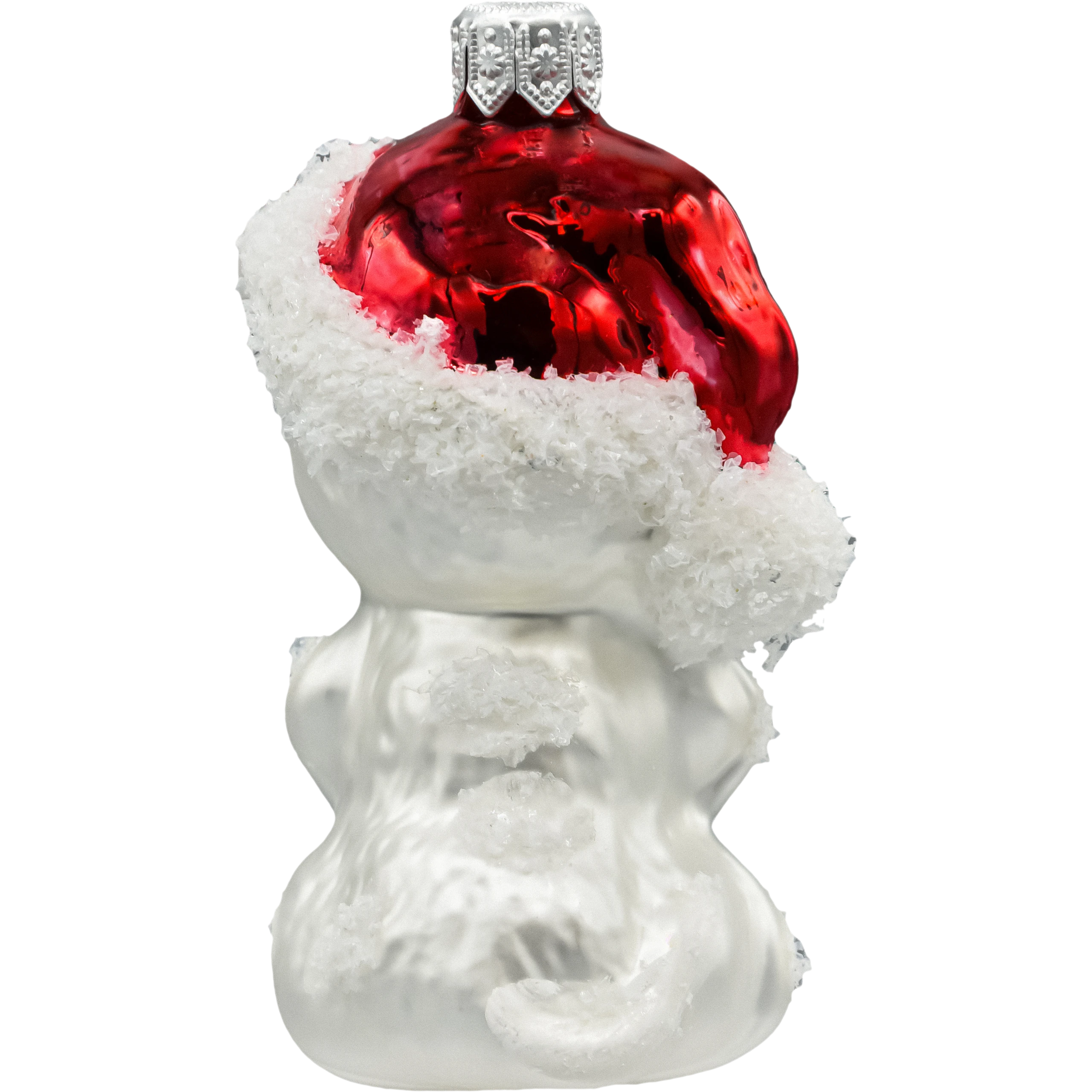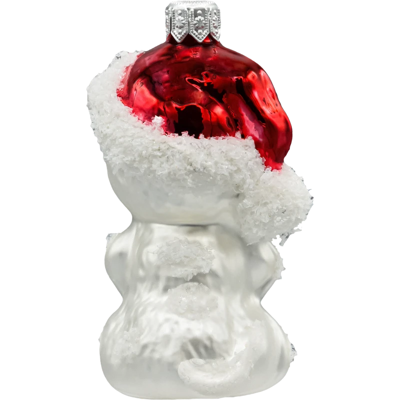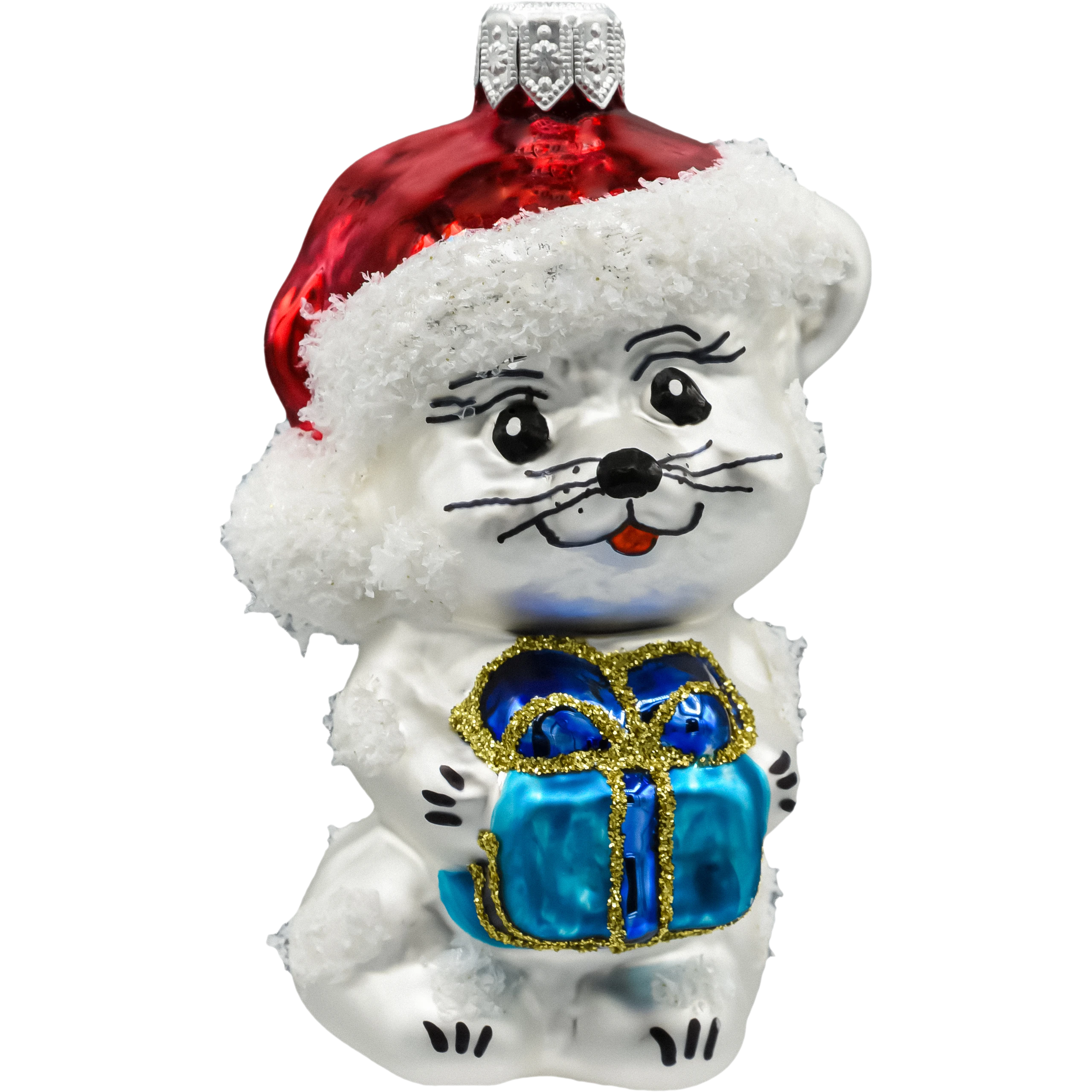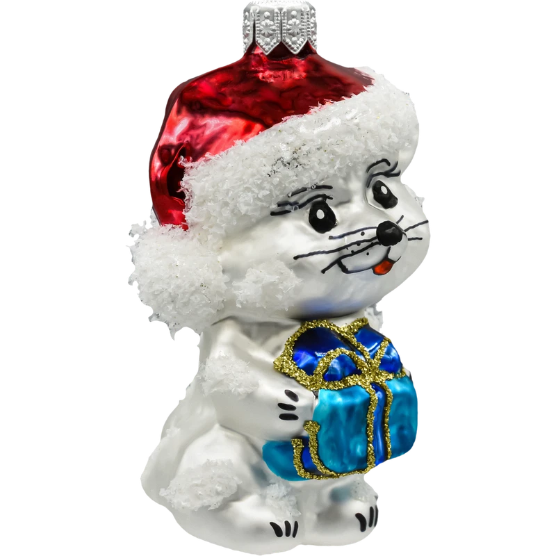 Szklana bombka choinkowa kotek z prezentem i czapką Mikołaja – ręcznie malowana figurka z dmuchanego szkła. Idealna ozdoba świąteczna na choinkę. Polski produkt.