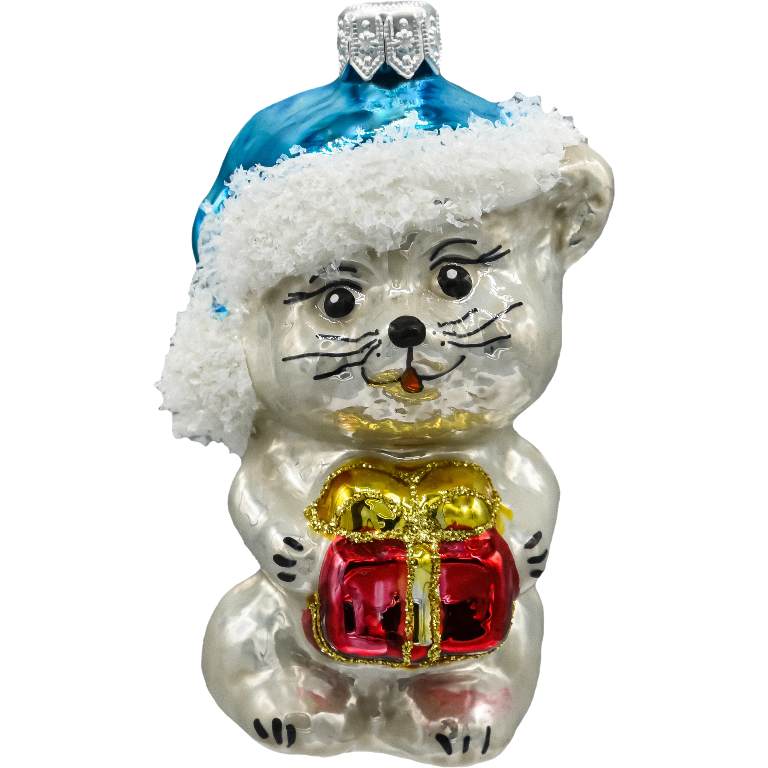 Szklana bombka choinkowa świąteczny kotek z prezentem w błękitnej czapce. Ręcznie malowana figurka świąteczna ze szkła dmuchanego. Idealna ozdoba choinkowa i prezent na Boże Narodzenie.