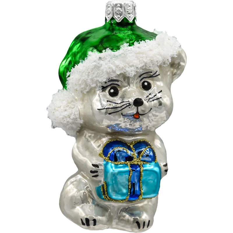 Szklana bombka choinkowa „Kotek Świąteczny z prezentem” to urocza ręcznie wykonana ozdoba świąteczna, która wprowadzi do wnętrza odrobinę magii i dziecięcej radości. Figurka przedstawia srebrzystą foczkę w zielonej, połyskującej czapce Mikołaja obszytej puszystym, białym futerkiem. W łapkach trzyma błękitno-niebieski prezent przewiązany złotą wstążką z brokatu, który mieni się w świetle choinkowych lampek.