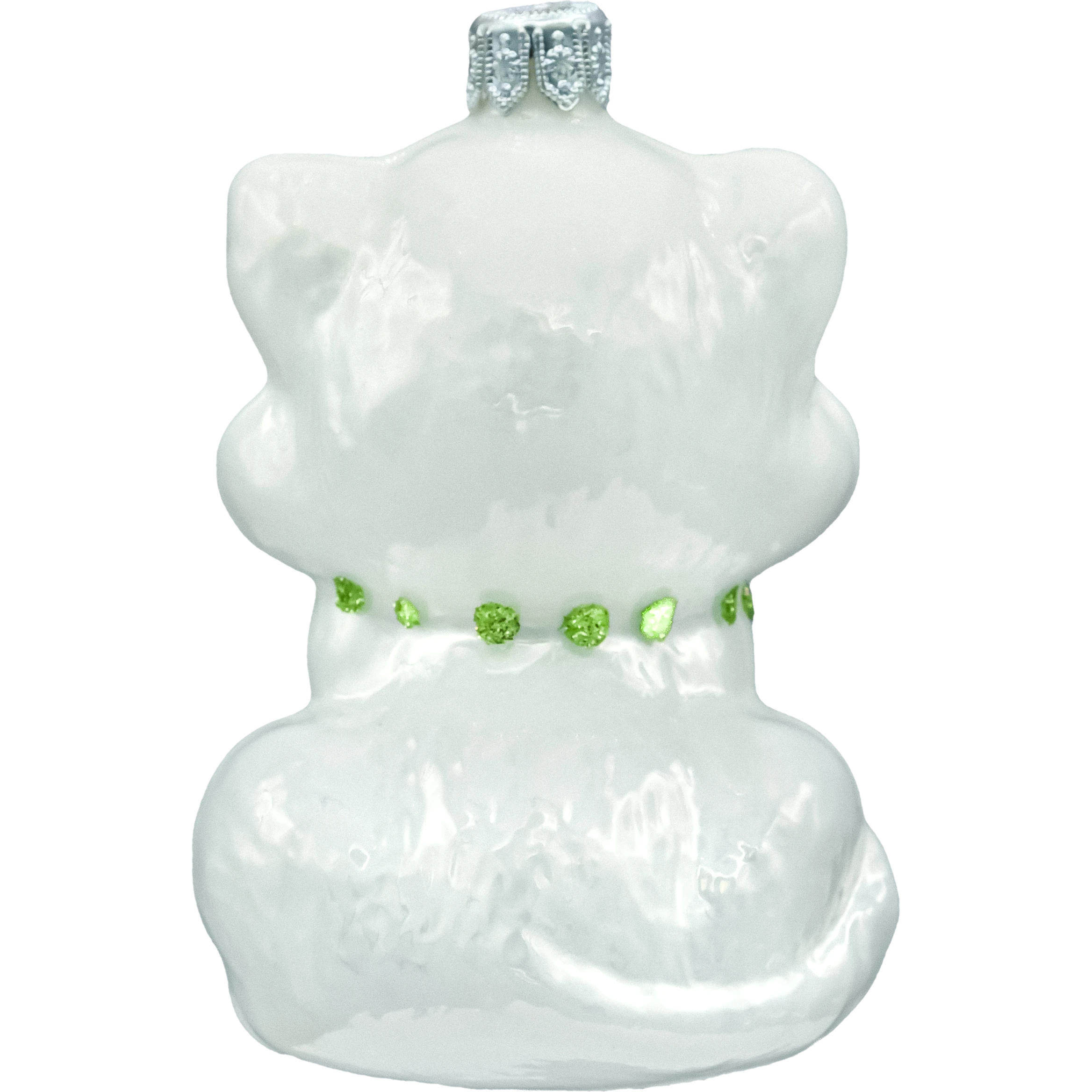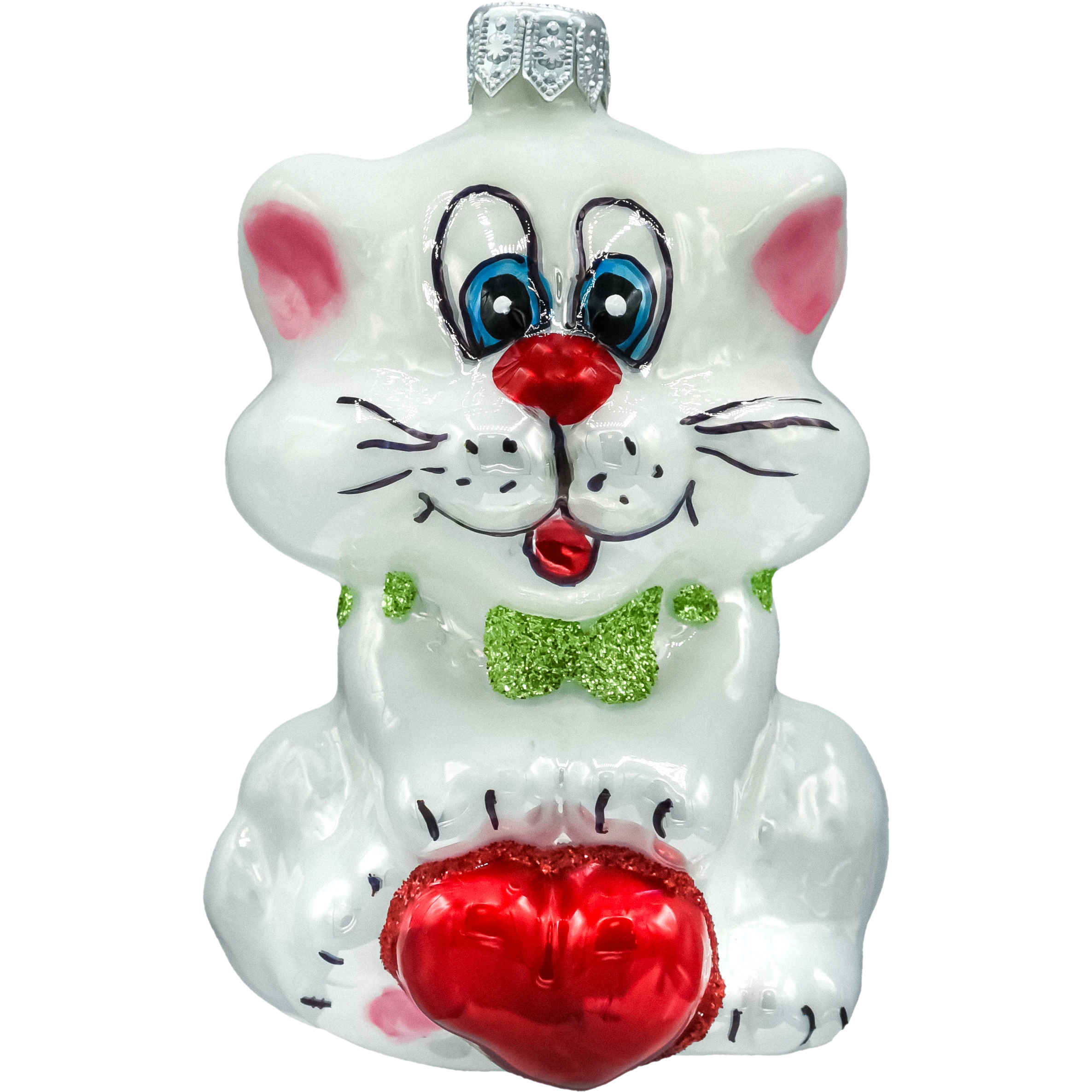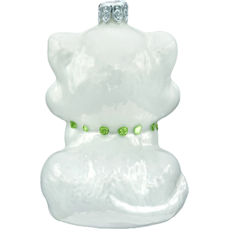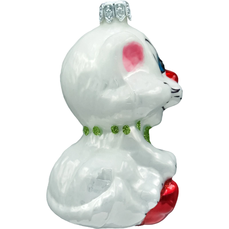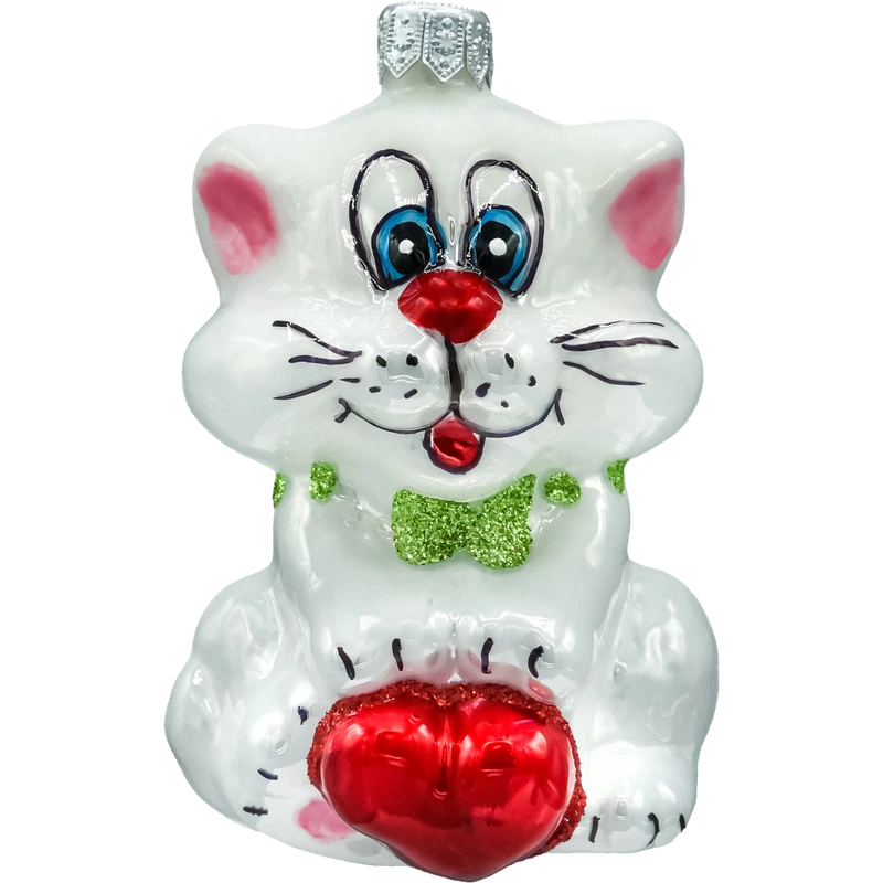 Urocza bombka szklana „Kotek z sercem” 10 cm – ręcznie malowana figurka w perłowej bieli z czerwonym serduszkiem i brokatową zieloną kokardką. Lekka, połyskująca i pełna uroku ozdoba choinkowa dla kociarzy, idealna na prezent i do świątecznych aranżacji.