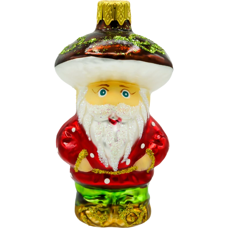 Wprowadź do swojej choinki odrobinę bajkowego klimatu dzięki tej niezwykłej bombce choinkowej w kształcie krasnala z grzybowym kapeluszem. Ręcznie wykonana ze szkła i misternie malowana, przedstawia sympatyczną postać z białą brodą, czerwonym kubraczkiem w białe grochy i wielkim kapeluszem przypominającym borowika lub prawdziwka, udekorowanym zielonym brokatem. To ozdoba, która zachwyci zarówno dzieci, jak i dorosłych.