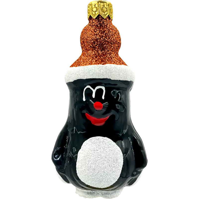 Kolorystyka: Głęboka czerń postaci krecika kontrastuje z jasnym, brokatowym wykończeniem czapki i detali. Intensywna czerwień nosa i uśmiechu dodaje całości radosnego akcentu, który idealnie wkomponuje się w świąteczny klimat.