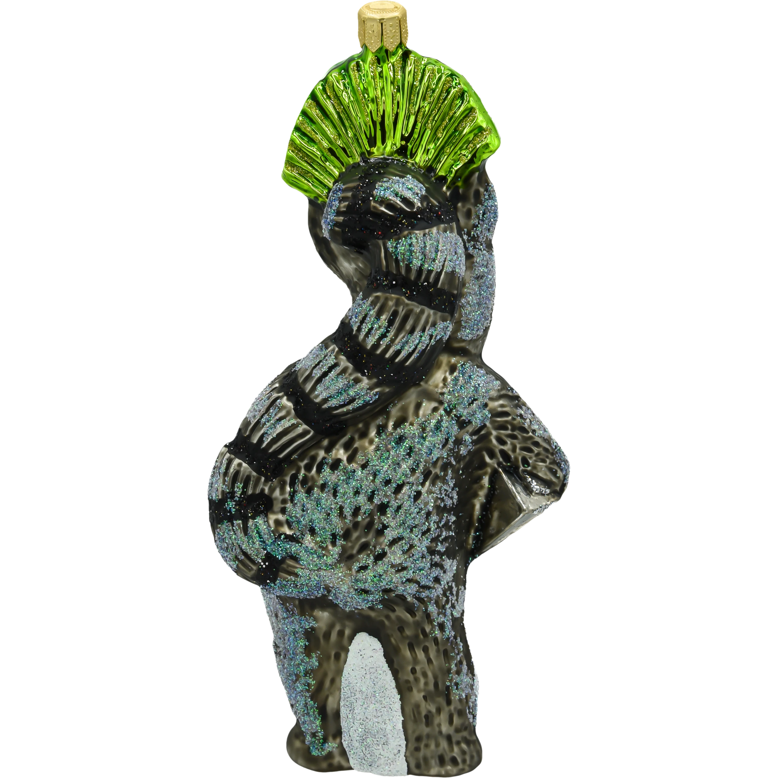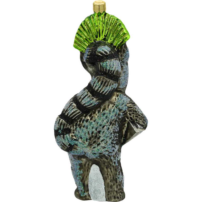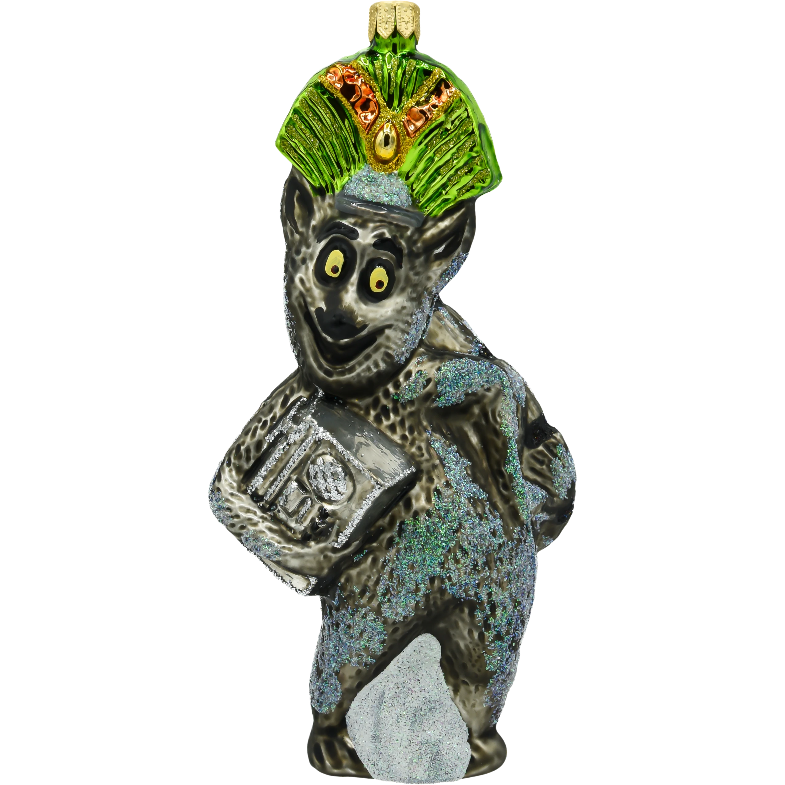 Dodaj odrobinę humoru i bajkowej magii do swojej choinki dzięki tej oryginalnej bombce w kształcie Króla Julka– kultowego lemura z uwielbianego przez dzieci i dorosłych. Bombka wykonana została ze szkła i przedstawia postać zwierzęcego monarchy z charakterystycznym szerokim uśmiechem, szeroko otwartymi oczami i majestatyczną zielono-złotą koroną ozdobioną brokatem. W jednej łapce Król Julian trzyma srebrne radio, co jeszcze bardziej podkreśla jego taneczną, zwariowaną osobowość.