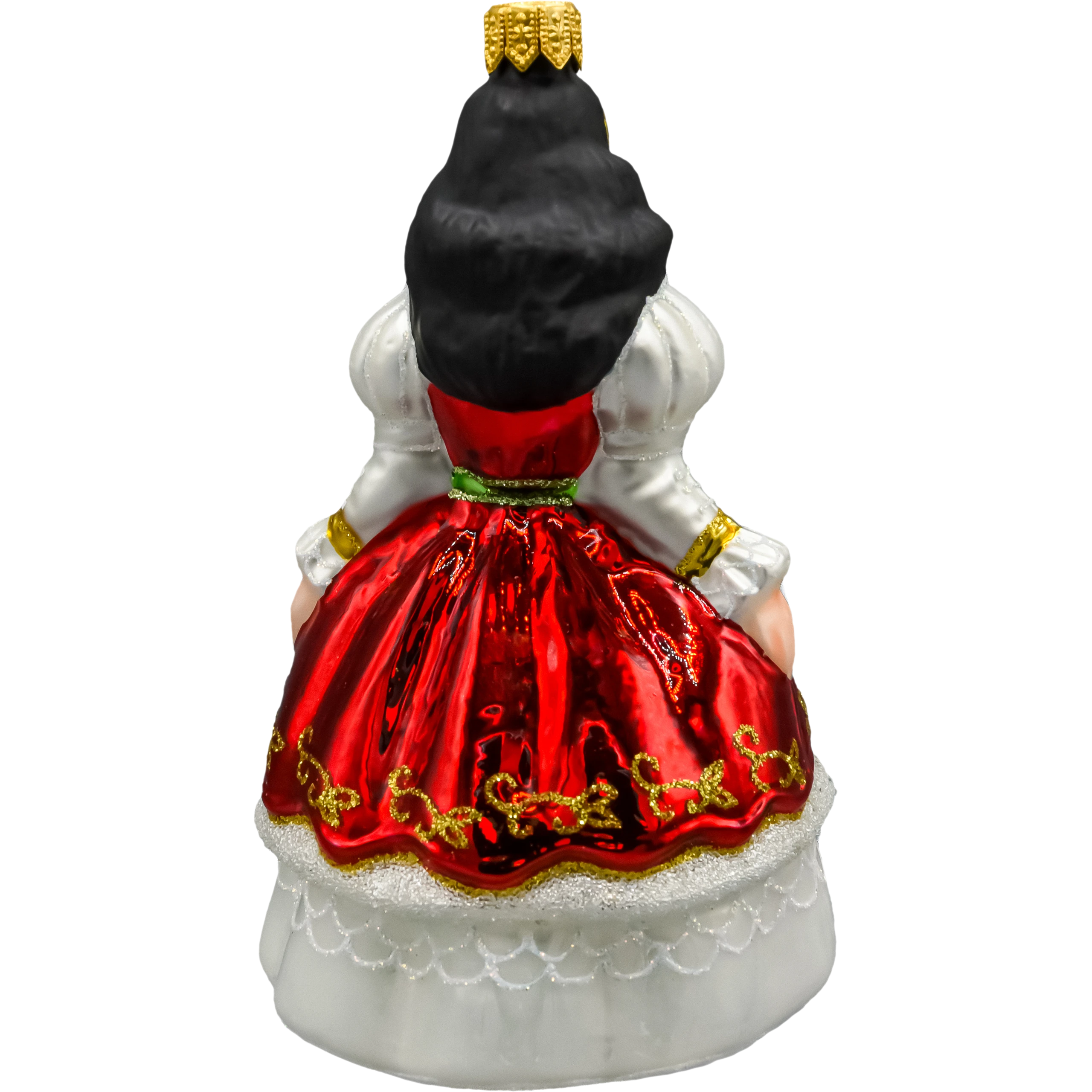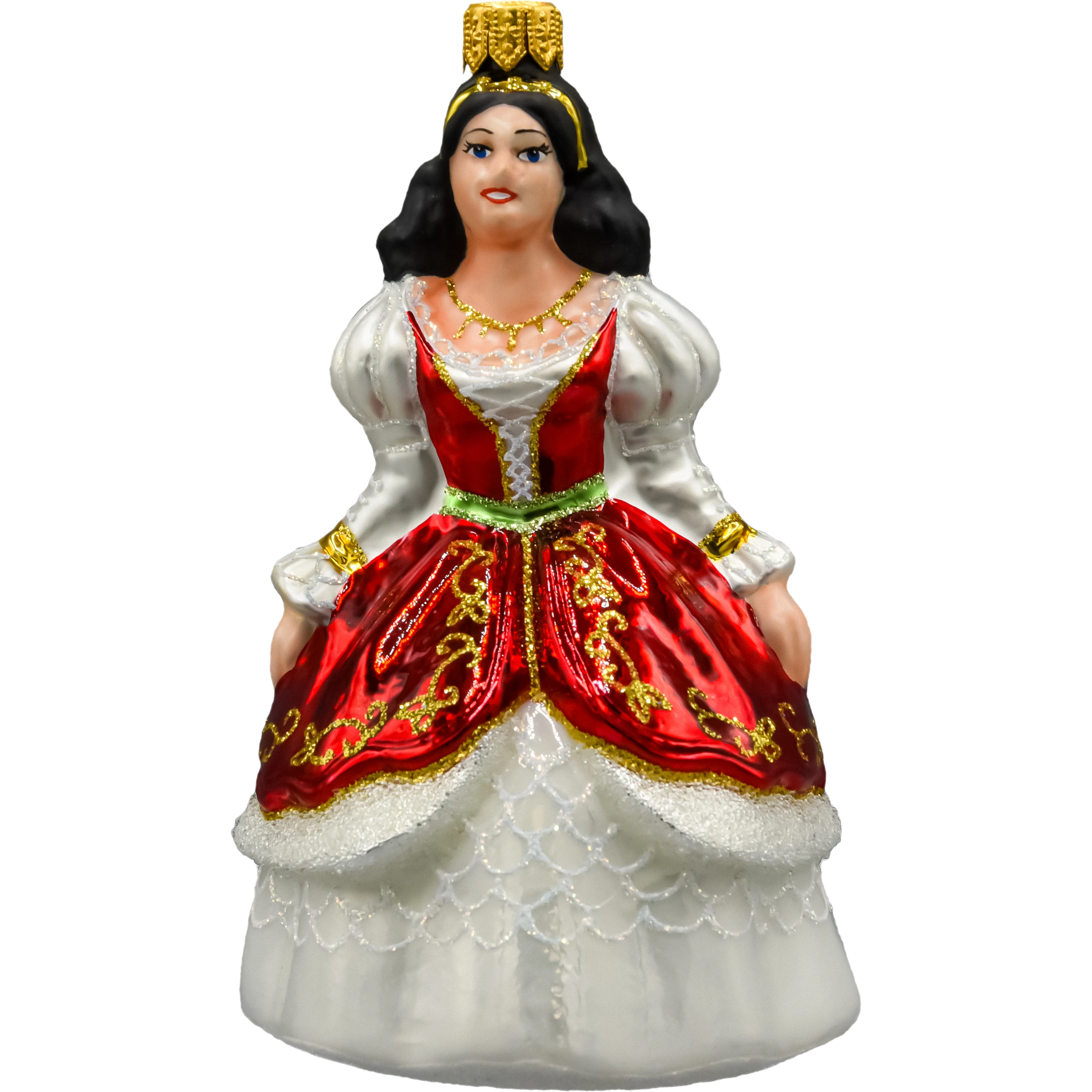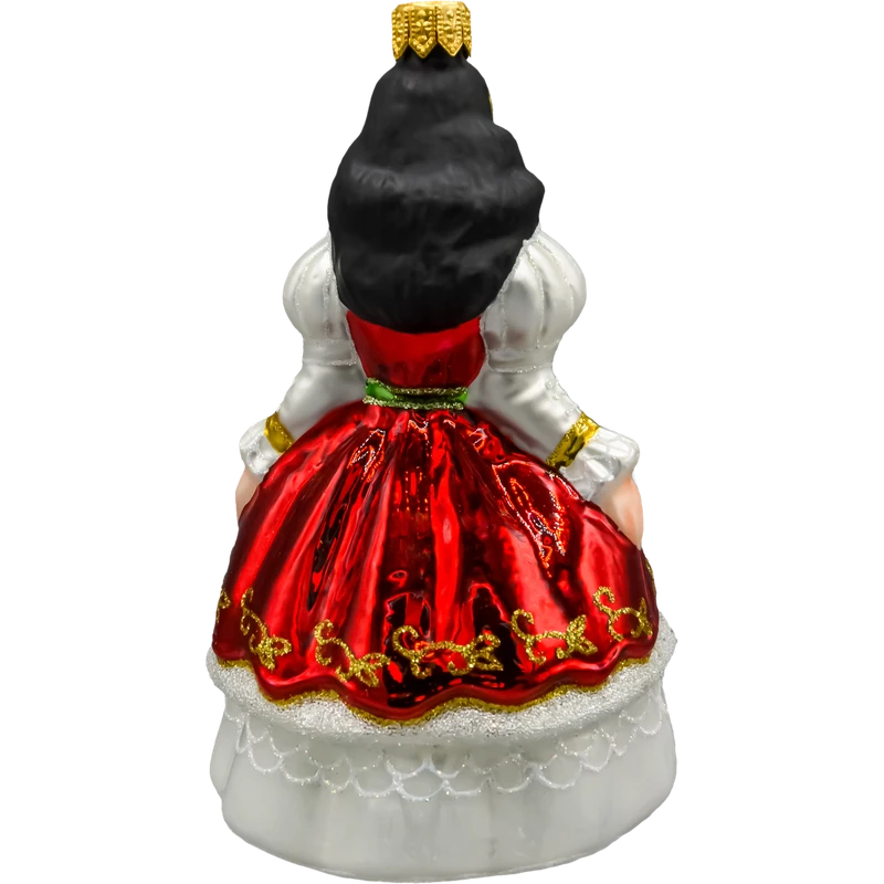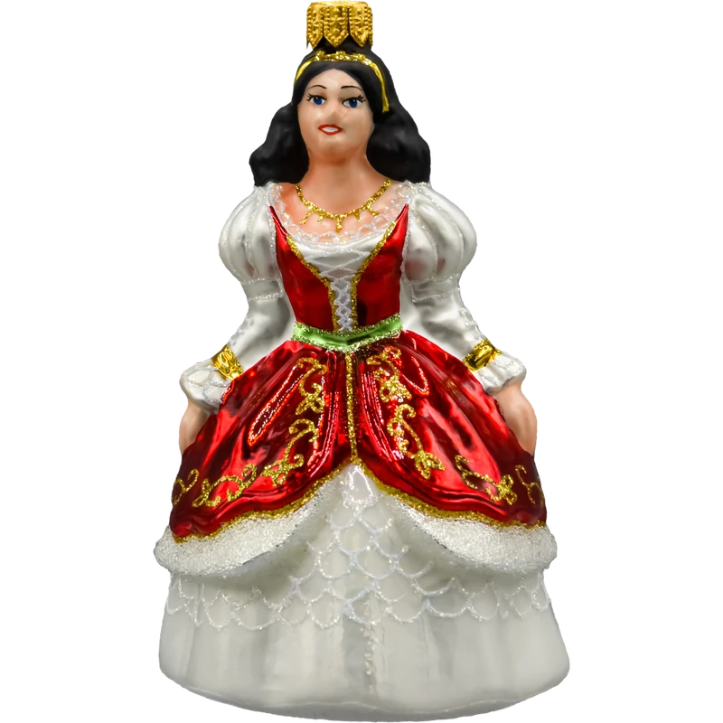 Ta szklana bombka w kształcie królewny to wyjątkowa ozdoba choinkowa, która wnosi do świątecznego wnętrza nutę baśniowej elegancji. Ręcznie malowana figura przedstawia postać królowej lub księżniczki w zachwycającej sukni balowej – czerwonej z bogato zdobionym, złotym ornamentem i kontrastującą białą spódnicą z efektem koronkowego haftu. Delikatne detale, takie jak złota korona, naszyjnik i bufiaste rękawy, dodają bombce wytwornego charakteru.