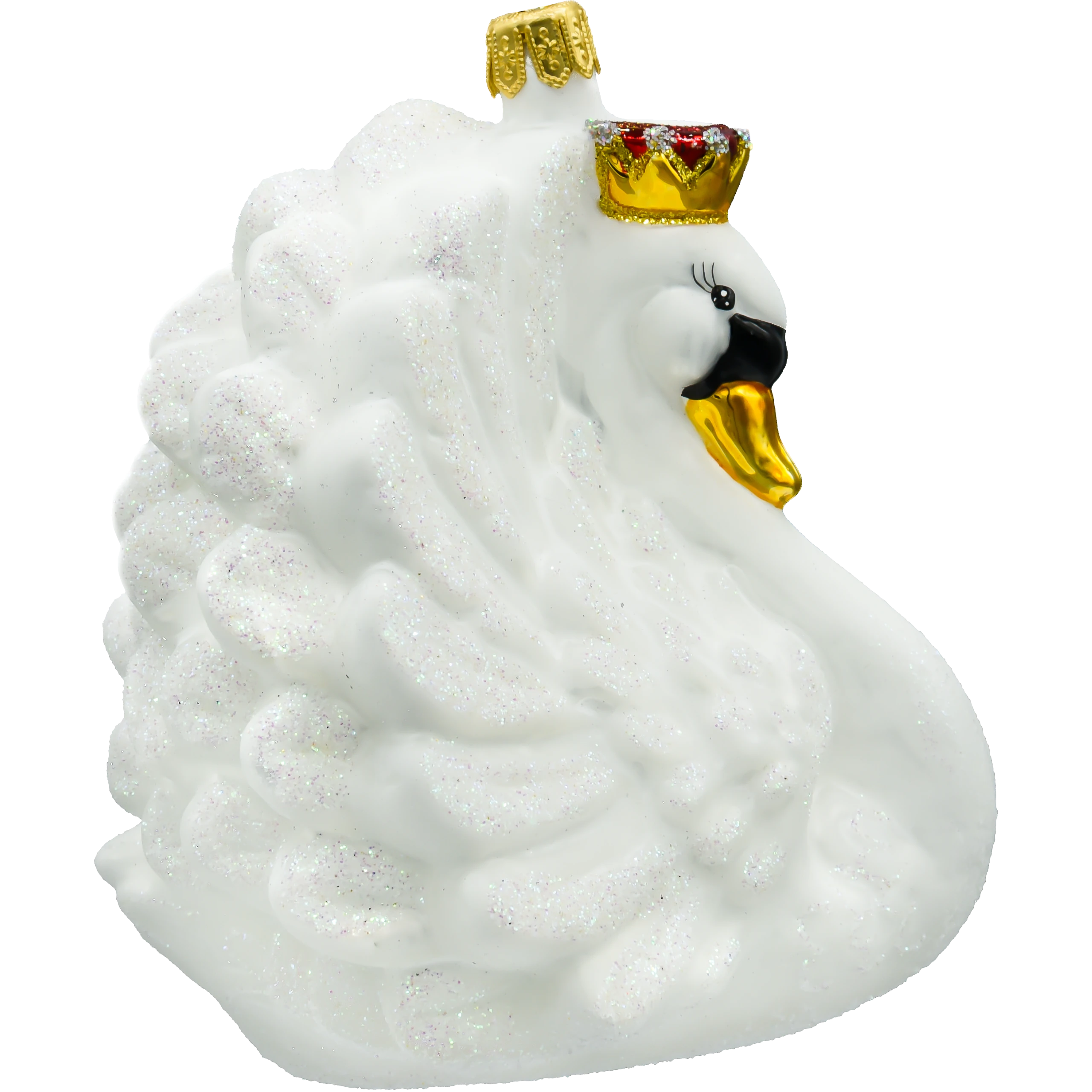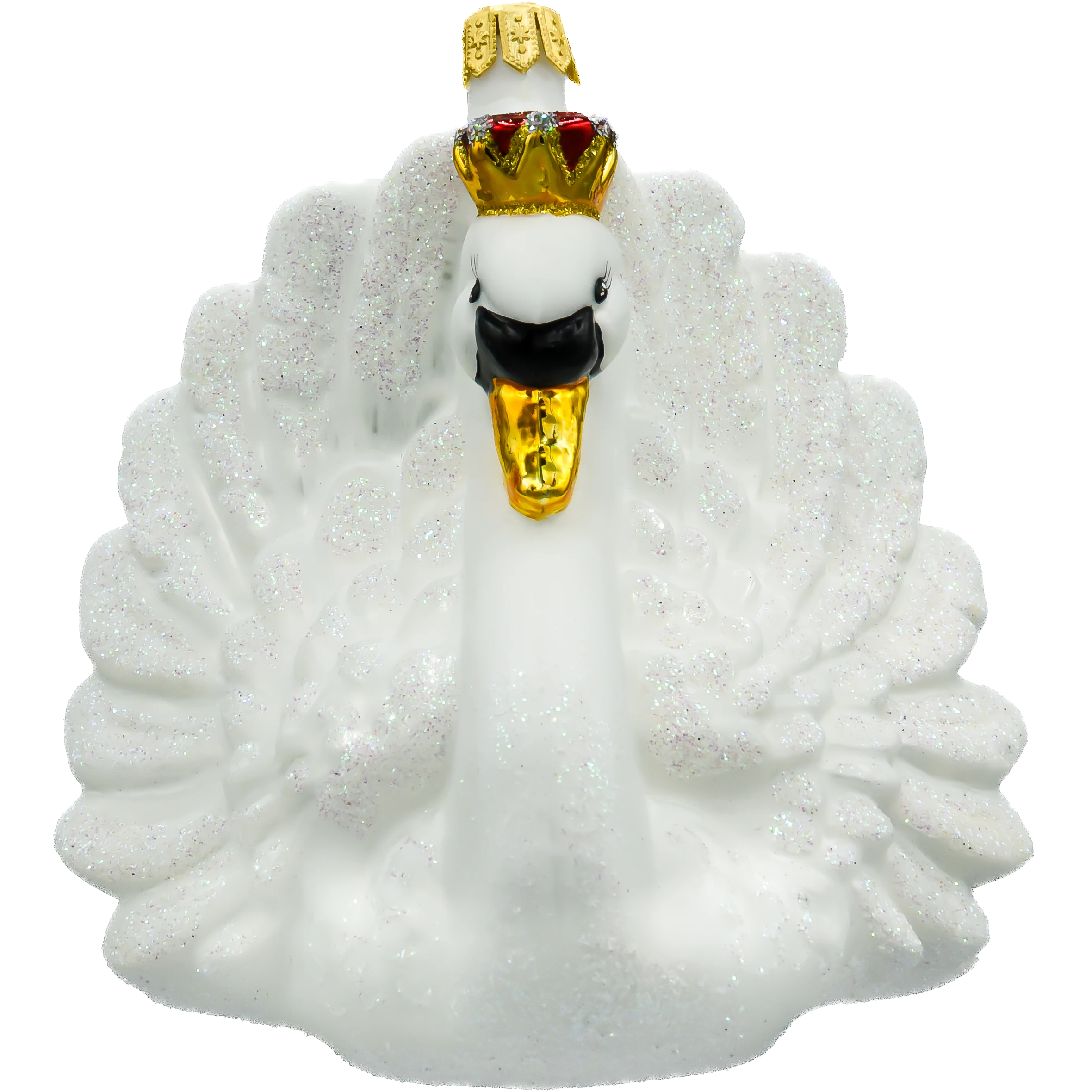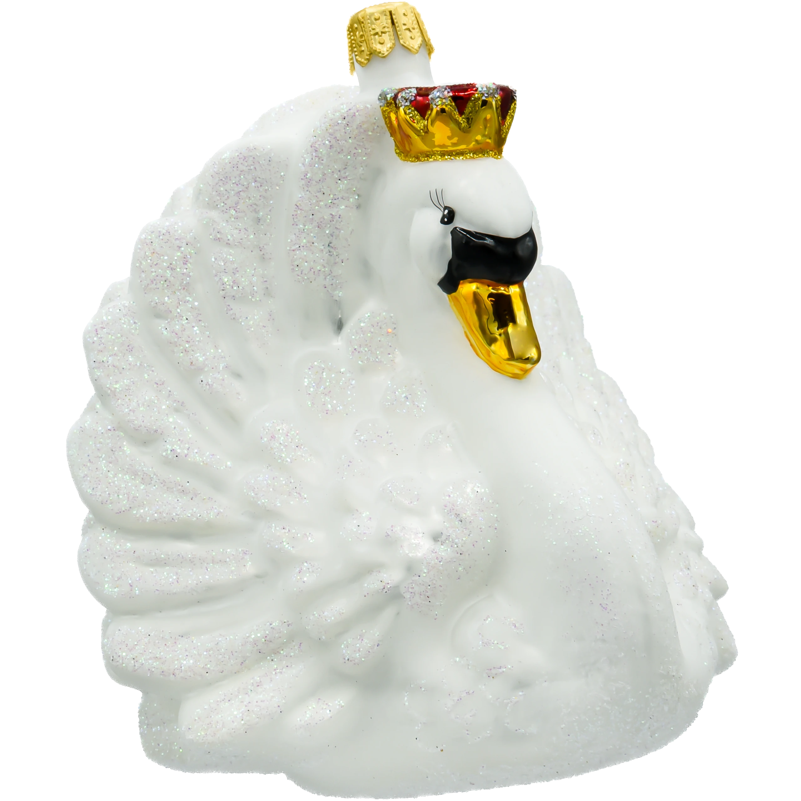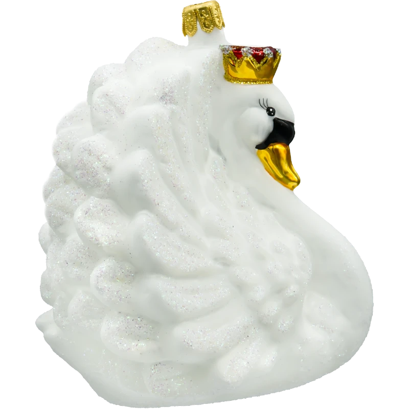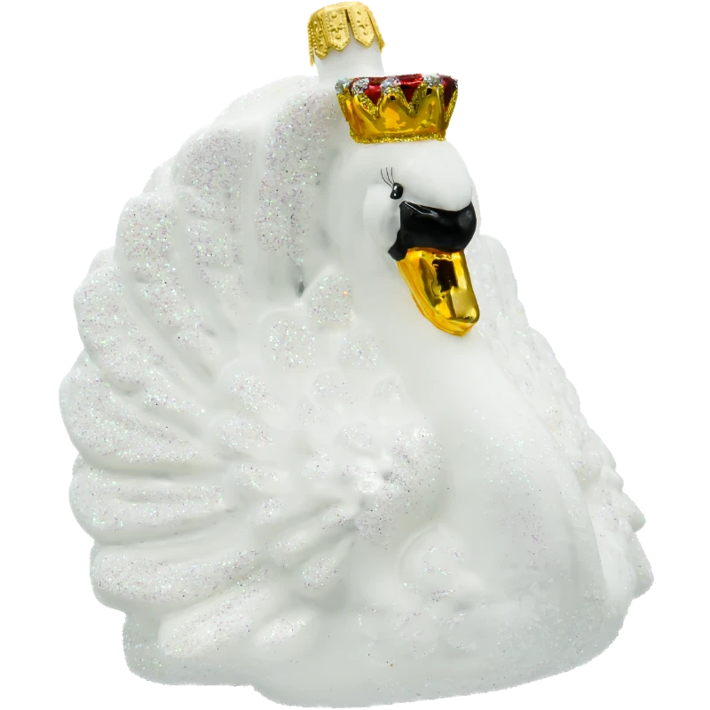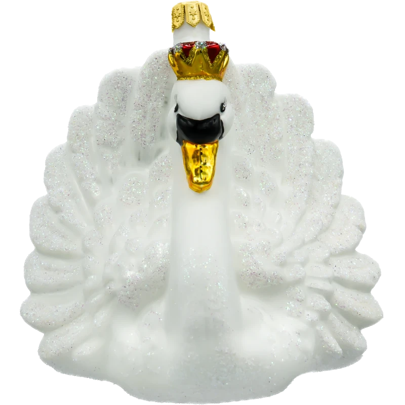 Bombka „Łabędź z koroną” została wykonana z niezwykłą precyzją przez doświadczonych rzemieślników, co czyni ją prawdziwym dziełem sztuki. Każdy element, od starannie odwzorowanych piór pokrytych delikatnym brokatem, po szczegółowo zdobioną koronę, został wykonany ręcznie, co nadaje bombce unikalny charakter i niepowtarzalność. Biały kolor łabędzia symbolizuje czystość i elegancję, a jego subtelnie rozłożone skrzydła tworzą wrażenie lekkości i gracji. Brokatowe akcenty i połyskująca korona sprawiają, że bombka pięknie odbija światło, dodając choinkowej aranżacji blasku i wyrafinowania.