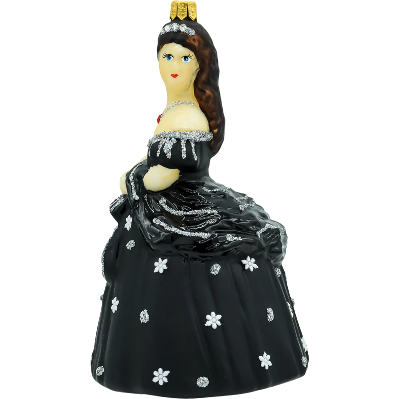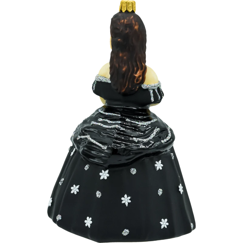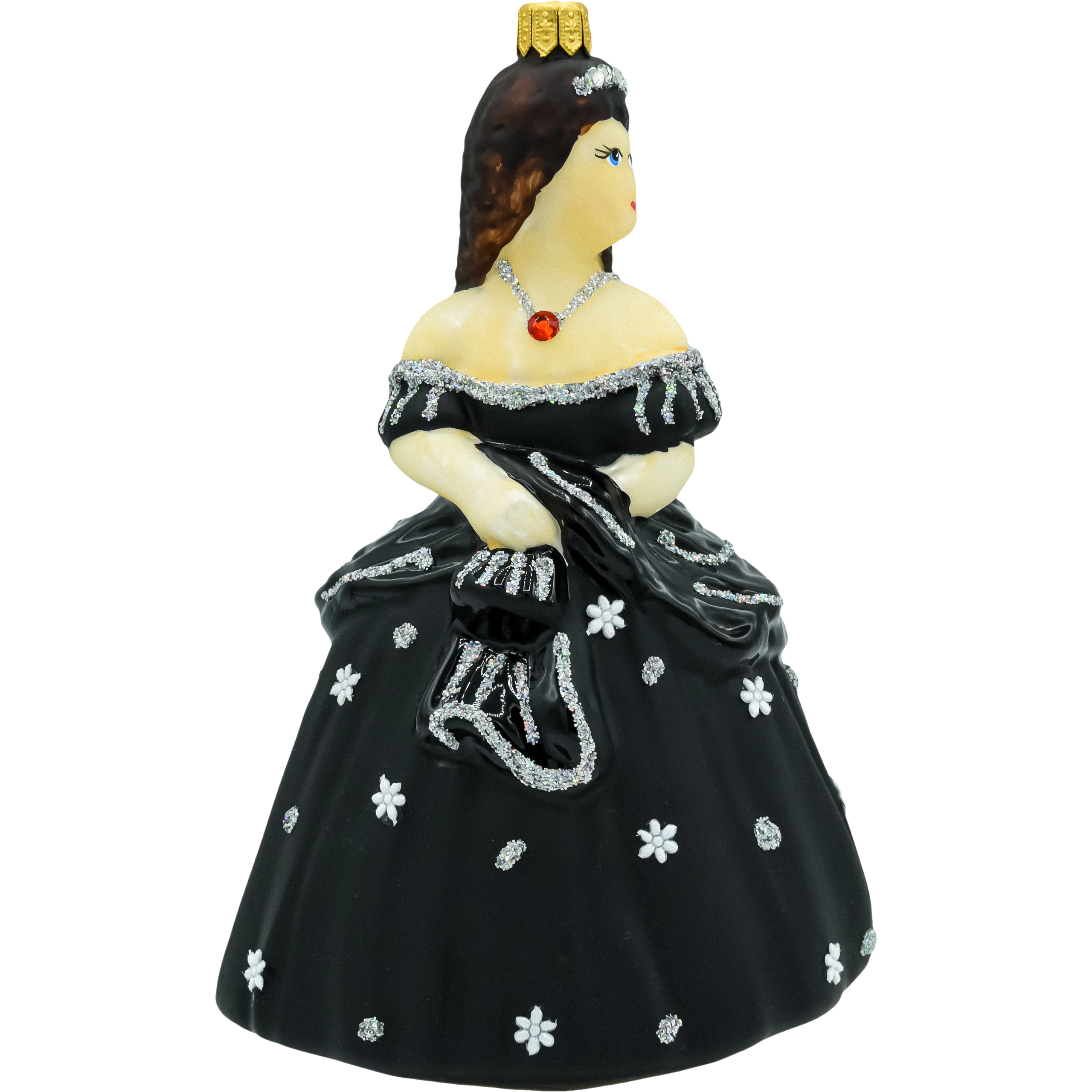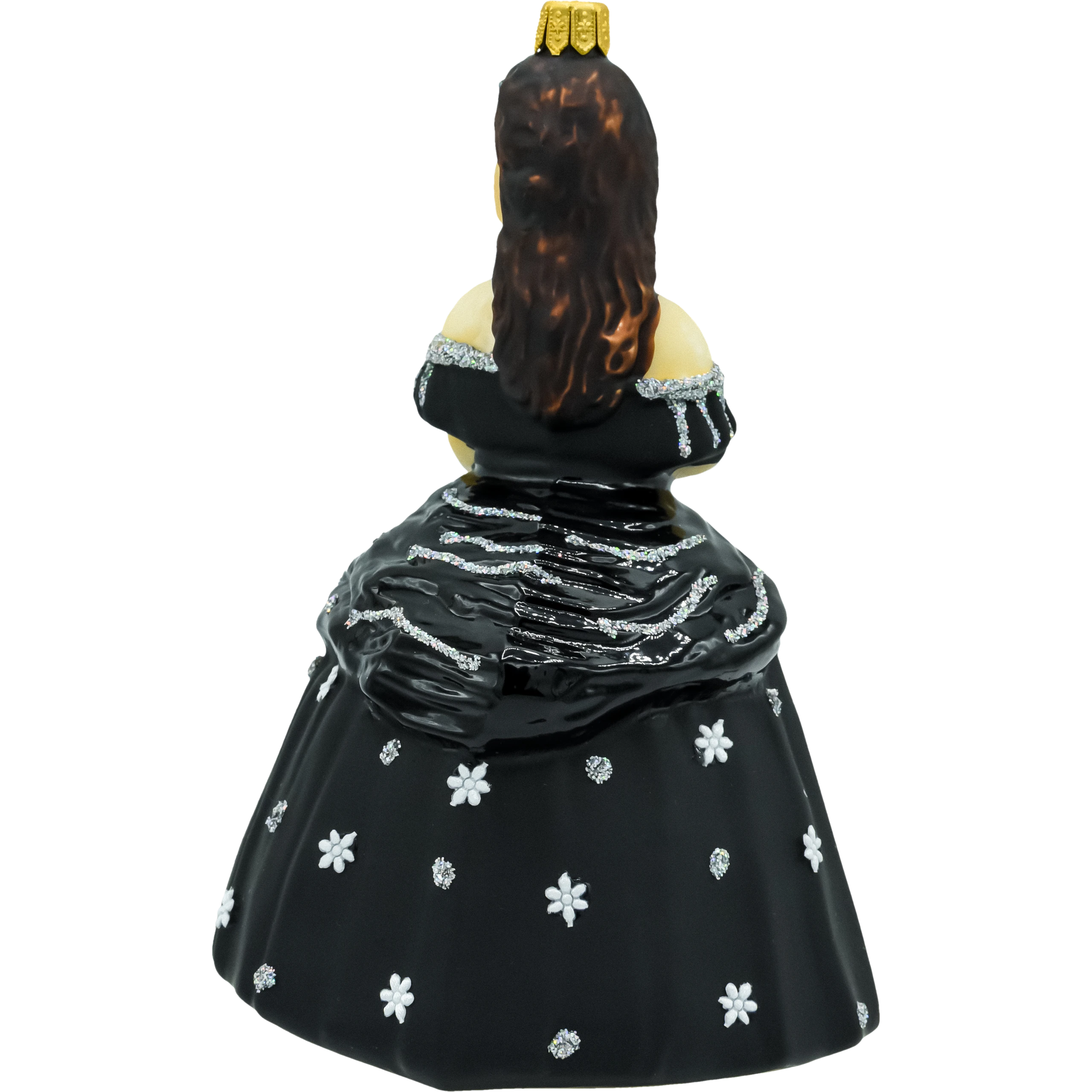 Szklana bombka figuratywna „Sisi” — dama w czarnej sukni ze srebrnym brokatem i czerwonym kamieniem na naszyjniku. Ręcznie malowana ozdoba choinkowa w stylu glamour, idealna jako prezent i do kolekcji premium. Świąteczna bombka, która doda choince klasy wiedeńskich salonów.