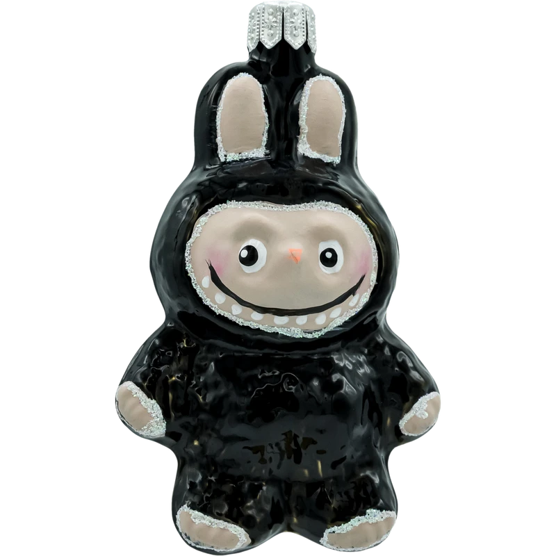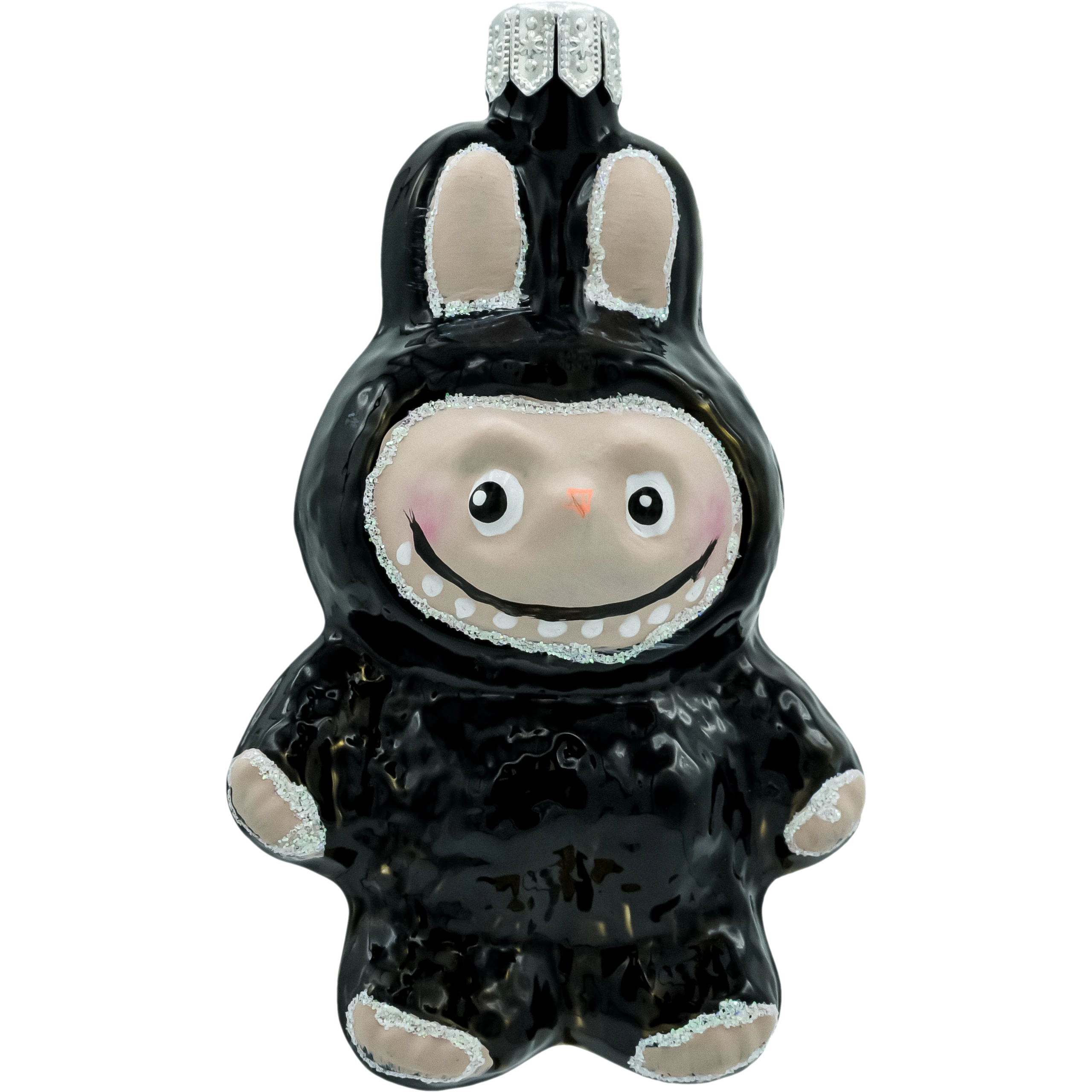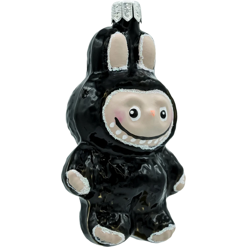Ręcznie dmuchana i malowana bombka szklana inspirowana Labubu – urocza figurka w czarnym kostiumie z brokatowymi detalami. Lekka, połyskująca i bardzo dekoracyjna, idealna jako ozdoba choinkowa lub prezent świąteczny dla fanów wyjątkowych, kolekcjonerskich bombek.