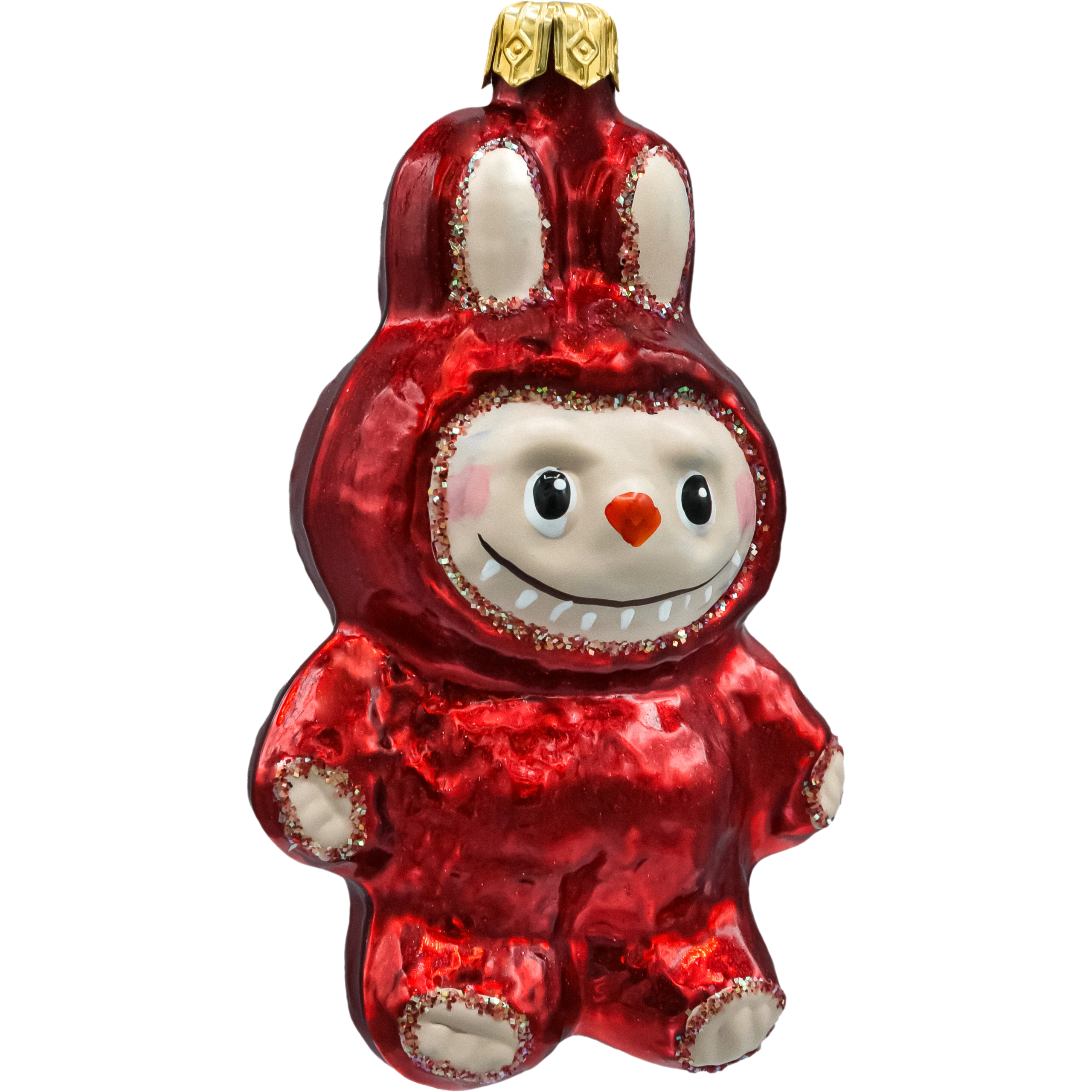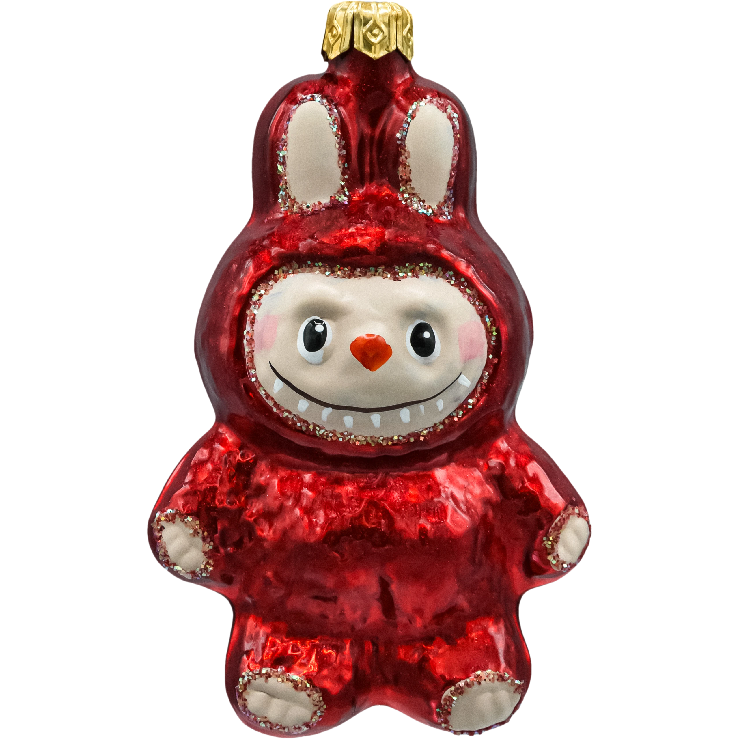 Ręcznie malowana szklana bombka choinkowa w formie czerwonego króliczka inspirowanego Labubu. Lśniące szkło, brokatowe detale i złota koronka czynią z niej kolekcjonerską bombkę figurkę, która doda uroku każdej choince i sprawdzi się jako wyjątkowy prezent świąteczny. Idealna do nowoczesnych i klasycznych aranżacji.